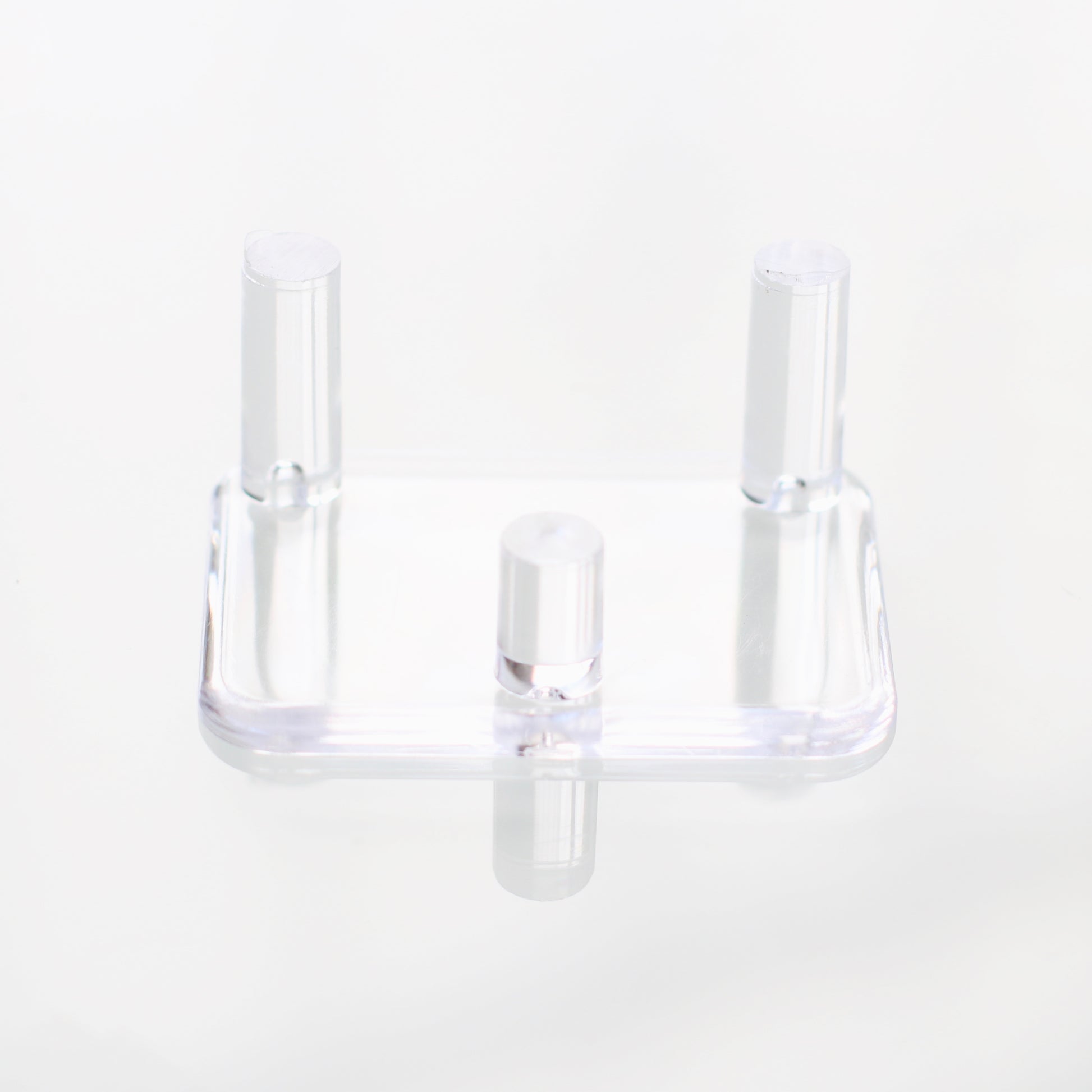 Clear acrylic mineral specimen display stand for crystals, minerals, fossils, geodes and more. Versatile 3 prong design fits a wide variety of shapes and sizes, best for miniature to small cabinet mineral specimens. One of our most used acrylic riser display stands for mineral specimens at gem shows.