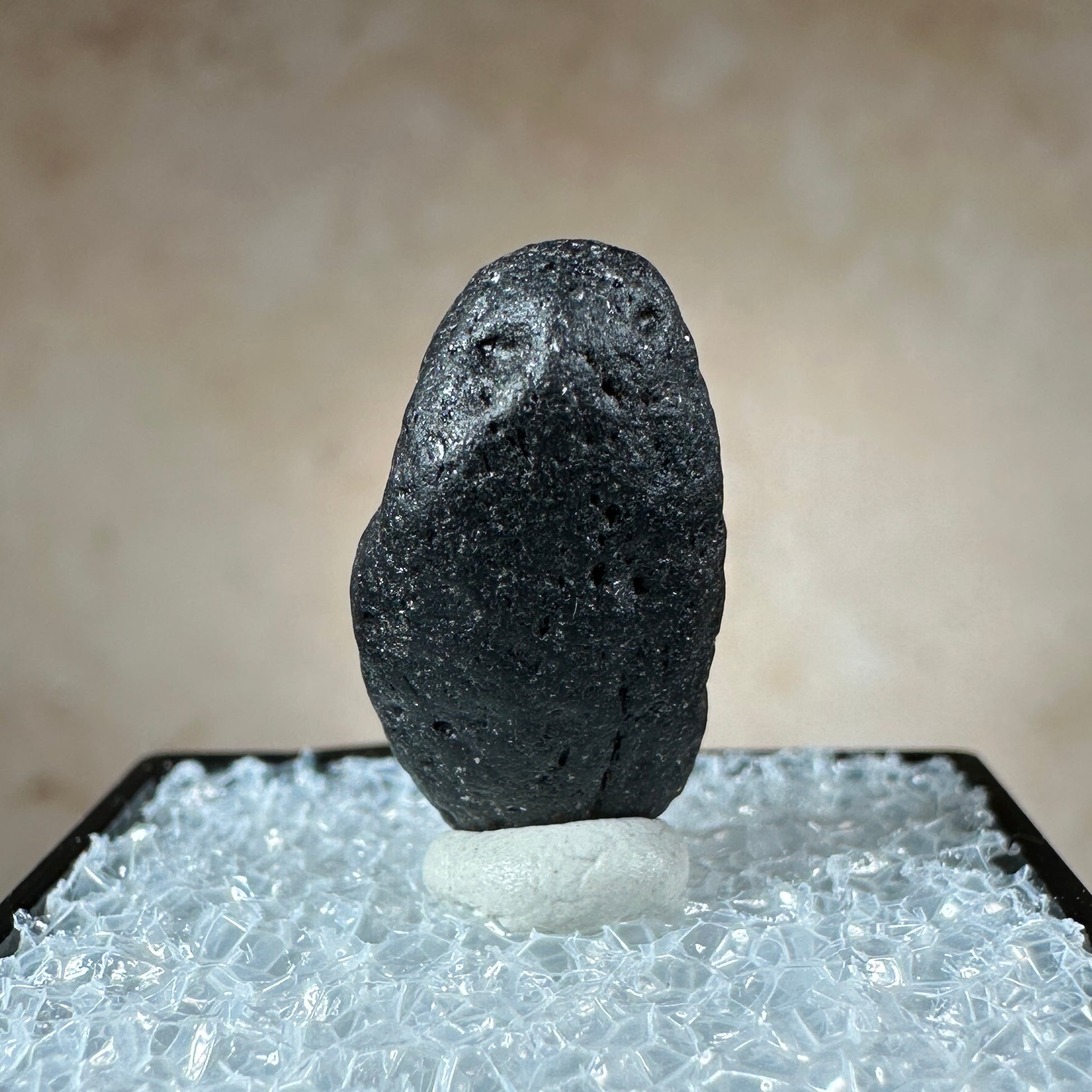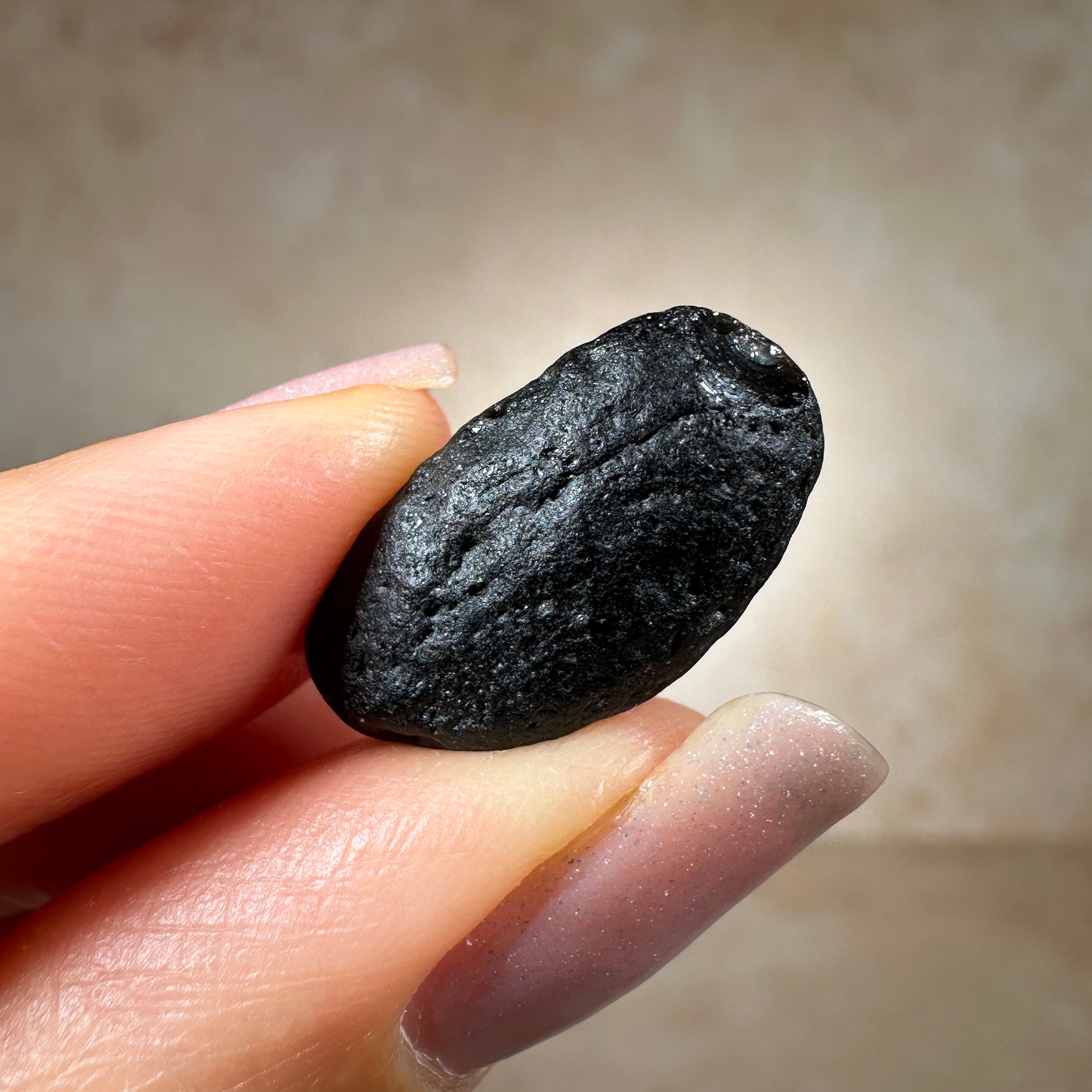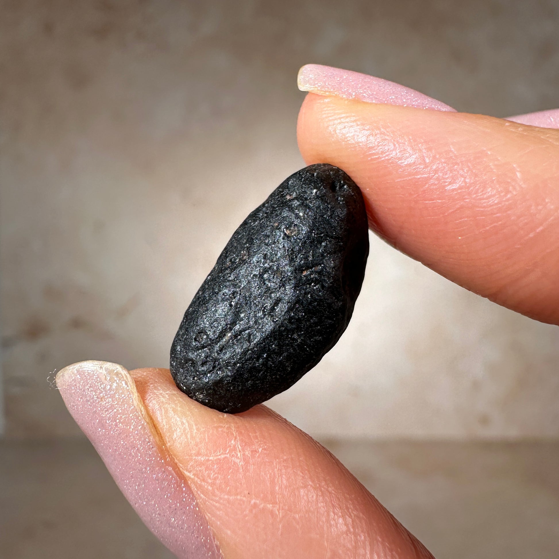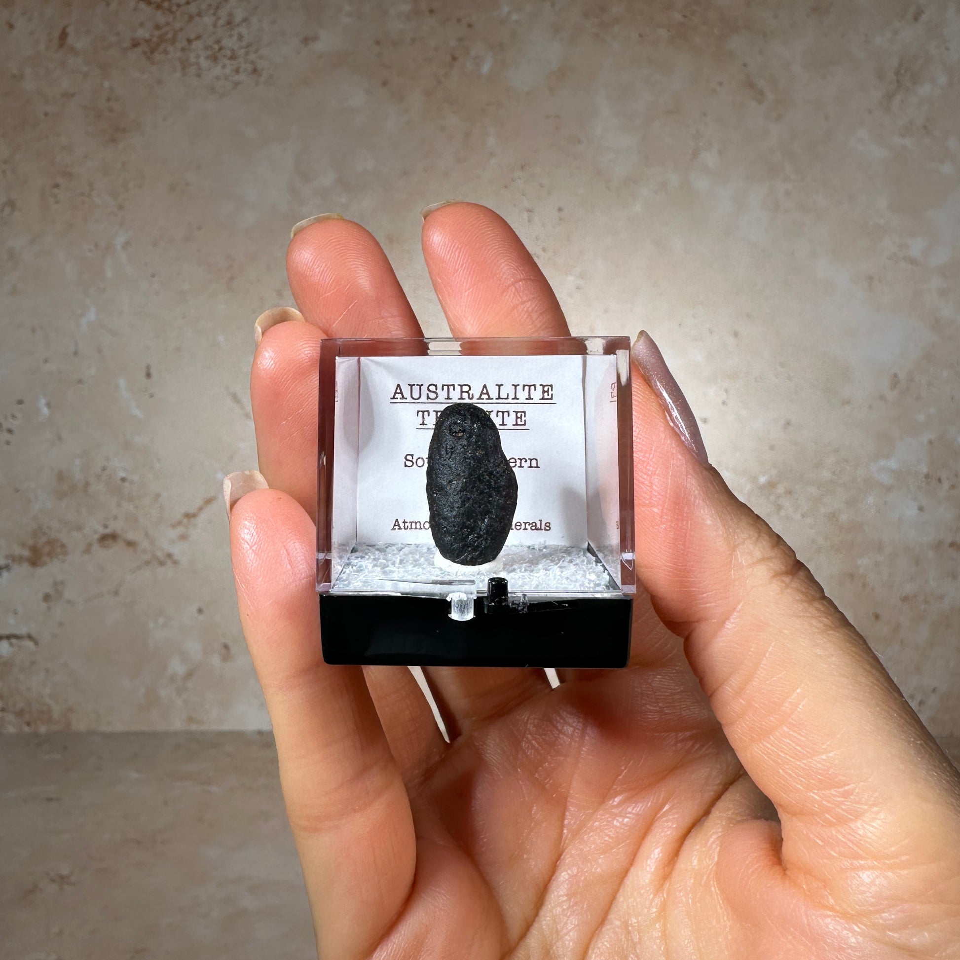 Australites are tektites, a natural glass formed during a meteorite impact. Australites formed about 700,000-800,000 years ago when a massive meteorite impacted Earth. The impact glass was blasted high into the upper atmosphere, where it cooled and began its descent back to Earth. As the tektites re-entered our atmosphere, traveling at high velocity, aero-dynamic ablation occurred, causing the outer surface of the tektite to melt away, leaving the center intact. These small button-shaped Australites are the heart of Australian tektites.