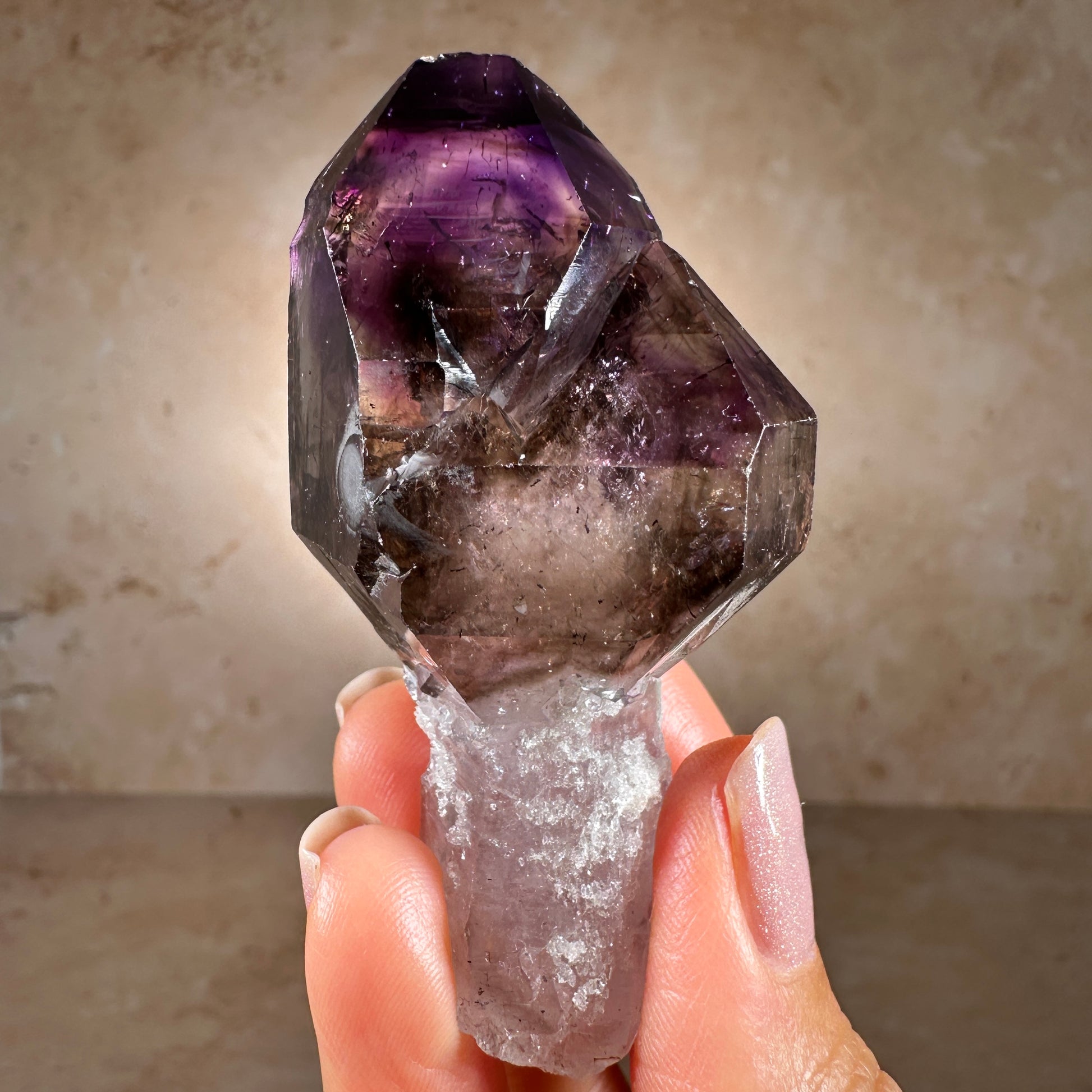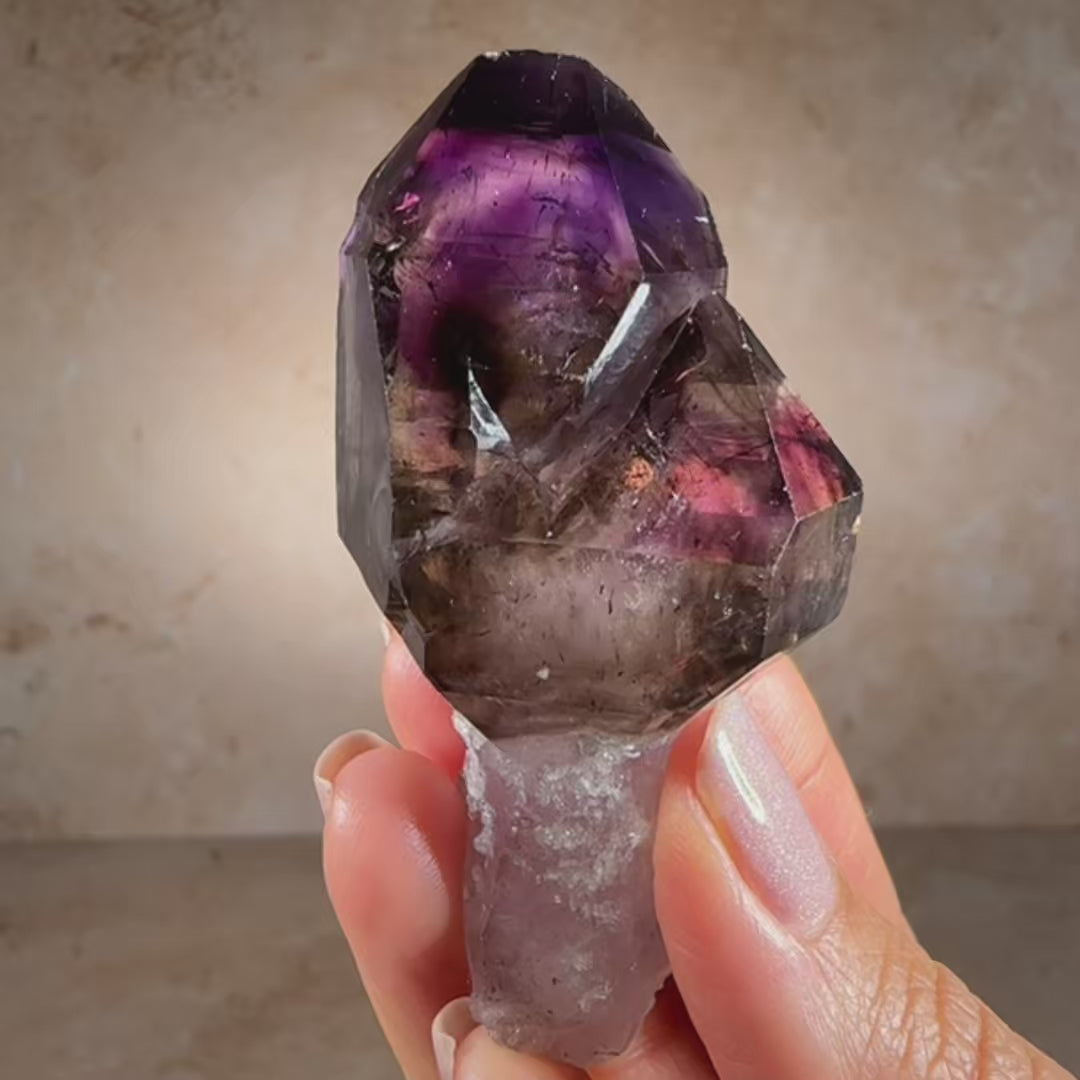 Gorgeous Chibuku Amethyst Scepter, two crystal terminations with multidimensional color-zoning, on a sparkly druzy encrusted stem, transparent gemmy clarity and glassy luster. Excellent condition, termination has minor nicks, stunning with backlighting. Perfect collector's piece for anyone who connects with the earthy beauty of African Amethyst specimens.