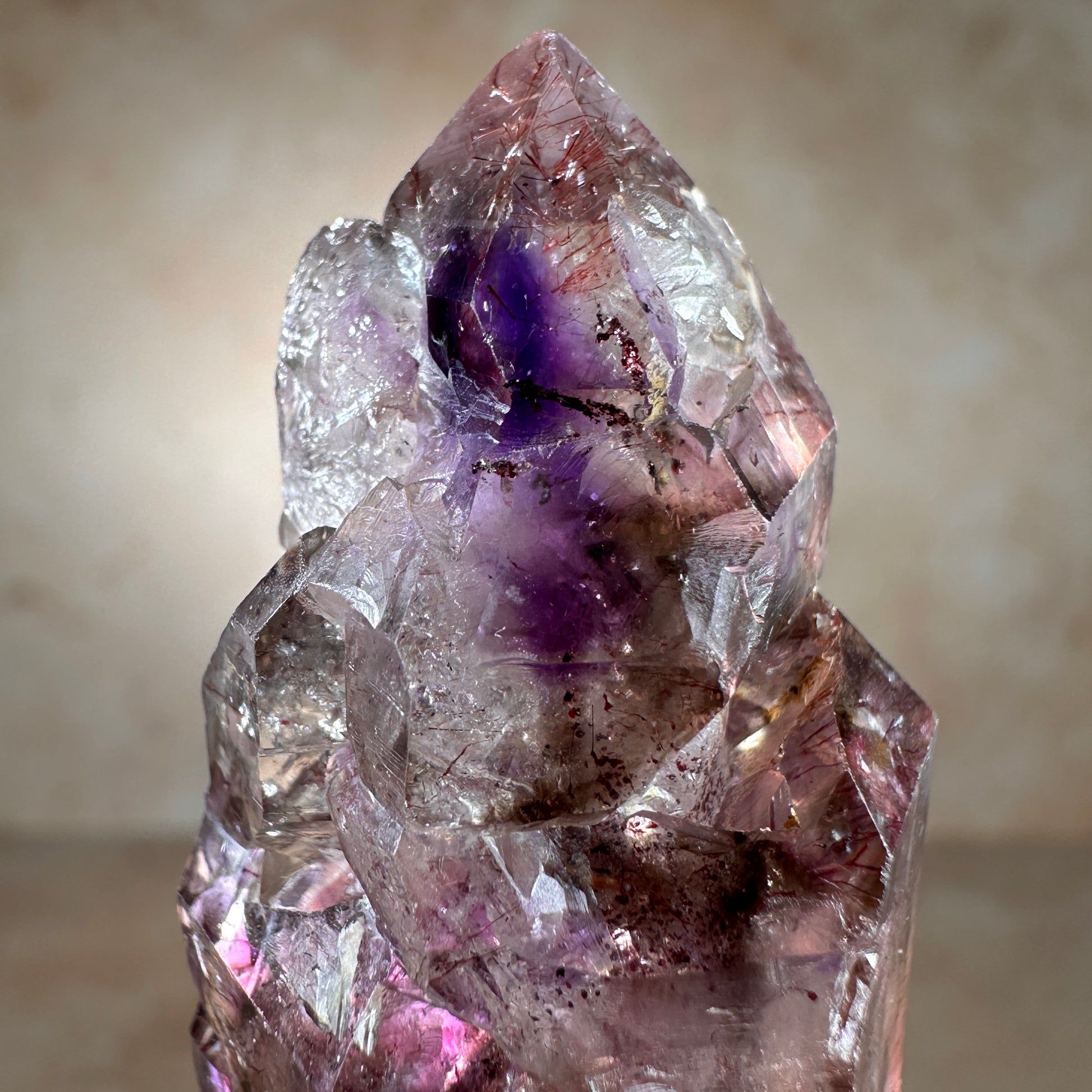 Gorgeous double-terminated Chibuku Amethyst Scepter. Stepped crystal structure with multidimensional color-zoning and glittery red Hematite inclusions. Transparent gemmy clarity and glassy luster. Excellent condition, minor nick at bottom termination, stunning with backlighting. Perfect collector's piece for anyone who connects with the earthy beauty of African Amethyst specimens.