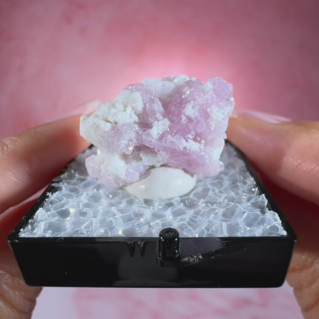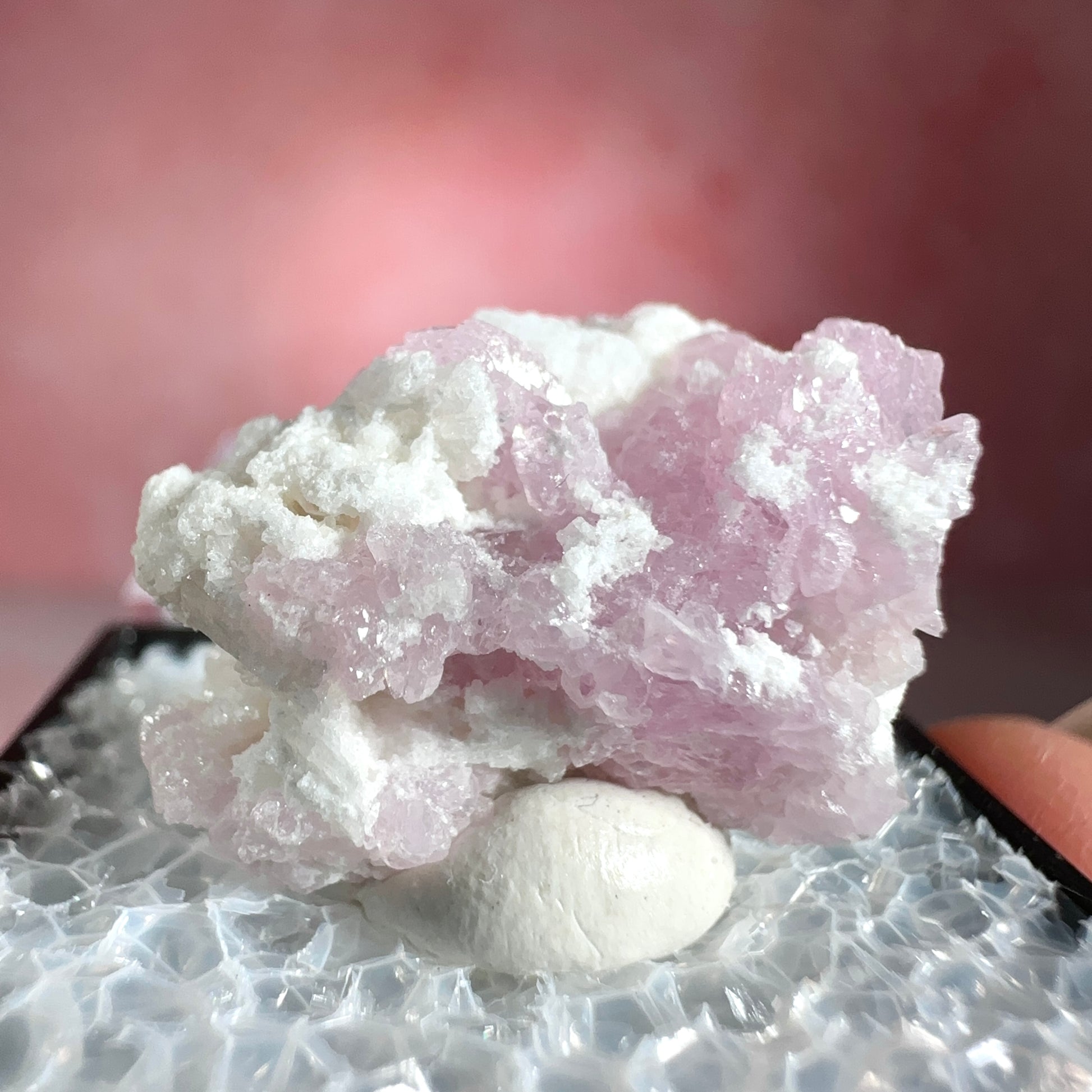 Gorgeous Crystallized Pink Rose Quartz specimen with juicy pink lemonade crystals. Crystallized Rose Quartz specimens are a rare find, occasionally found in very small quantities, only a few places around the world. This piece has sparkling crystals with glassy luster, perched on white Albite matrix. A sweet specimen for Pink Rose Quartz lovers.