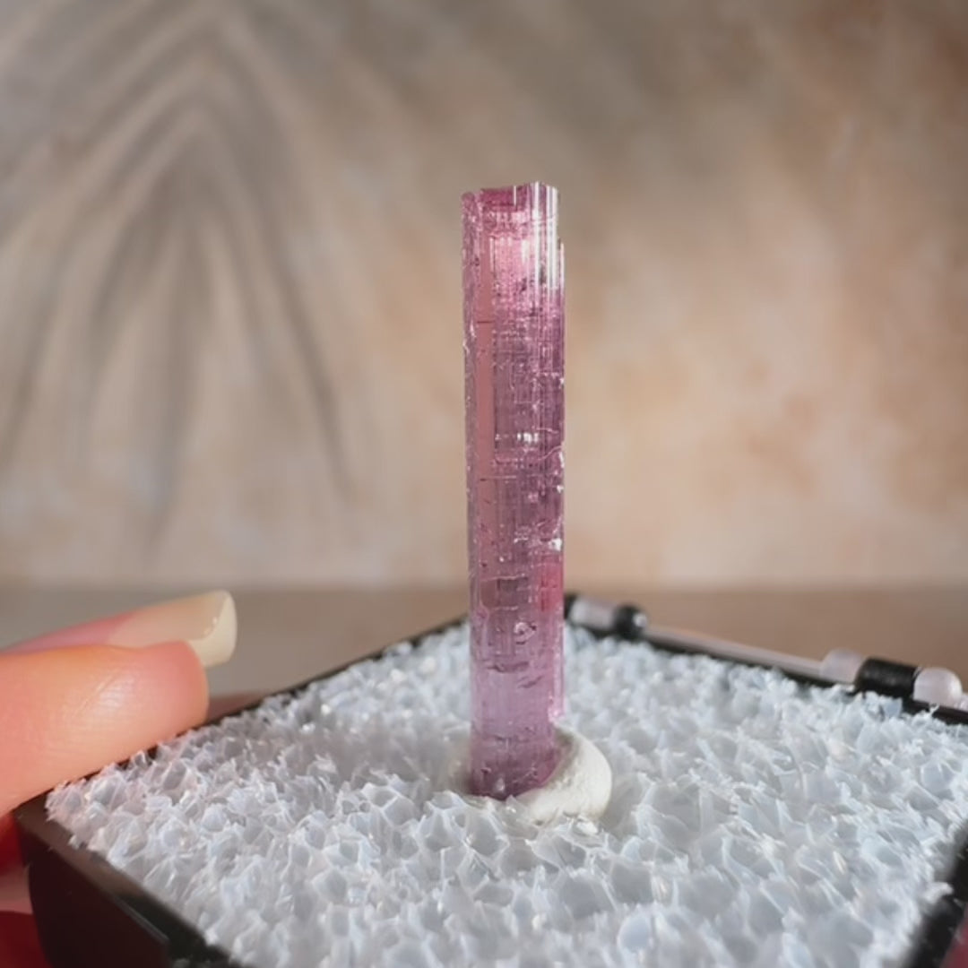 Pink Elbaite (Rubellite) Tourmaline crystal, juicy strawberry pink with gemmy clarity, glassy luster and the top is self-healed. This Tourmaline crystal is from the famous Barra do Salinas locality, it belonged to the late Alvaro Lucio, one of the most well known and accomplished mineral collectors and dealers in Brazil. We were recently able to obtain a small parcel of these delicious Pink Tourmaline crystals from Alvaro Lucio's old stock that had been stored away for many years.