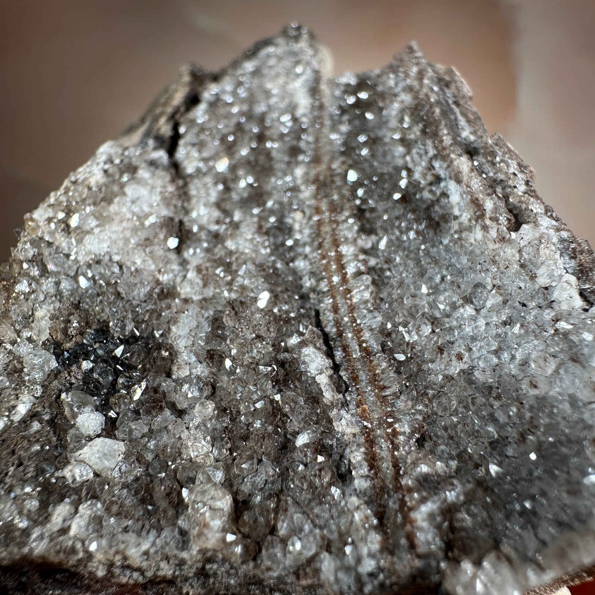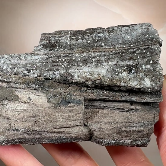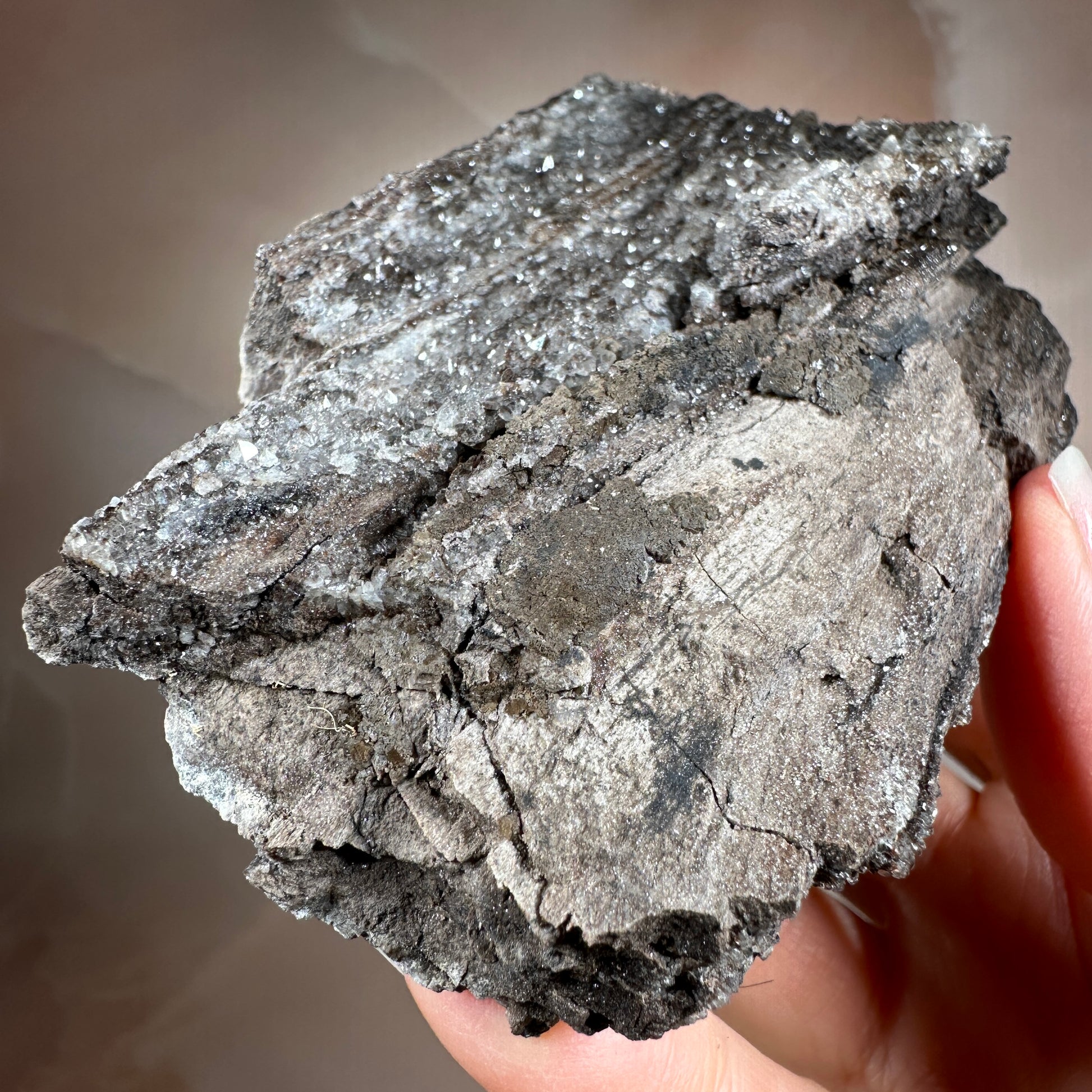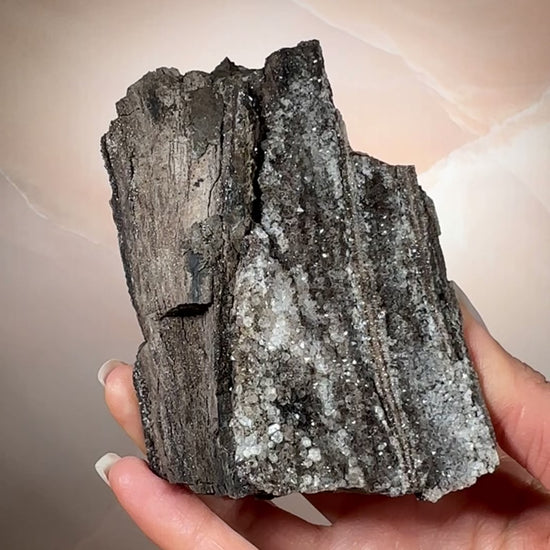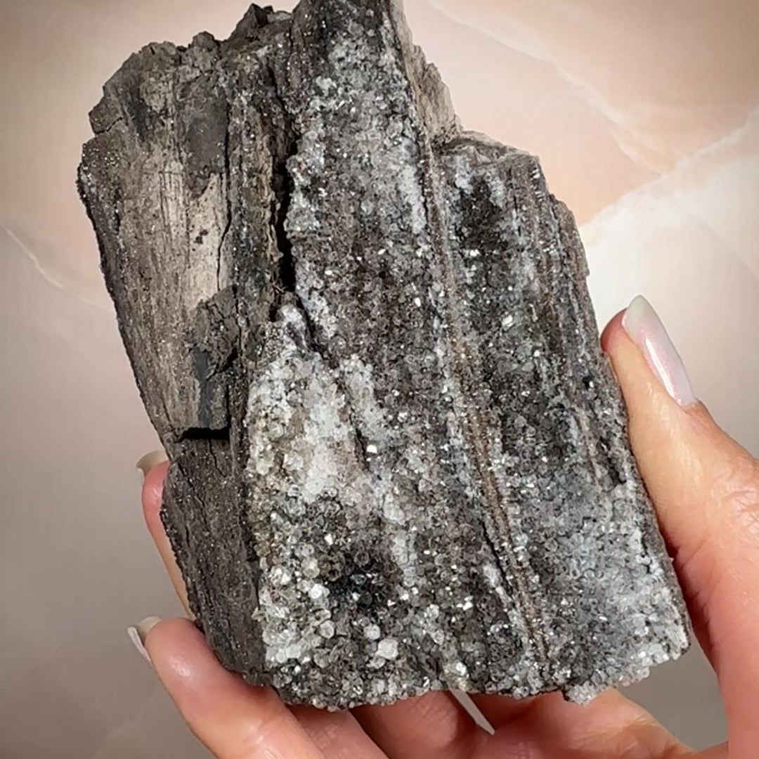 Ancient wood transformed into stone and crowned with smoky quartz druzy, this piece holds a rare harmony of grounding and activation. Its fossil core steadies the energy, while the quartz crystals impart a soft, tingling vibrational lift. Protective and clarifying, it anchors the spirit while subtly awakening the senses.