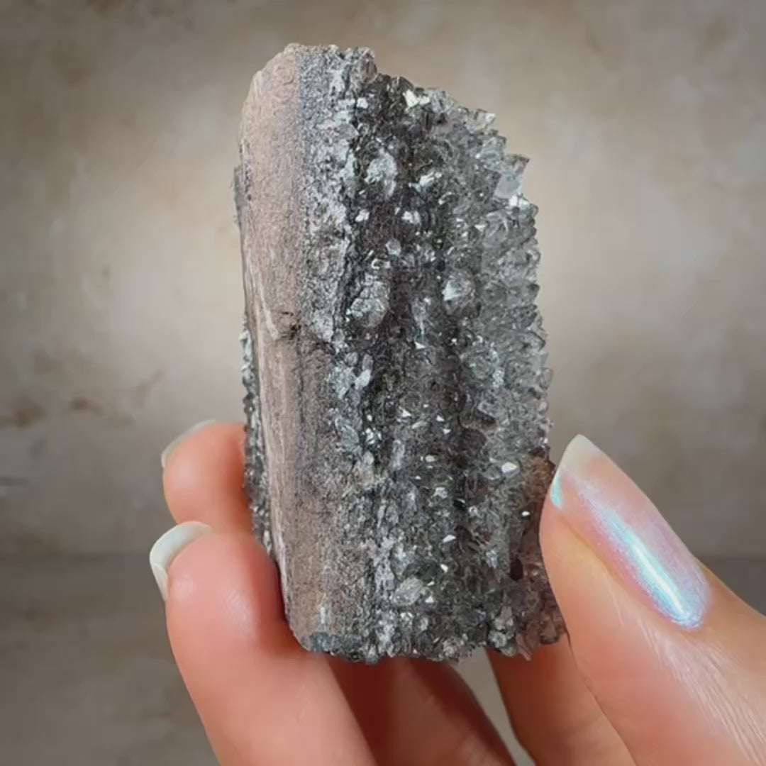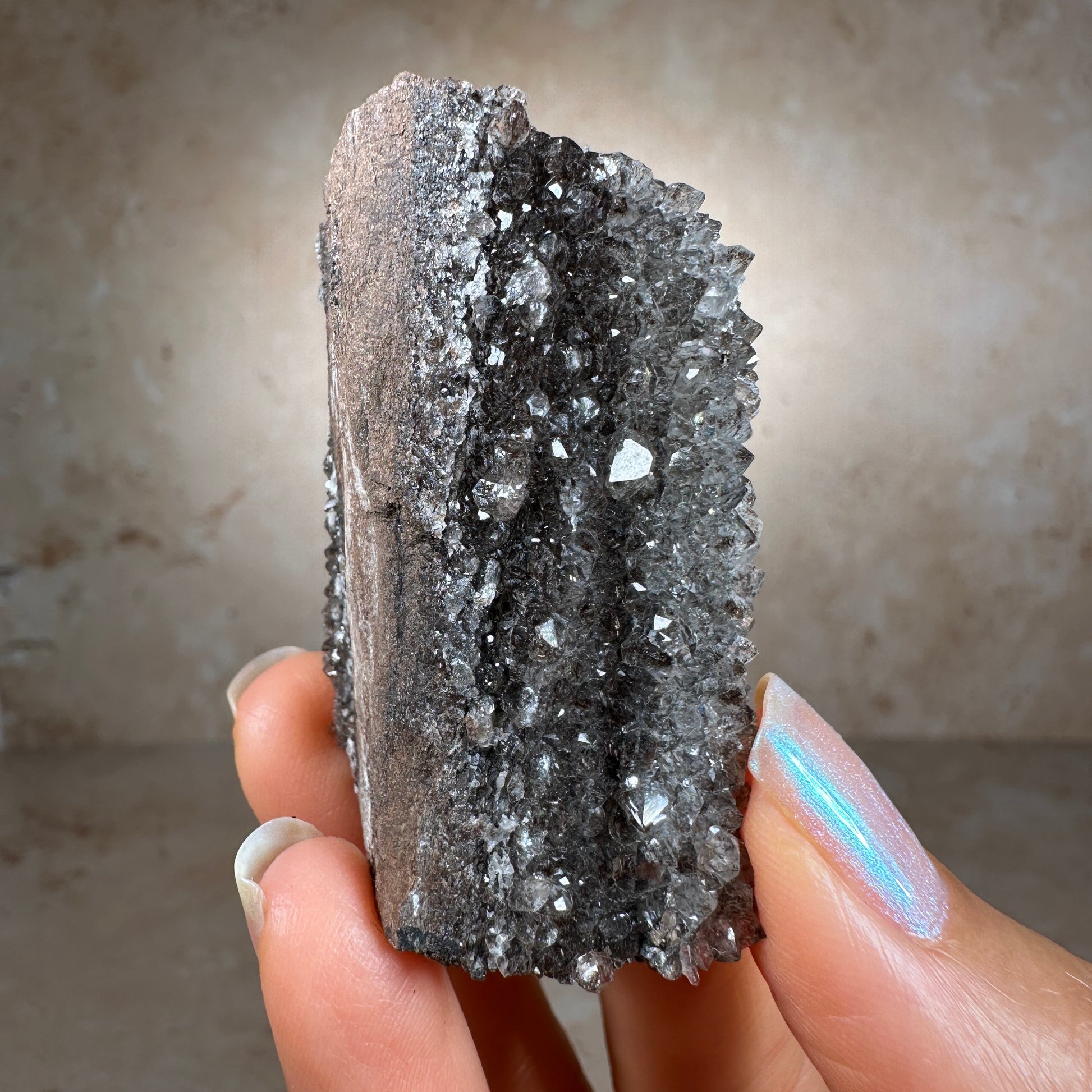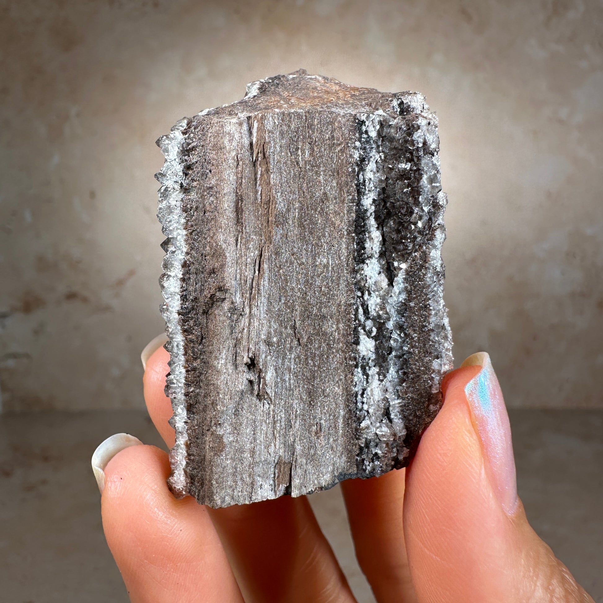 • Features: Rare permineralized fossil wood with smoky druzy quartz crystal encrustation.