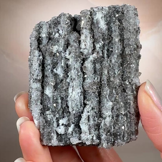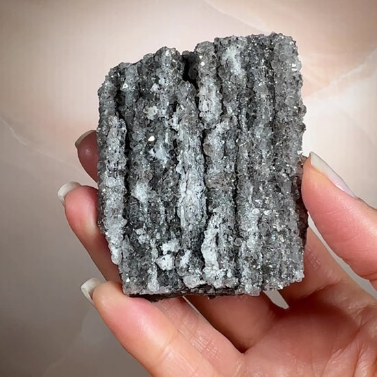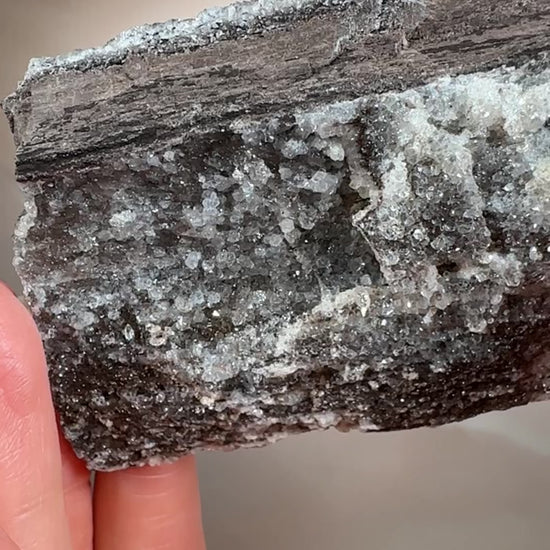 Ancient wood transformed into stone and crowned with smoky quartz druzy, this piece holds a rare harmony of grounding and activation. Its fossil core steadies the energy, while the quartz crystals impart a soft, tingling vibrational lift. Protective and clarifying, it anchors the spirit while subtly awakening the senses.