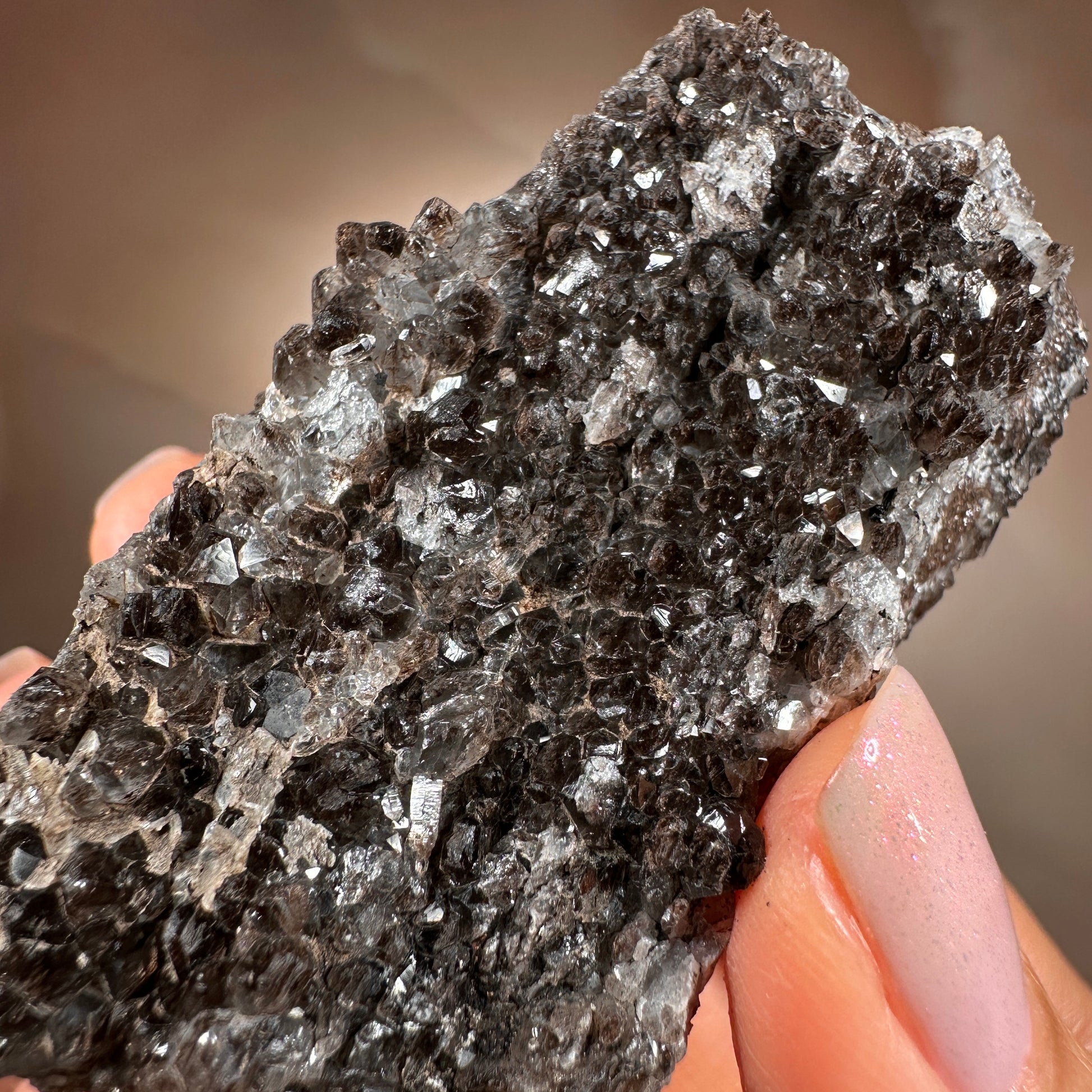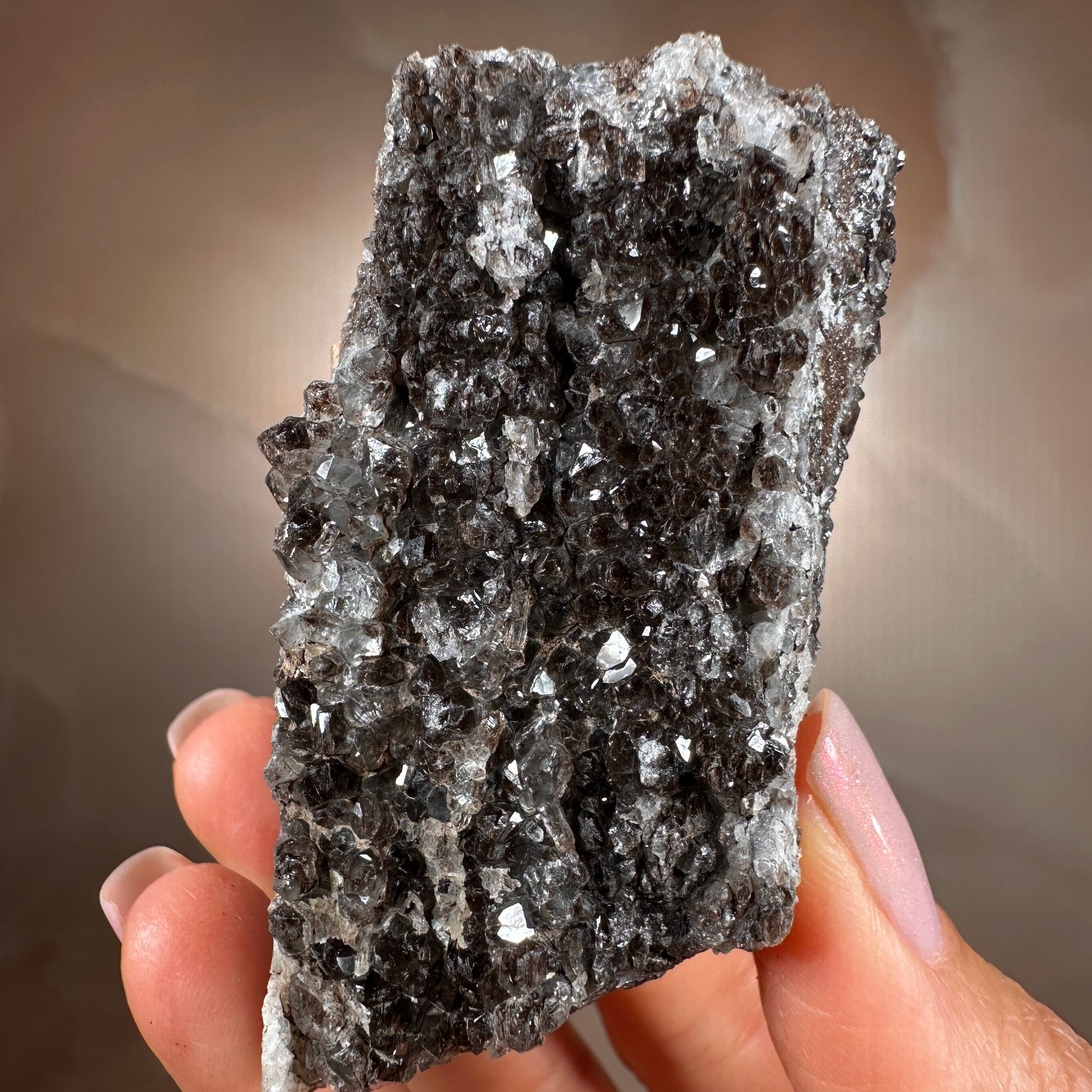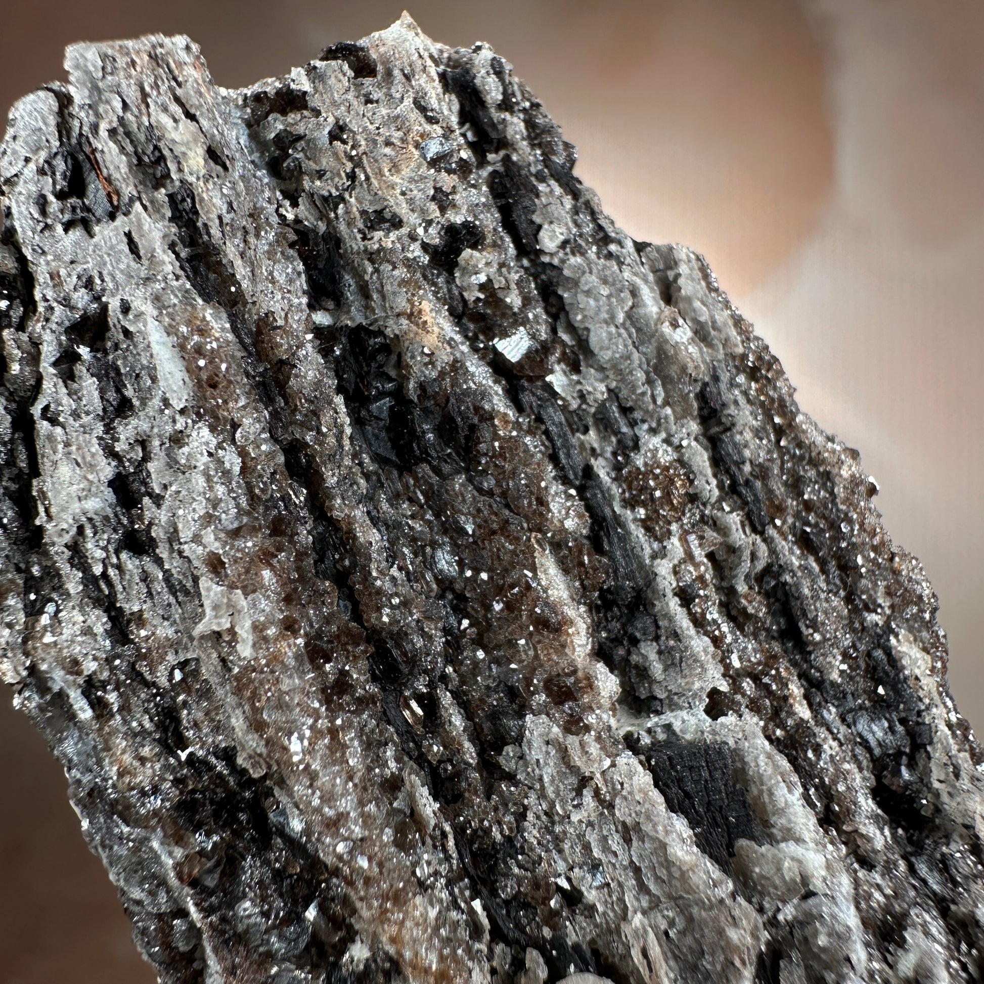 Ancient wood transformed into stone and crowned with smoky quartz druzy, this piece holds a rare harmony of grounding and activation. Its fossil core steadies the energy, while the quartz crystals impart a soft, tingling vibrational lift. Protective and clarifying, it anchors the spirit while subtly awakening the senses.