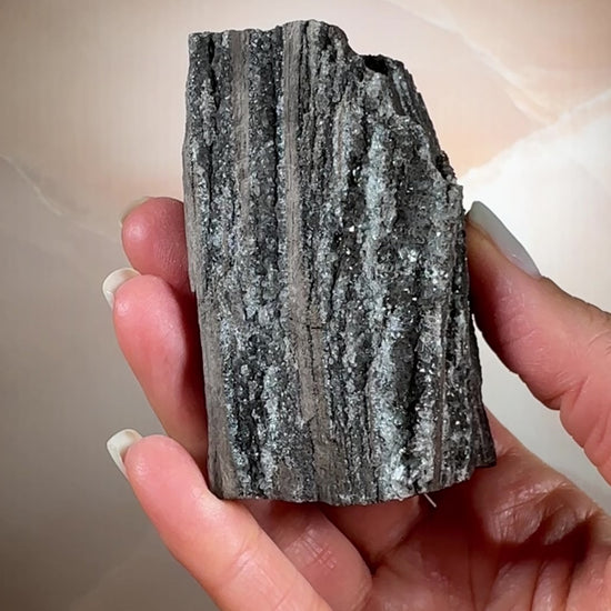 Also known as “Pangea Wood,” this rare 225-million-year-old fossil shimmers with natural smoky quartz crystals. Each piece sparkles like stars across ancient grain, carrying the story of volcanic fire, sweeping floods, and the slow alchemy of fossilization.