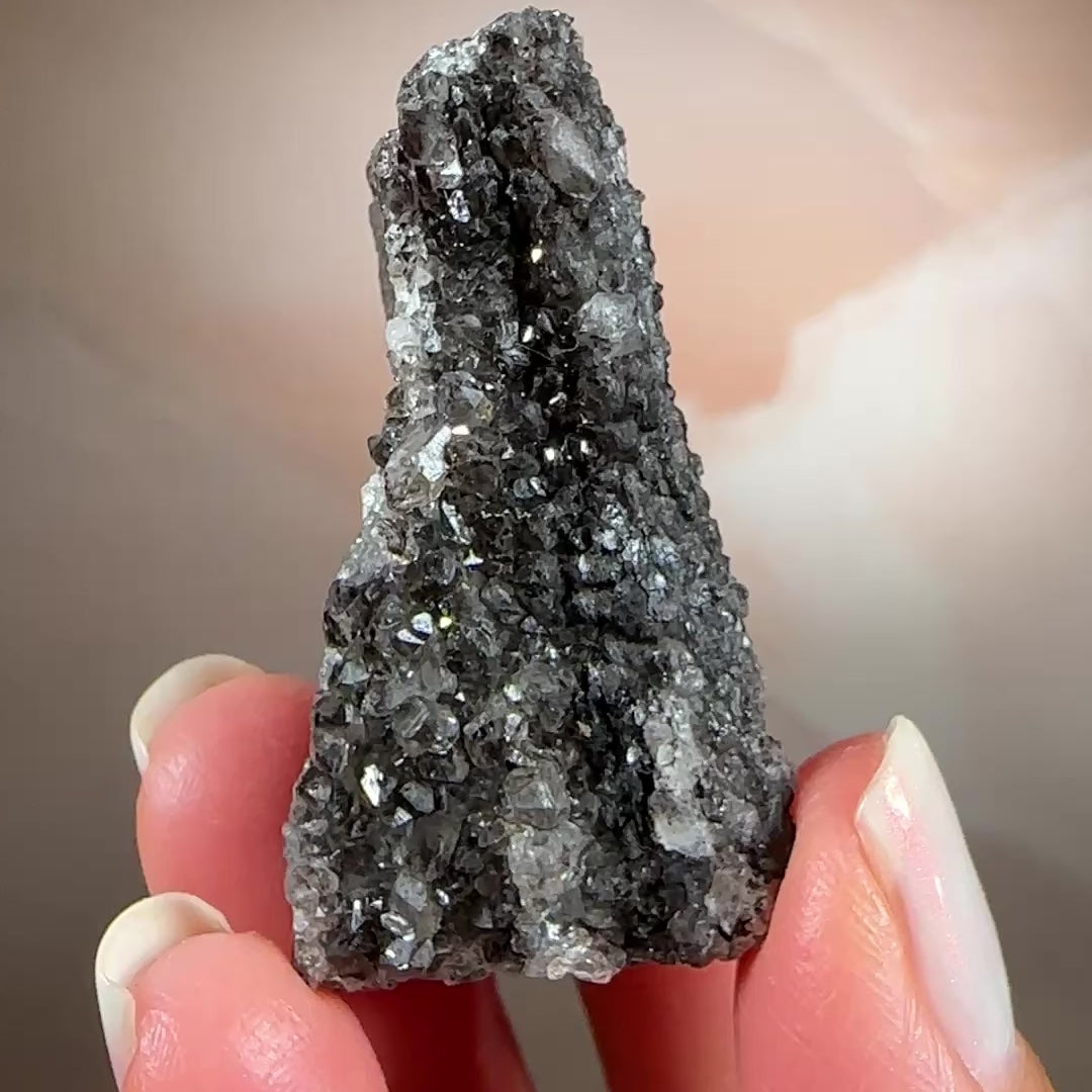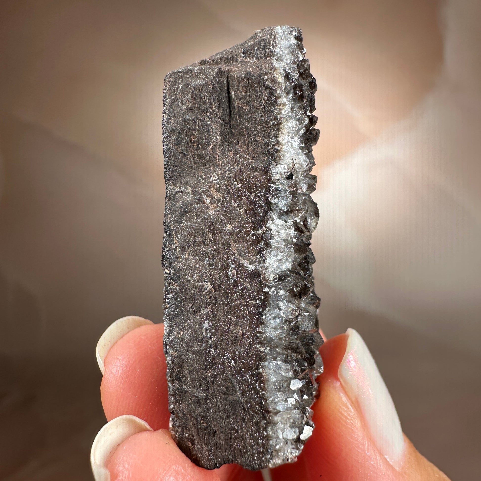 Ancient wood transformed into stone and crowned with smoky quartz druzy, this piece holds a rare harmony of grounding and activation. Its fossil core steadies the energy, while the quartz crystals impart a soft, tingling vibrational lift. Protective and clarifying, it anchors the spirit while subtly awakening the senses.