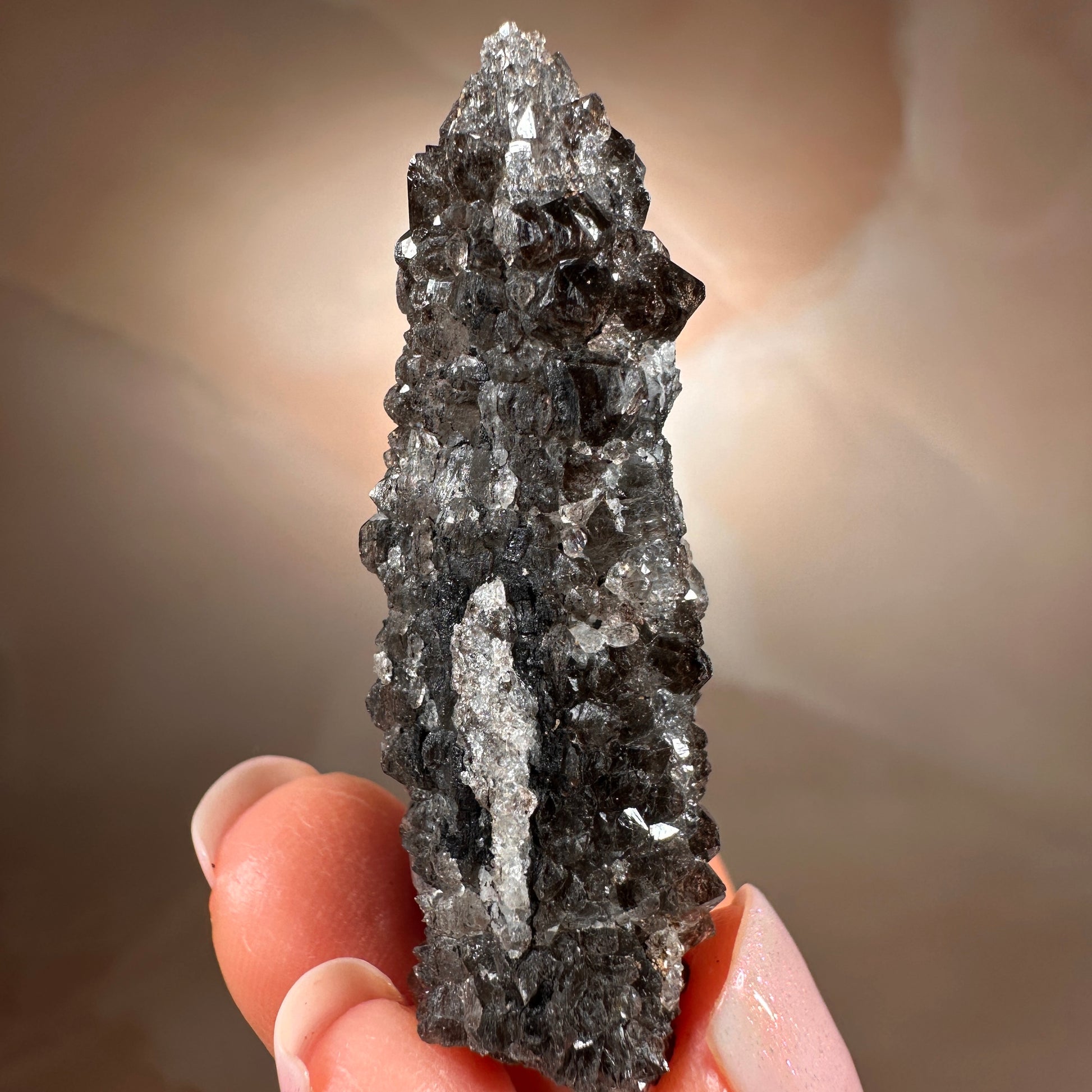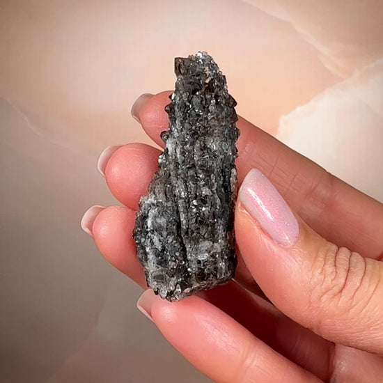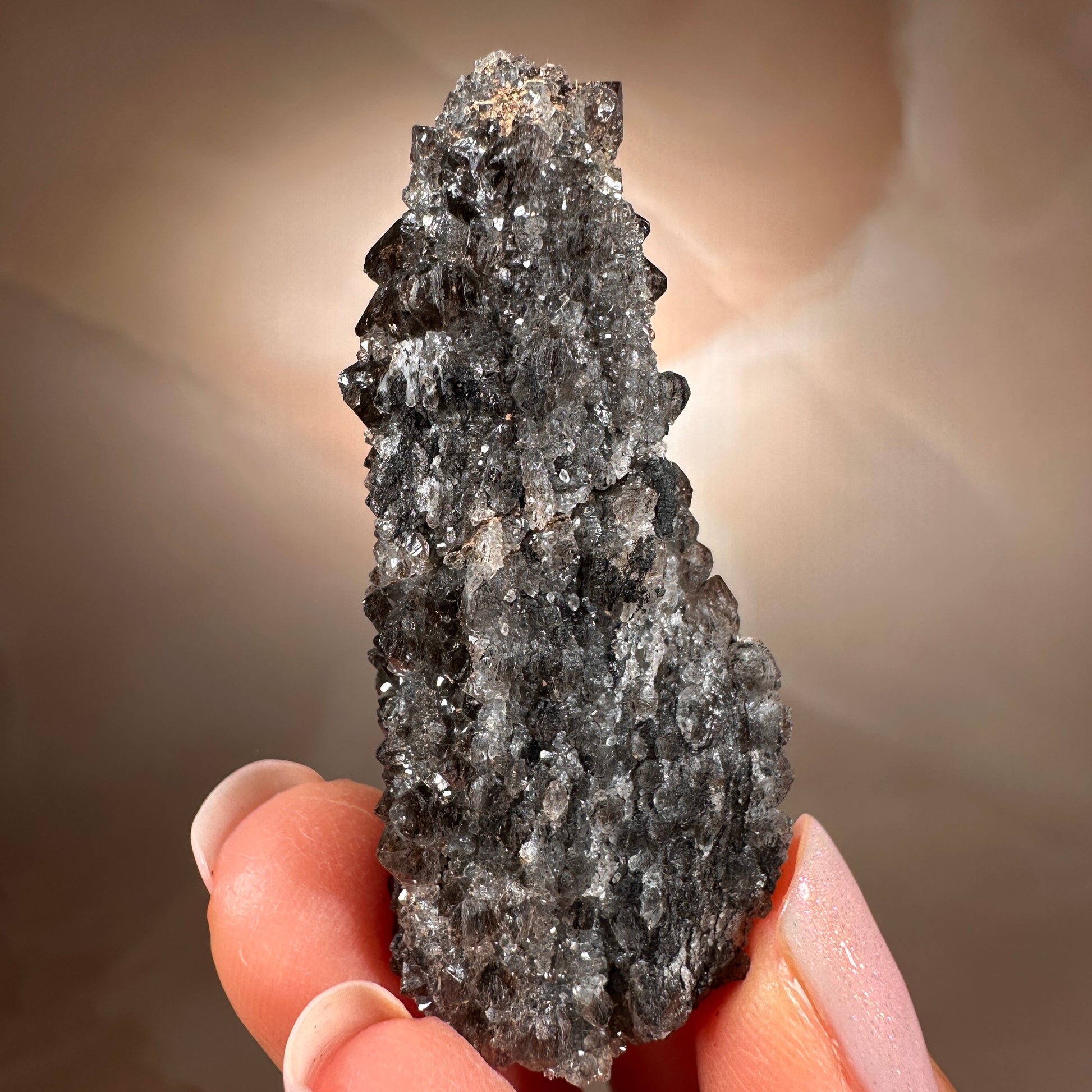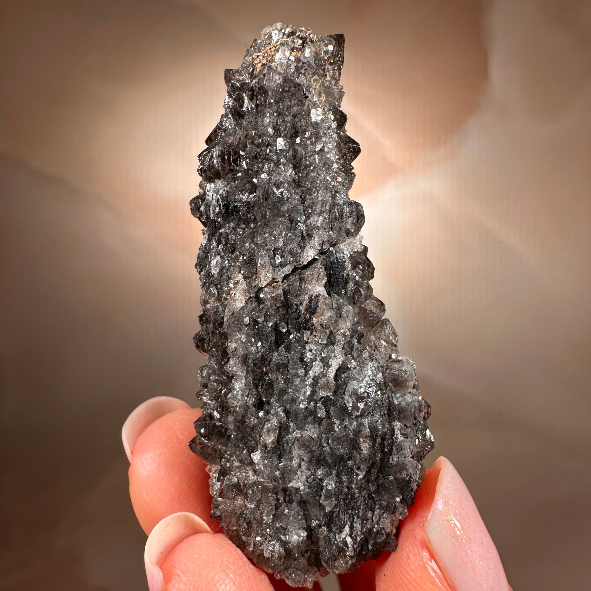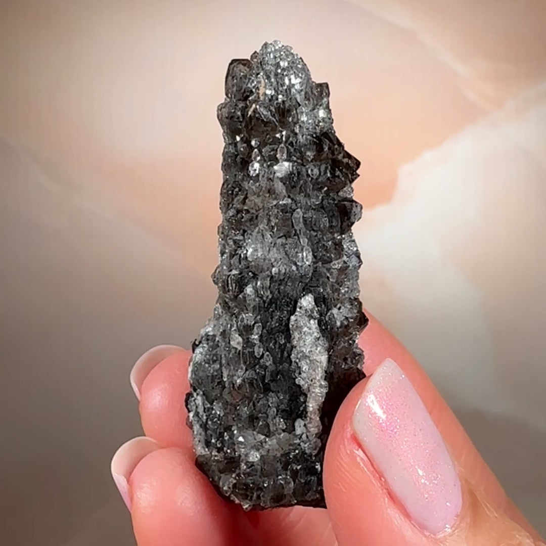 Ancient wood transformed into stone and crowned with smoky quartz druzy, this piece holds a rare harmony of grounding and activation. Its fossil core steadies the energy, while the quartz crystals impart a soft, tingling vibrational lift. Protective and clarifying, it anchors the spirit while subtly awakening the senses.