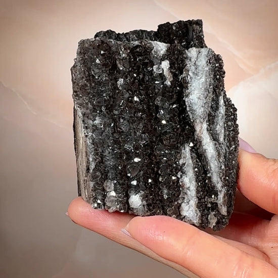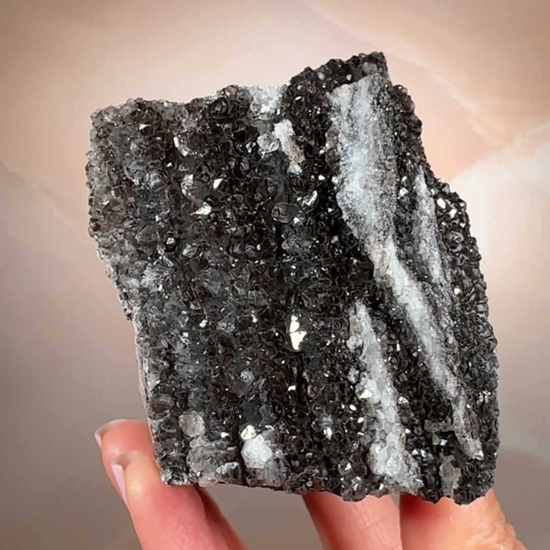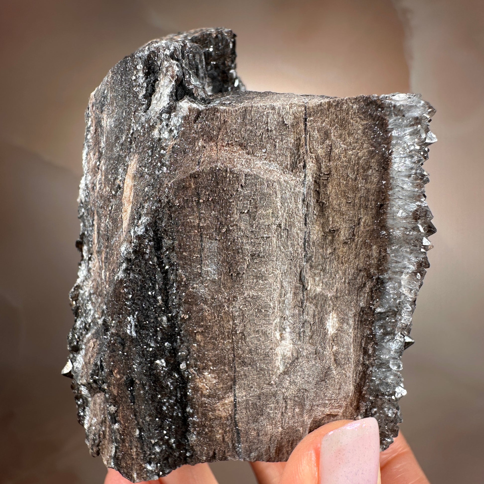 Ancient wood transformed into stone and crowned with smoky quartz druzy, this piece holds a rare harmony of grounding and activation. Its fossil core steadies the energy, while the quartz crystals impart a soft, tingling vibrational lift. Protective and clarifying, it anchors the spirit while subtly awakening the senses.
