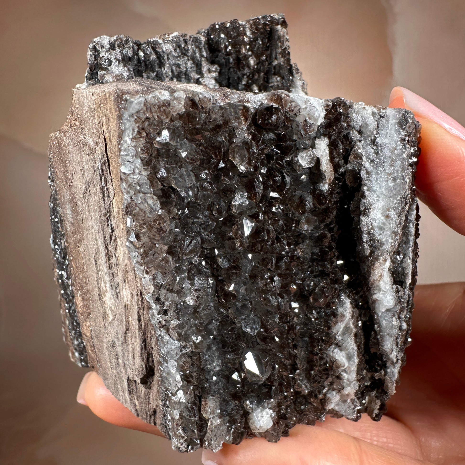 Crystallized Fossil Wood | Smoky Quartz–Encrusted Carbonized Petrified Wood from Arizona.