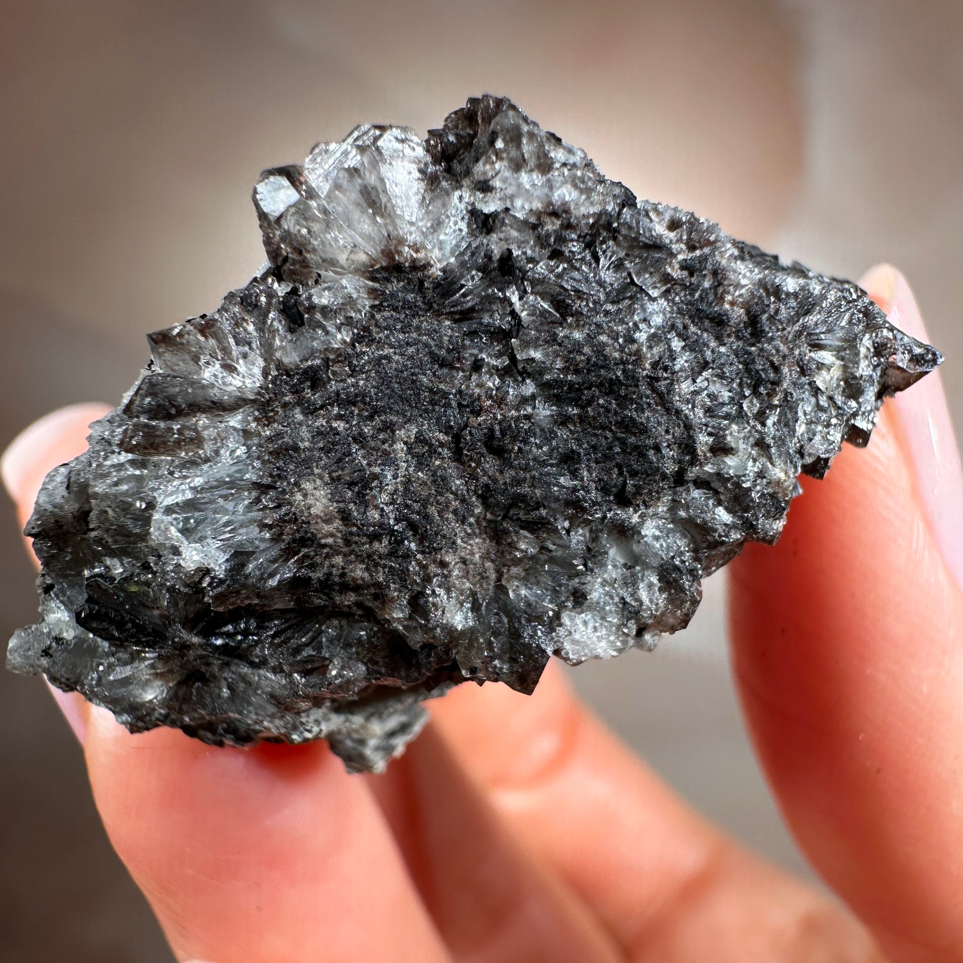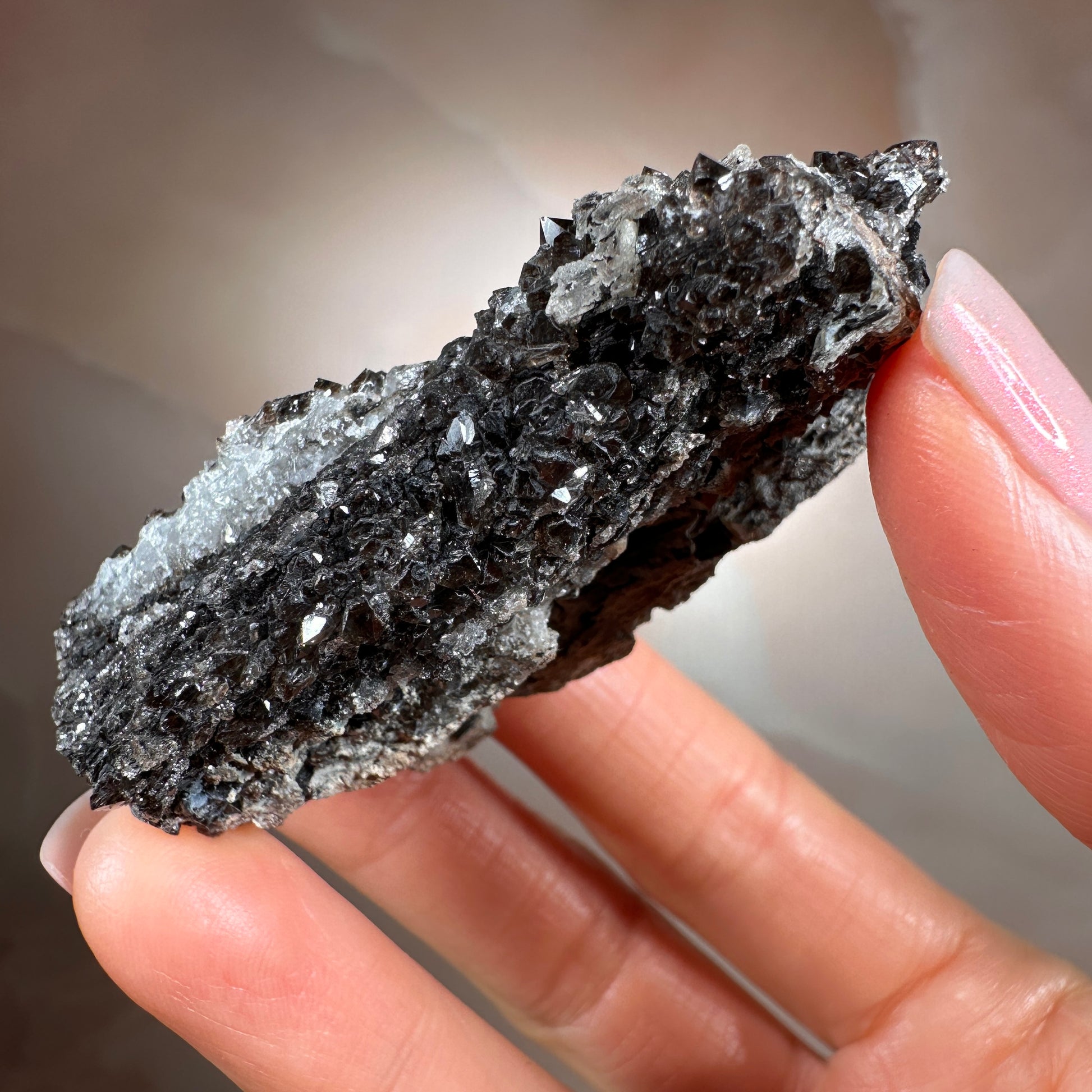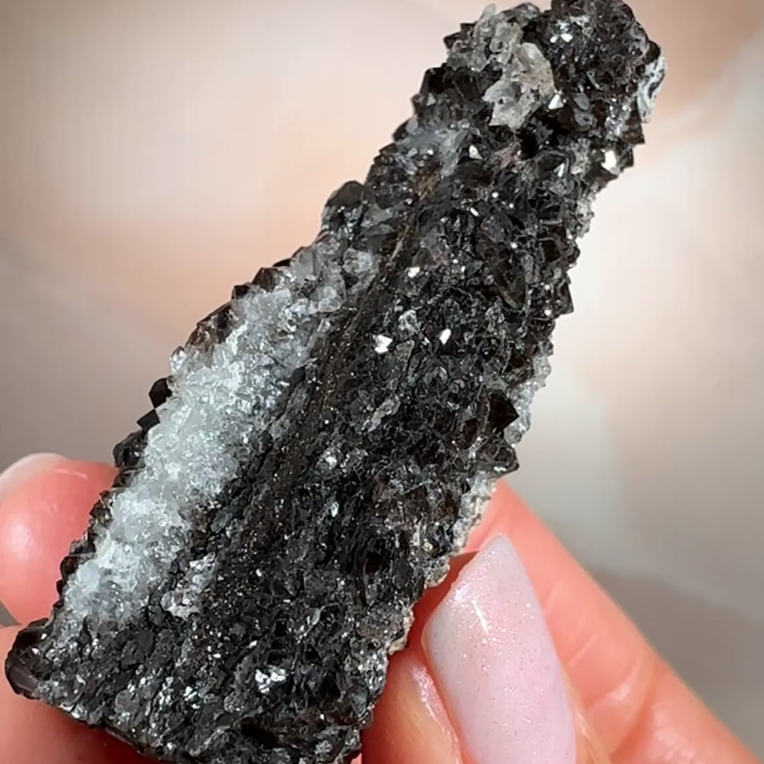 Ancient wood transformed into stone and crowned with smoky quartz druzy, this piece holds a rare harmony of grounding and activation. Its fossil core steadies the energy, while the quartz crystals impart a soft, tingling vibrational lift. Protective and clarifying, it anchors the spirit while subtly awakening the senses.