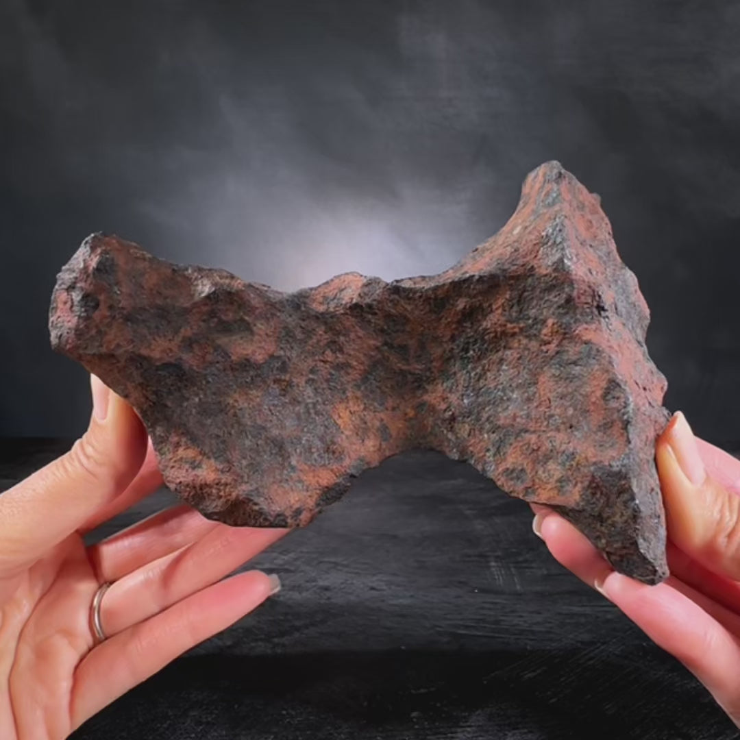 Premium Gibeon meteorite, complete individual with natural desert patina. An extraordinary Gibeon with an outstanding shape. This rare find is a striking specimen of cosmic fine art, with an eye-catching sculptural aesthetic. Originally exported from Namibia in the mid-90s, by a South African dealer, who considered it to be one of the most unique Gibeon meteorites he’d seen. He sold it to a meteorite collector, only to repurchase it again later from his client, to have for his personal collection. He kept it for many years, until 2023, when we acquired it from our South African friend. This is by far the largest and most striking of all the Gibeon specimens we have from his collection. A one of a kind collector’s piece, we have yet to see any other Gibeon like this one.