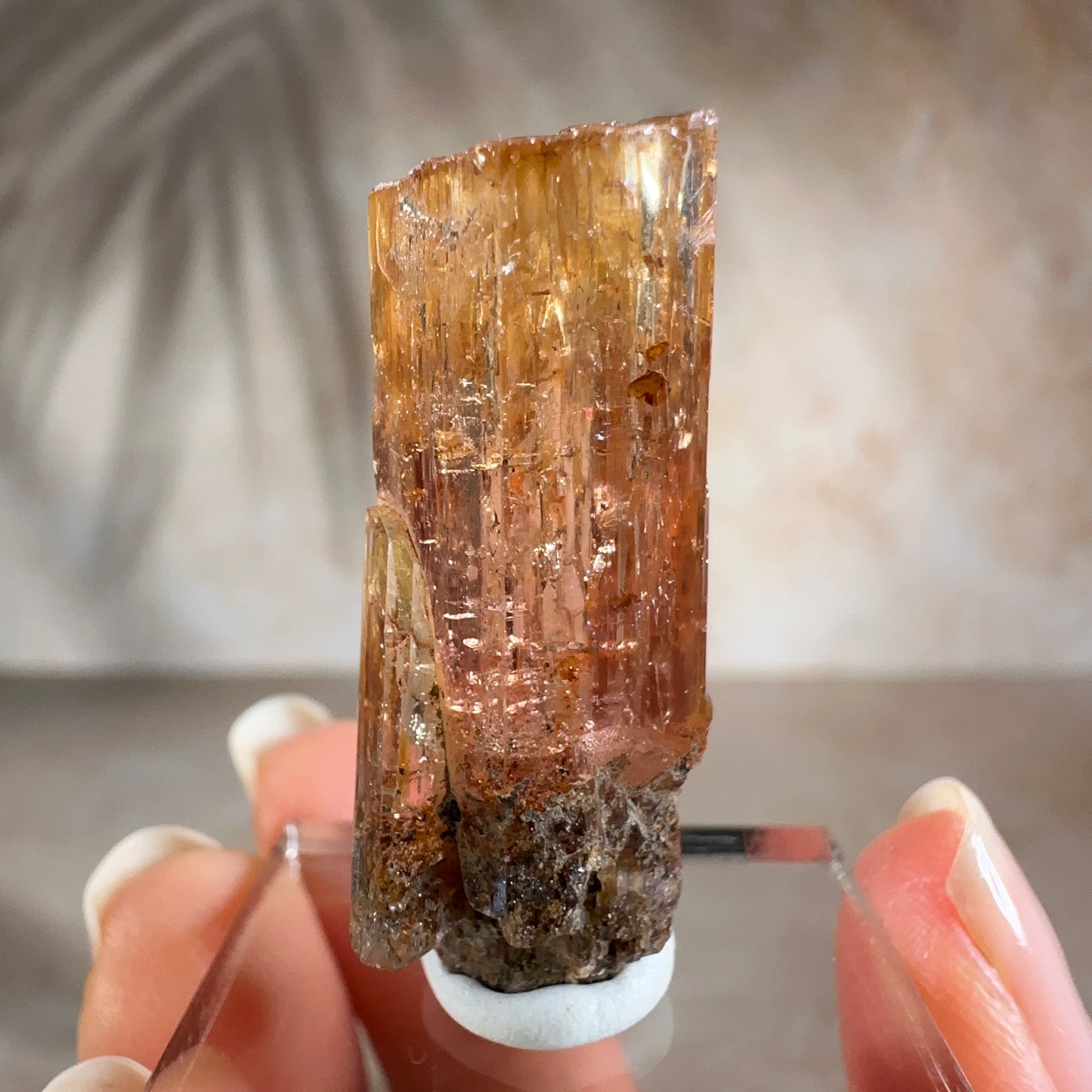 Stunning Imperial Topaz crystal from Zambia, Africa. Sparkling honey-amber Topaz with a juicy peachy-pink tint, gemmy clarity, glittering golden inclusions and glassy luster. This crystal has a flat termination, with earthy clay inclusions at its base. It's a rare find, originally collected about 7 years ago. Fluoresces a beautiful watermelon pink to cherry red color.