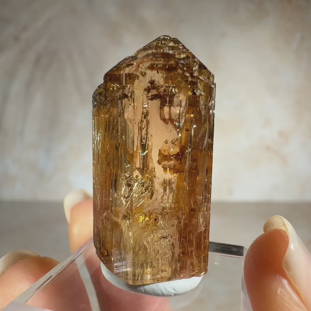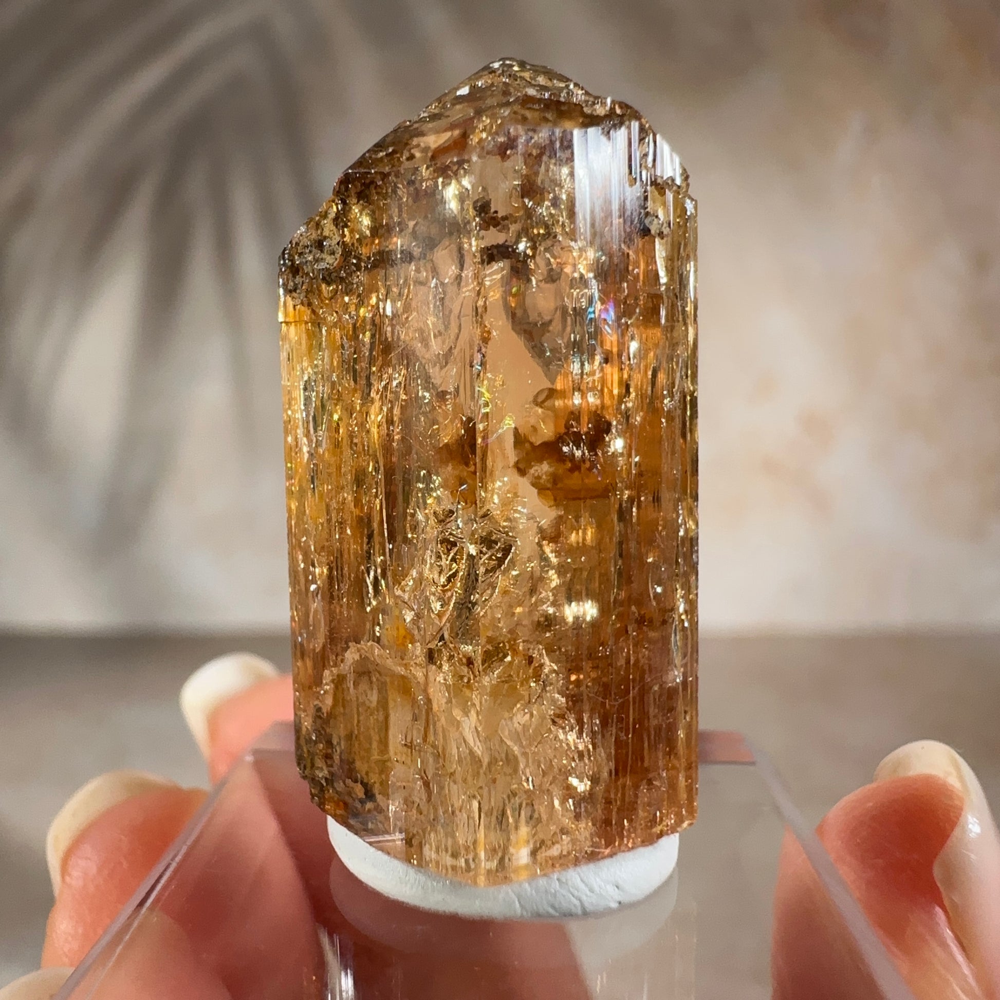 Stunning Imperial Topaz crystal from Zambia, Africa. Sparkling honey-amber Topaz with gemmy clarity, glittering golden inclusions and glassy luster. This Topaz crystal is terminated and etched with earthy clay inclusions. It's a rare find, originally collected about 7 years ago. Fluoresces a beautiful watermelon pink to cherry red color.
