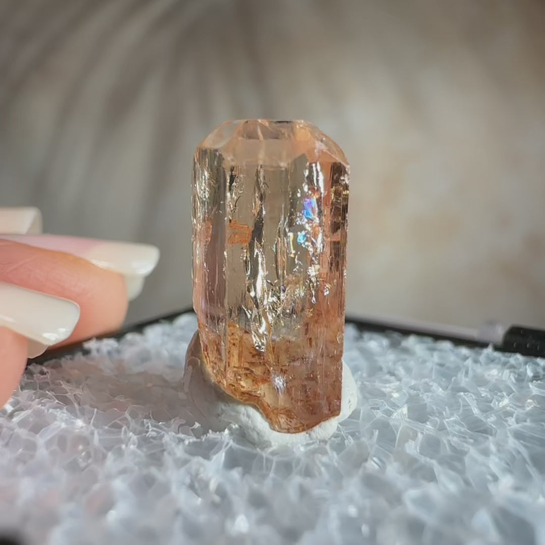 Imperial Topaz crystal from Zambia, Africa. Sparkling honey Topaz with gemmy clarity and glittering golden inclusions. This crystal has a pristine termination and glassy luster. These Zambia Topaz crystals are a rare find, originally collected about 7 years ago. Fluoresces a beautiful watermelon pink to cherry red color, in long-wave UV light.