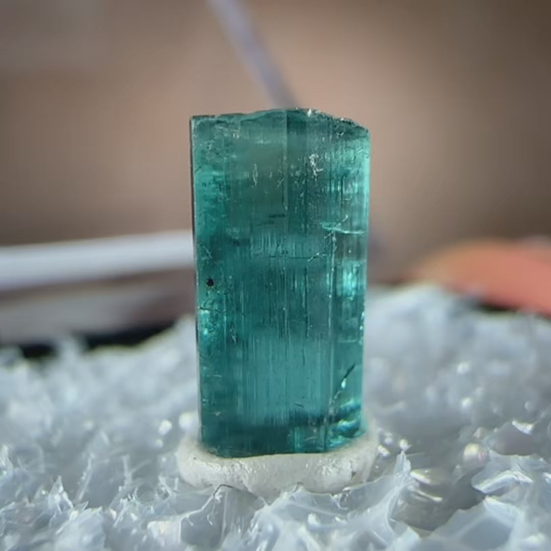 Indicolite Tourmaline crystal with luminous teal-blue color, gemmy clarity and glassy luster. The top termination is flat. Teal-blue Indicolite Tourmaline from the famous Muiane-Naipa locality is a rare find nowadays, very little material of good quality has come from this region in the past 30 years. We were recently able to obtain a small parcel of these gorgeous teal-blue Tourmaline crystals direct from our African supplier, he had stored them away for several years.