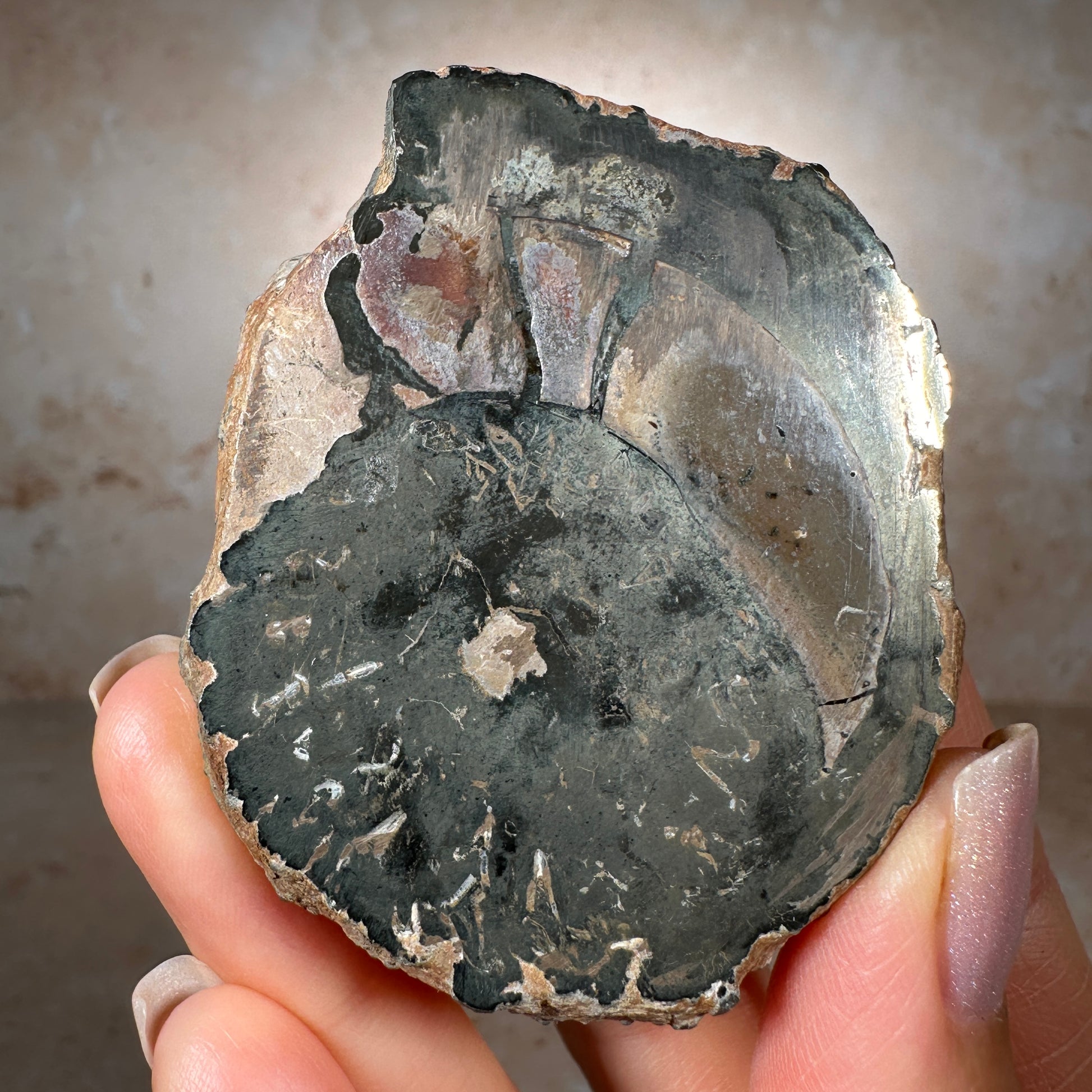 This ammonite lived about 190 Million years ago, during the lower Jurassic period, in the Pliensbachian stage. The Earth was experiencing warm and humid sub-tropical conditions, including rising sea levels, lush green vegetation was flourishing and these ancient marine mollusks were thriving in the warm seawater. It's believed the same event that caused the mass extinction of the dinosaurs, also wiped out the ammonites.