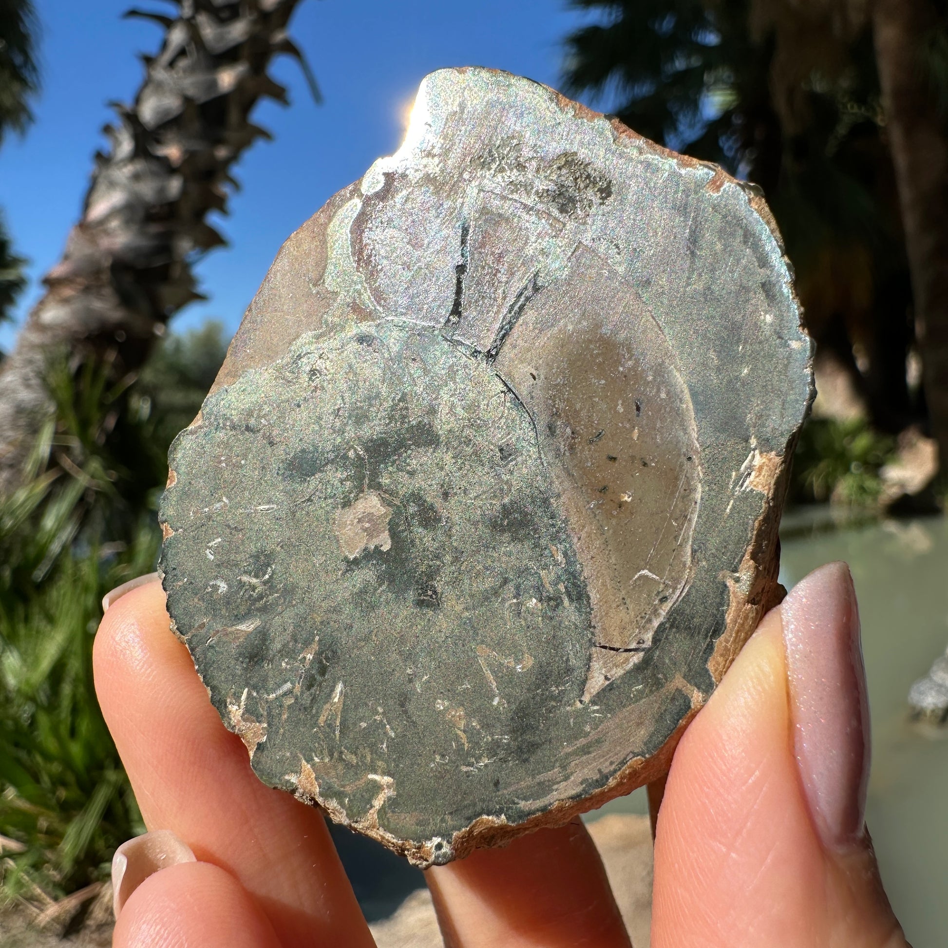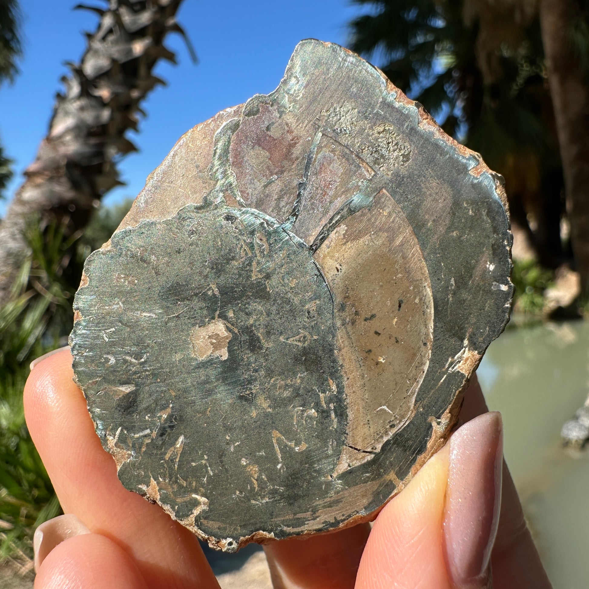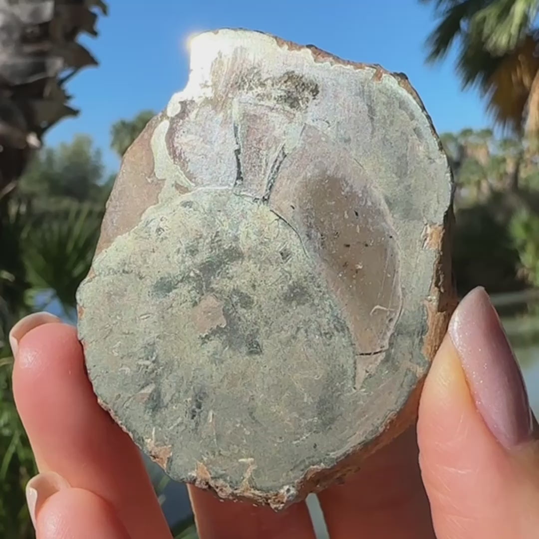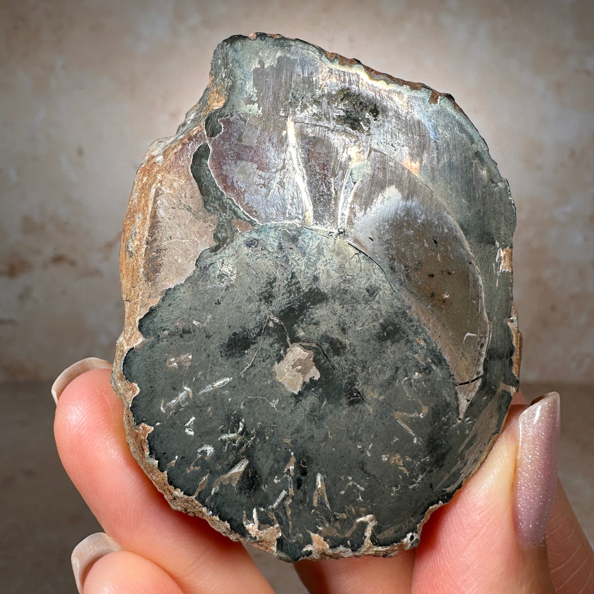 Gorgeous pyritized agatized ammonite fossil, Pleuroceras spinatum, collected from the Holzbachacker clay pit in Bavaria, Germany. This specimen is cut and polished to expose the pyritized spiral chambers inside.