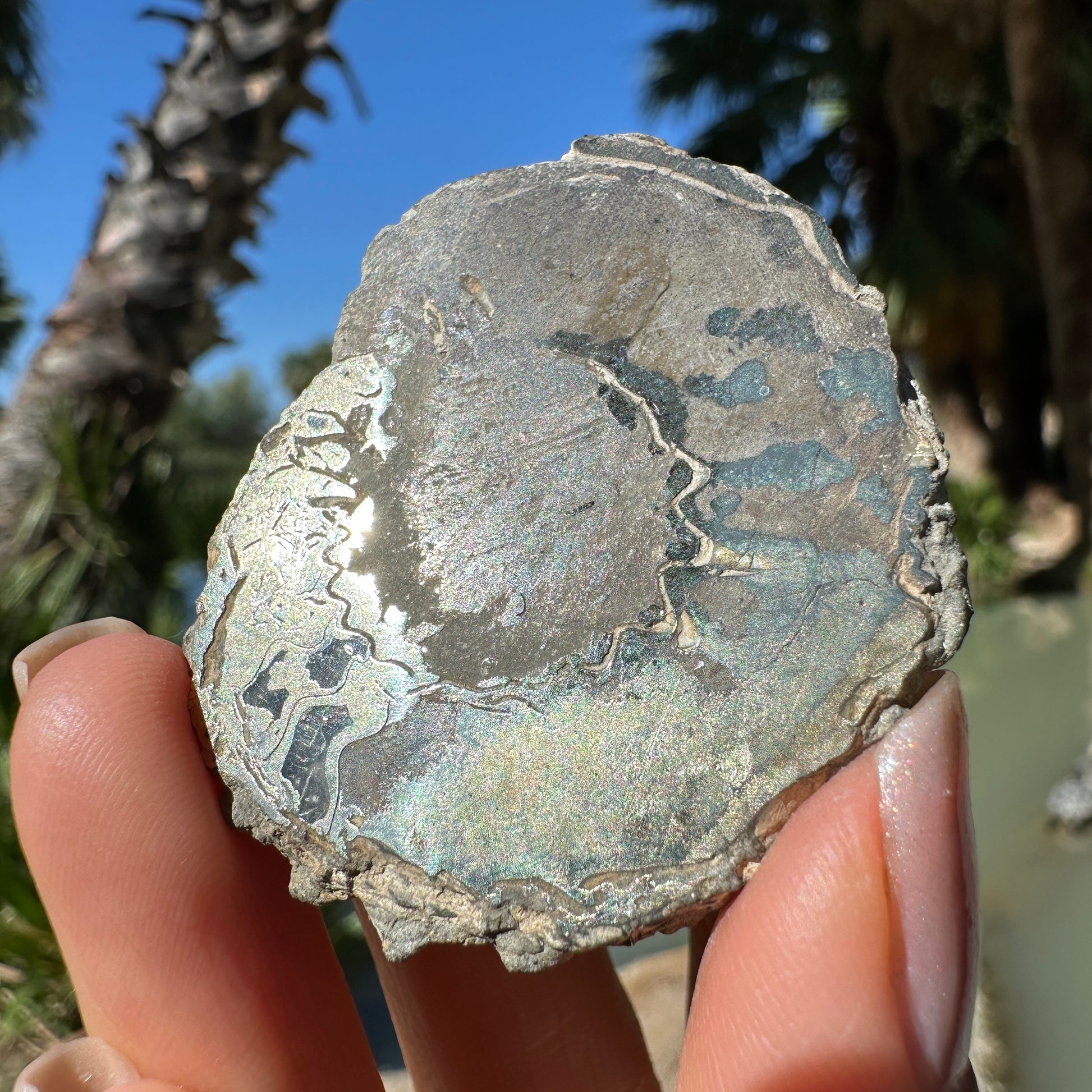 Gorgeous pyritized agatized ammonite fossil, Pleuroceras spinatum, collected from the Holzbachacker clay pit in Bavaria, Germany. This specimen is cut and polished to expose the pyritized spiral chambers inside.