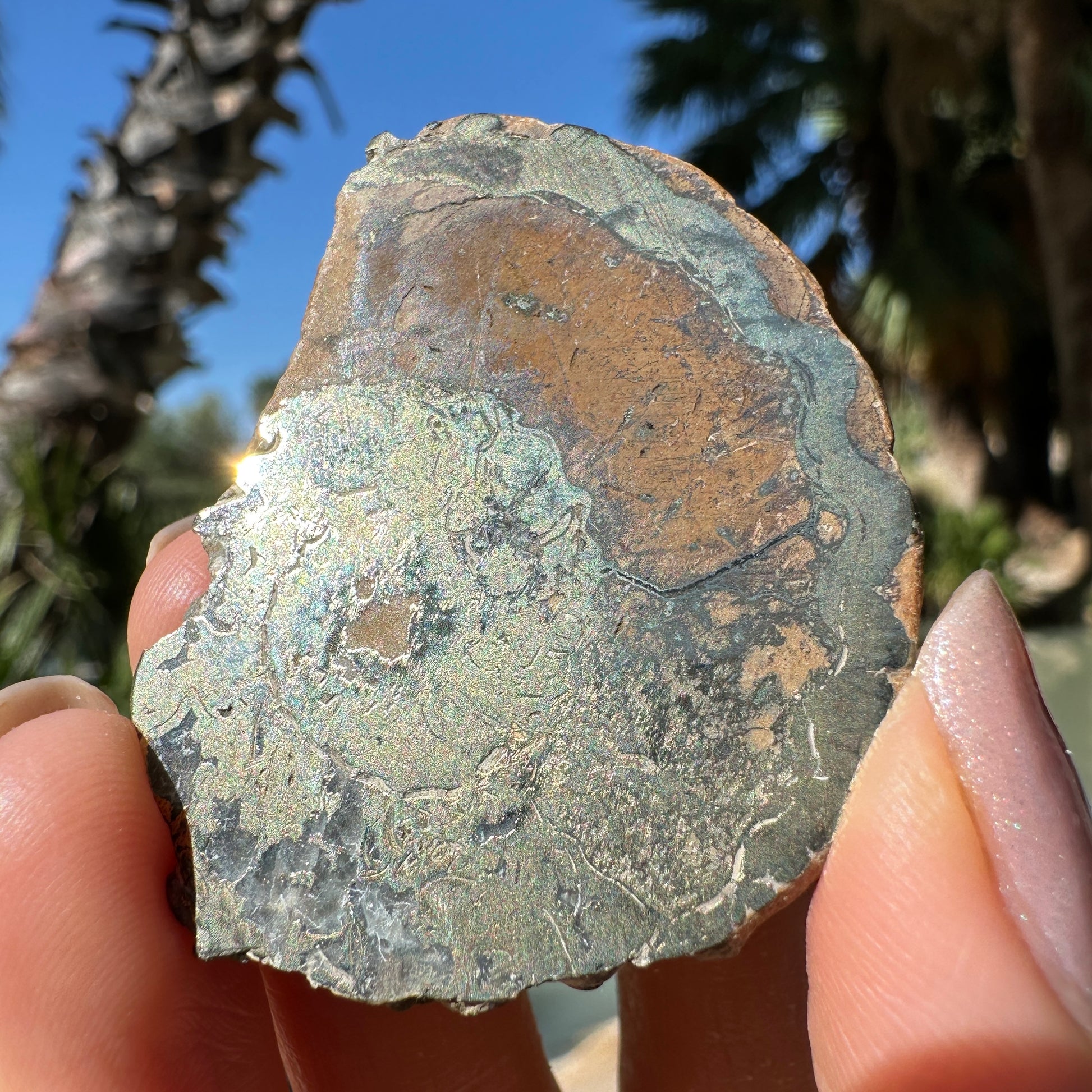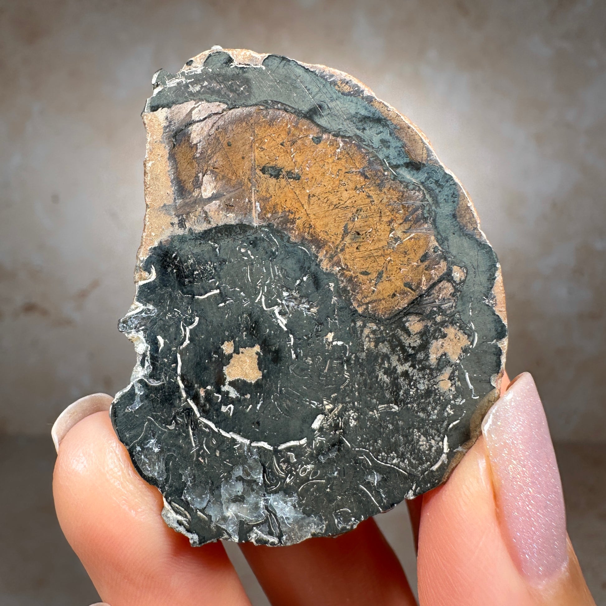 Gorgeous pyritized agatized ammonite fossil, Pleuroceras spinatum, collected from the Holzbachacker clay pit in Bavaria, Germany. This specimen is cut and polished to expose the pyritized spiral chambers inside.