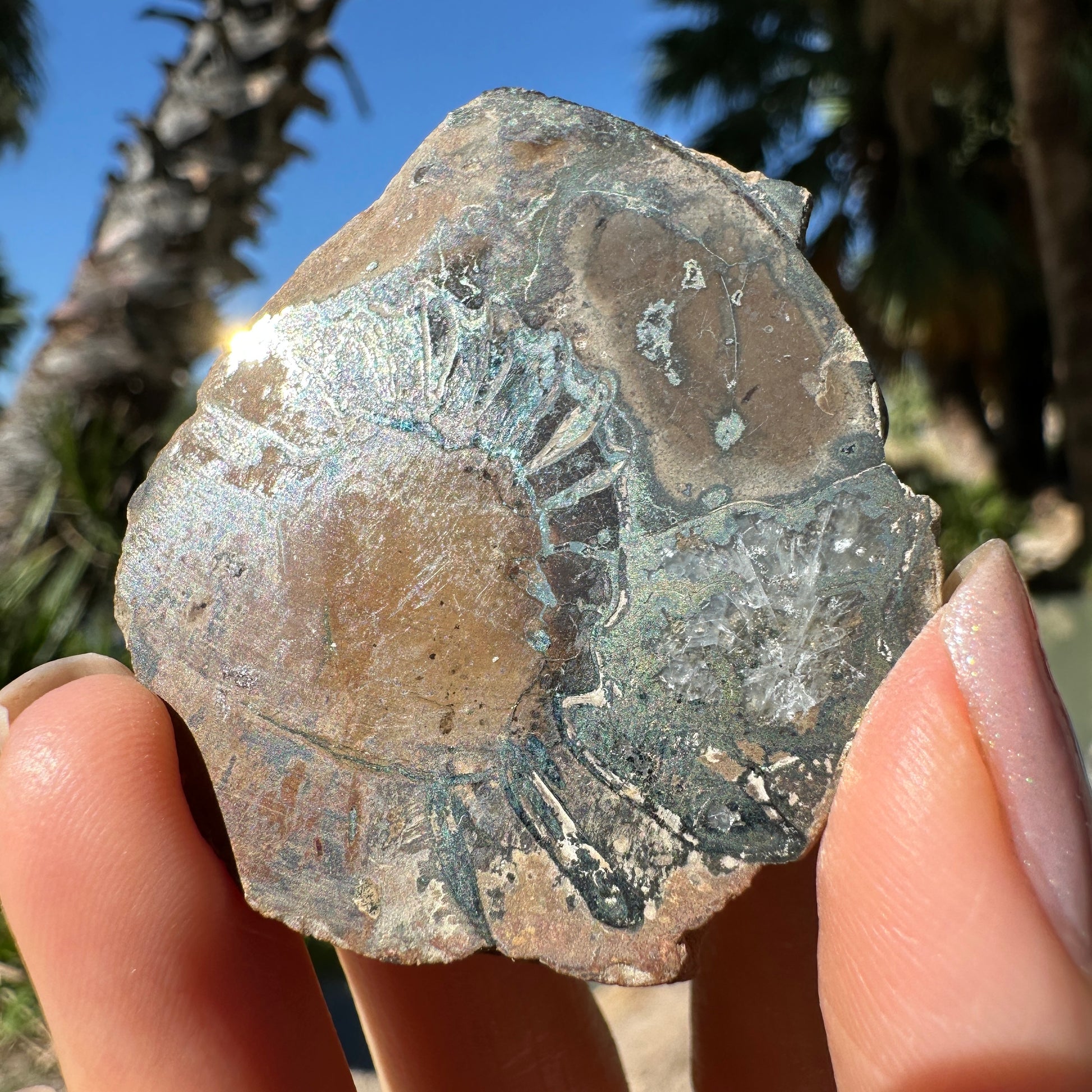 Gorgeous pyritized agatized ammonite fossil, Pleuroceras spinatum, collected from the Holzbachacker clay pit in Bavaria, Germany. This specimen is cut and polished to expose the pyritized spiral chambers inside.