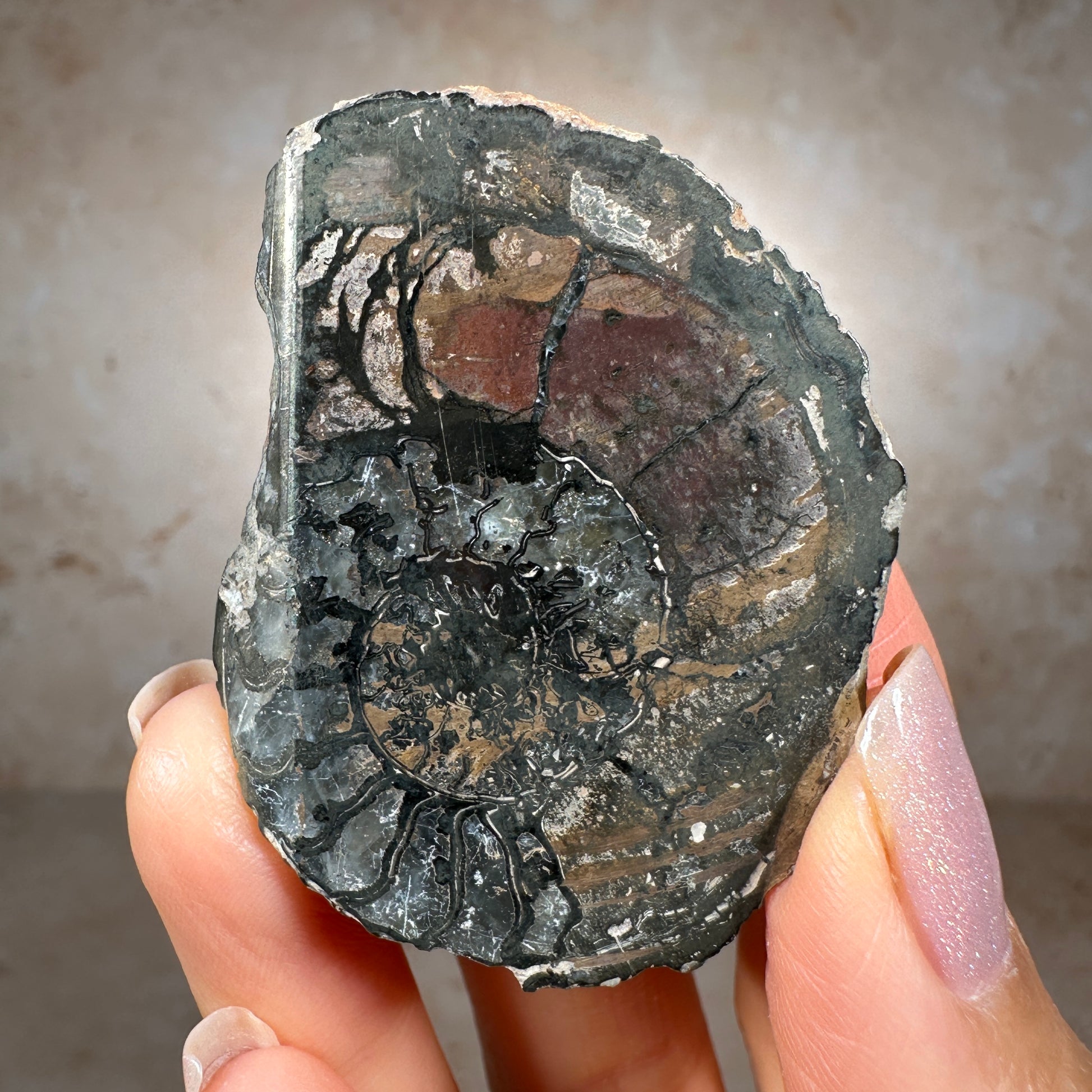 This ammonite lived about 190 Million years ago, during the lower Jurassic period, in the Pliensbachian stage. The Earth was experiencing warm and humid sub-tropical conditions, including rising sea levels, lush green vegetation was flourishing and these ancient marine mollusks were thriving in the warm seawater. It's believed the same event that caused the mass extinction of the dinosaurs, also wiped out the ammonites.
