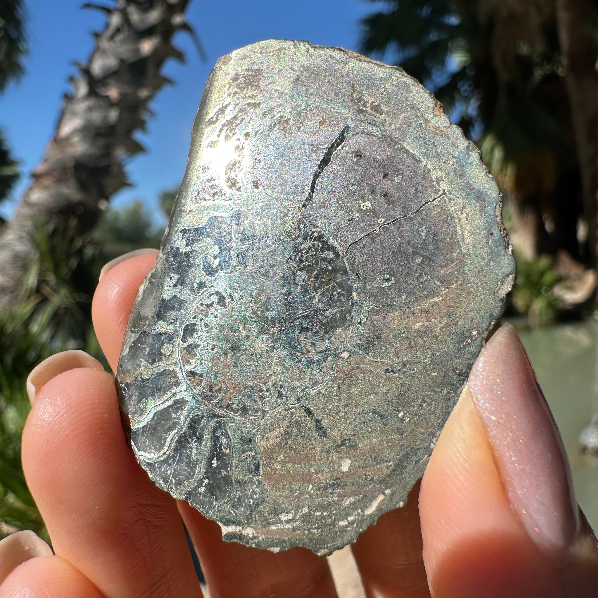 Gorgeous pyritized agatized ammonite fossil, Pleuroceras spinatum, collected from the Holzbachacker clay pit in Bavaria, Germany. This specimen is cut and polished to expose the pyritized spiral chambers inside.
