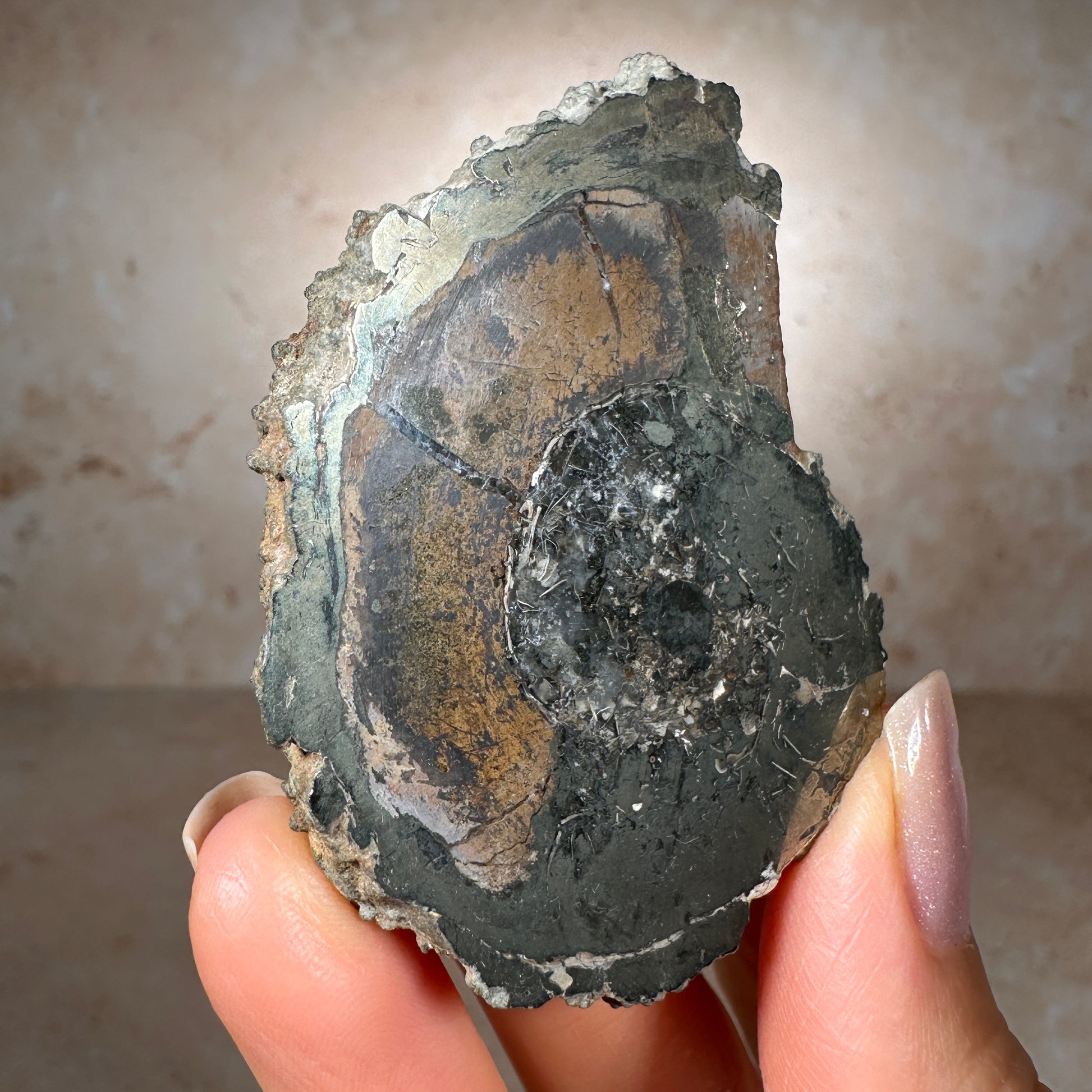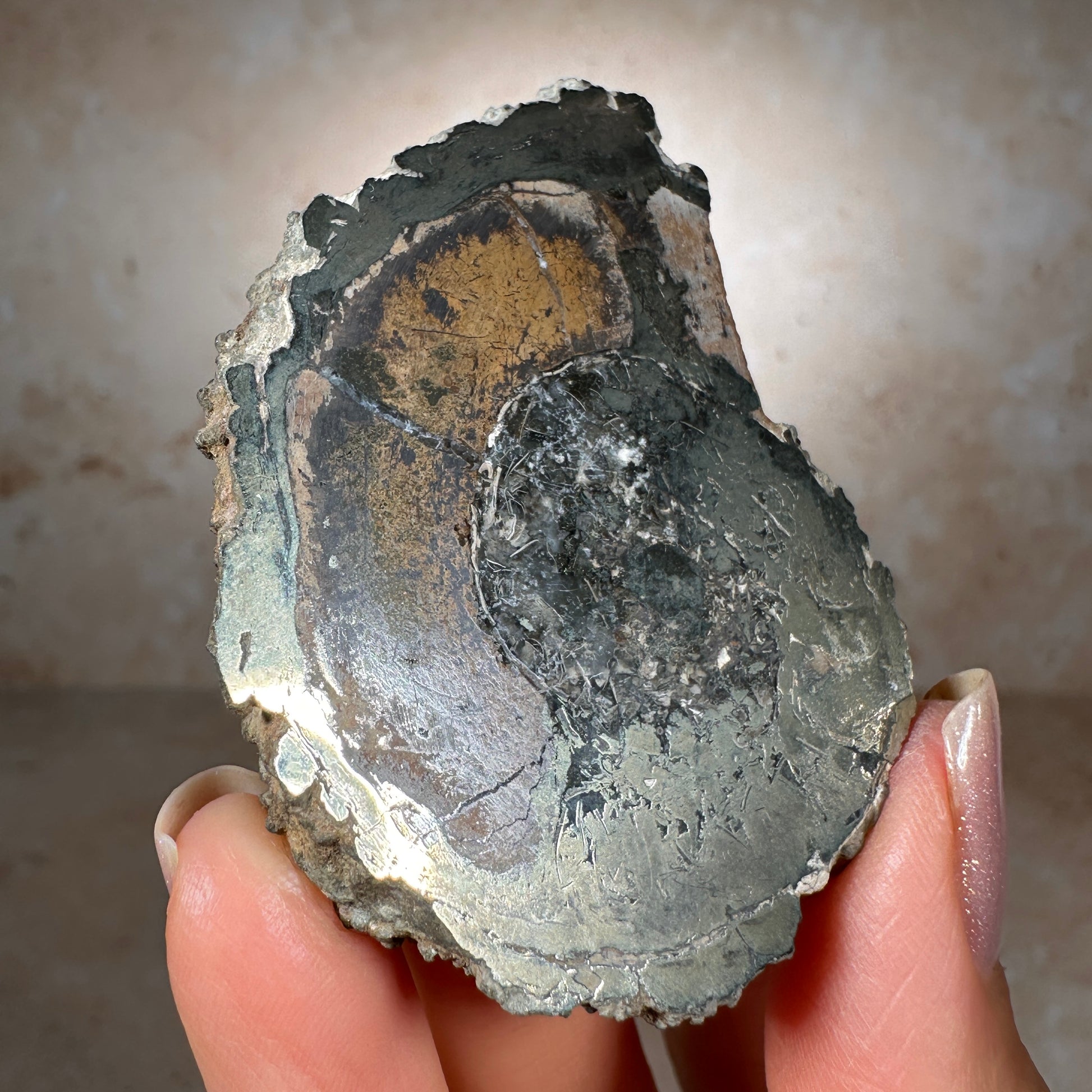 This famous German locality is known for its heavily pyritized ammonites. They have some heft to them, you can feel the gravity of dense iron pyrite as you hold it in your hand.