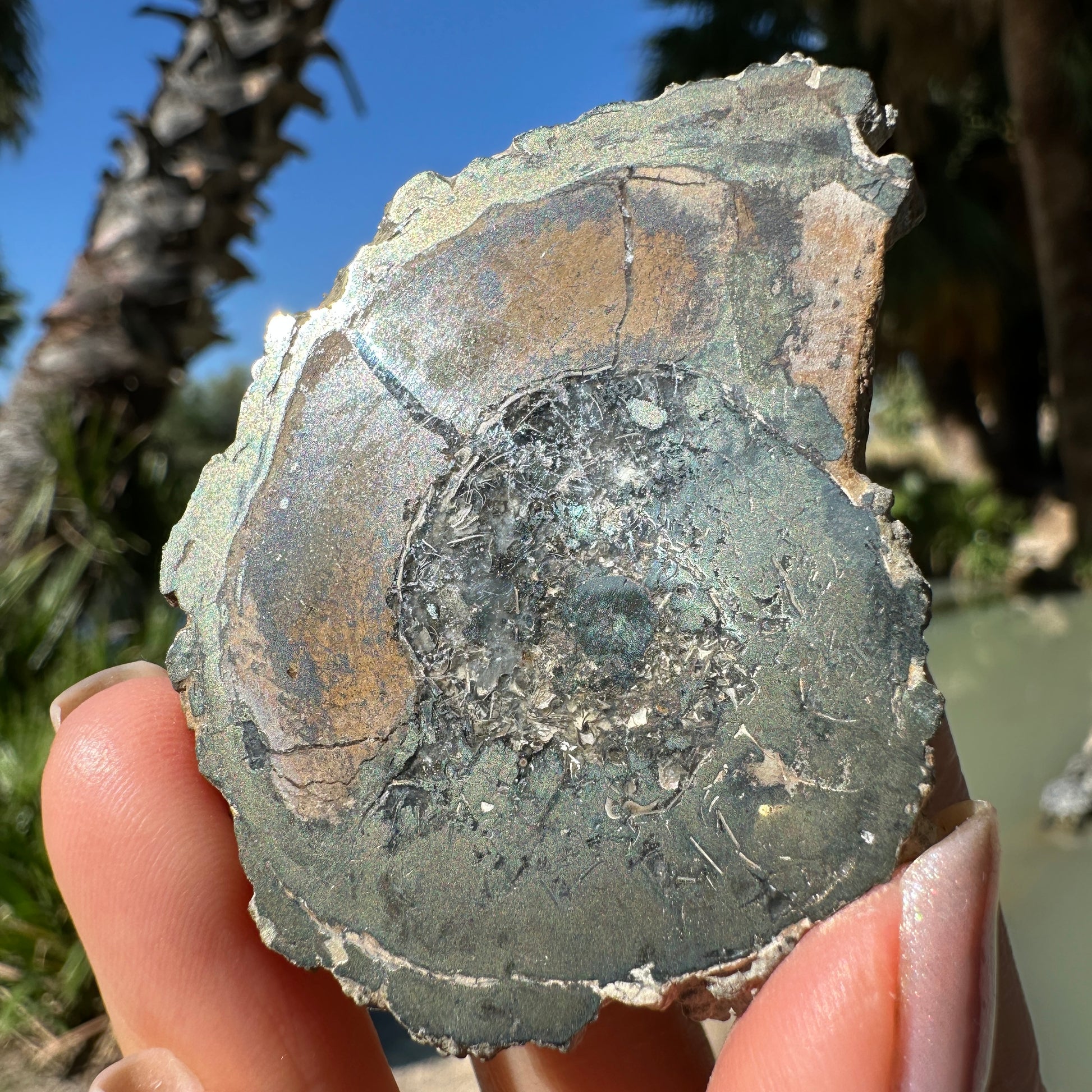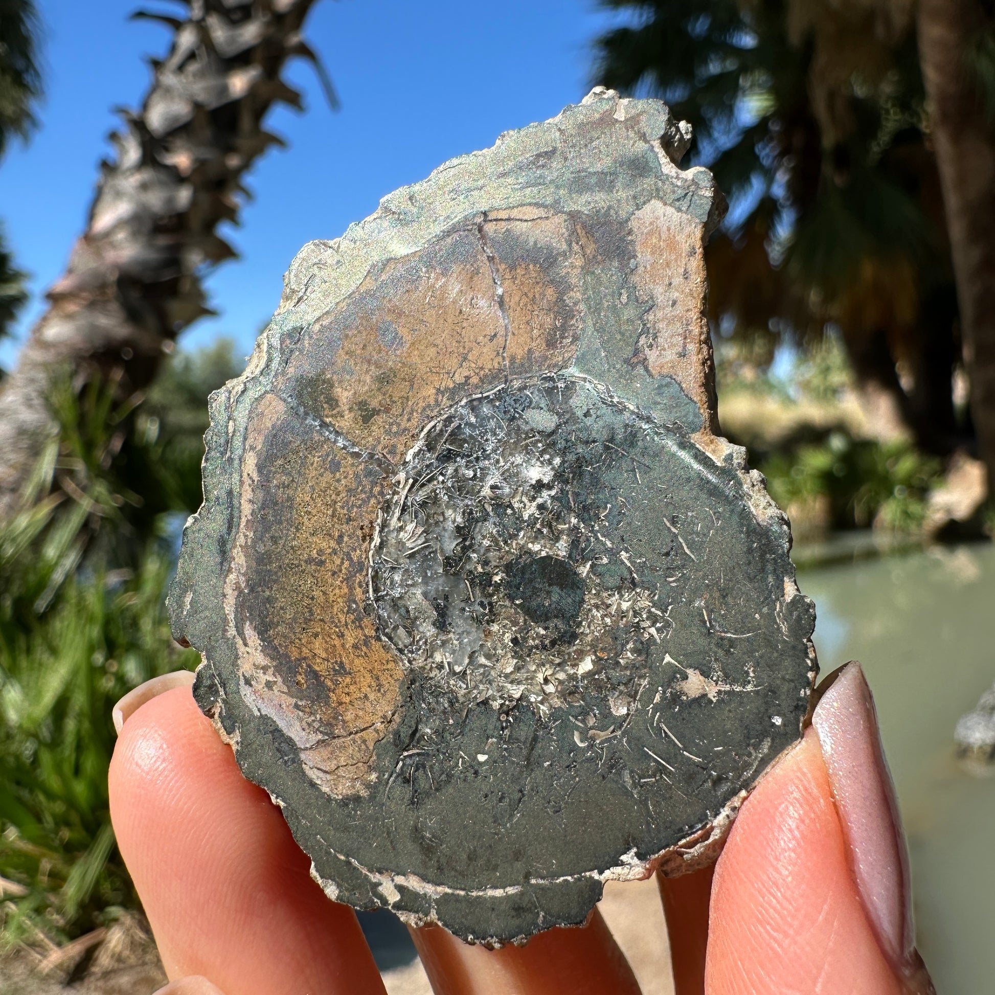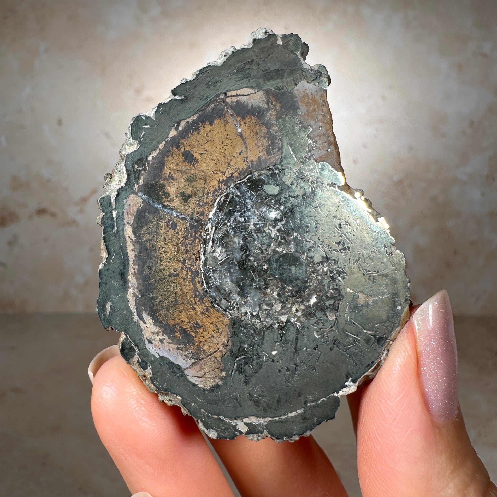Gorgeous pyritized agatized ammonite fossil, Pleuroceras spinatum, collected from the Holzbachacker clay pit in Bavaria, Germany. This specimen is cut and polished to expose the pyritized spiral chambers inside.