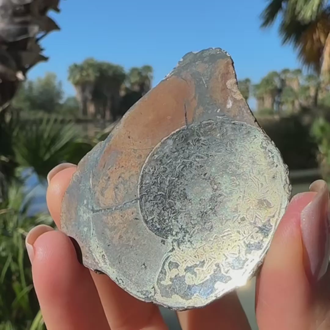 Gorgeous pyritized agatized ammonite fossil, Pleuroceras spinatum, collected from the Holzbachacker clay pit in Bavaria, Germany. This specimen is cut and polished to expose the pyritized spiral chambers inside.