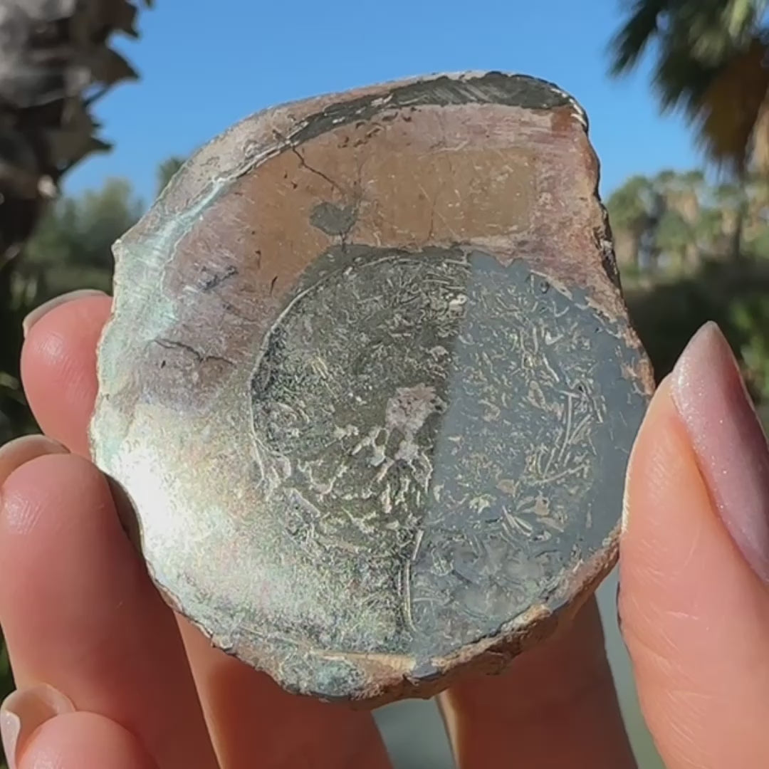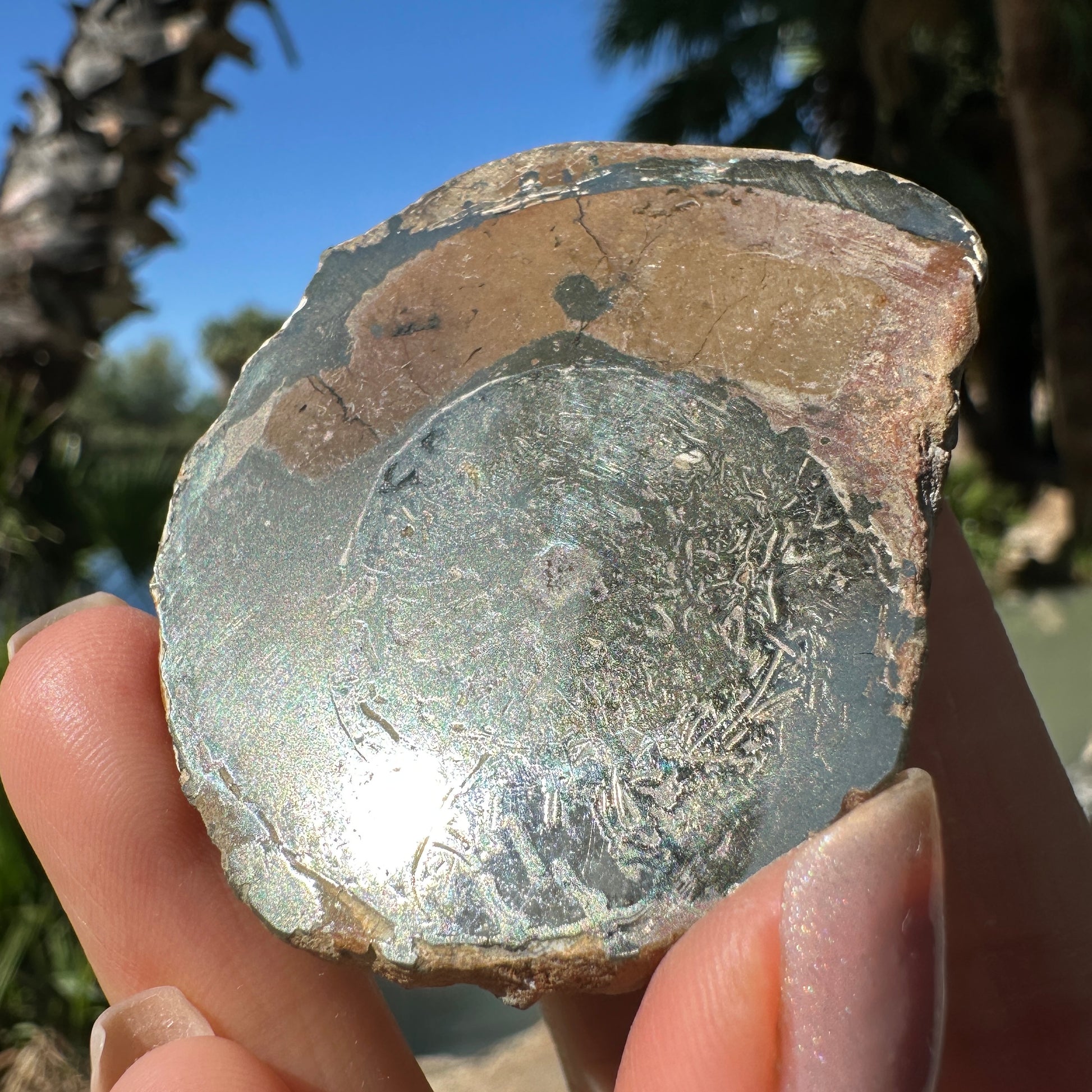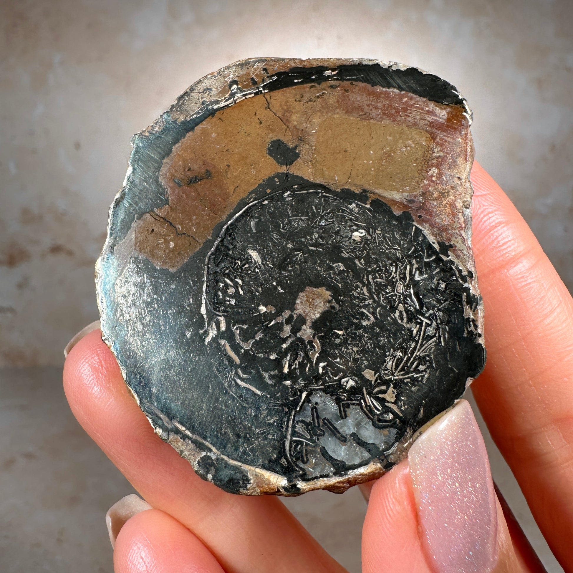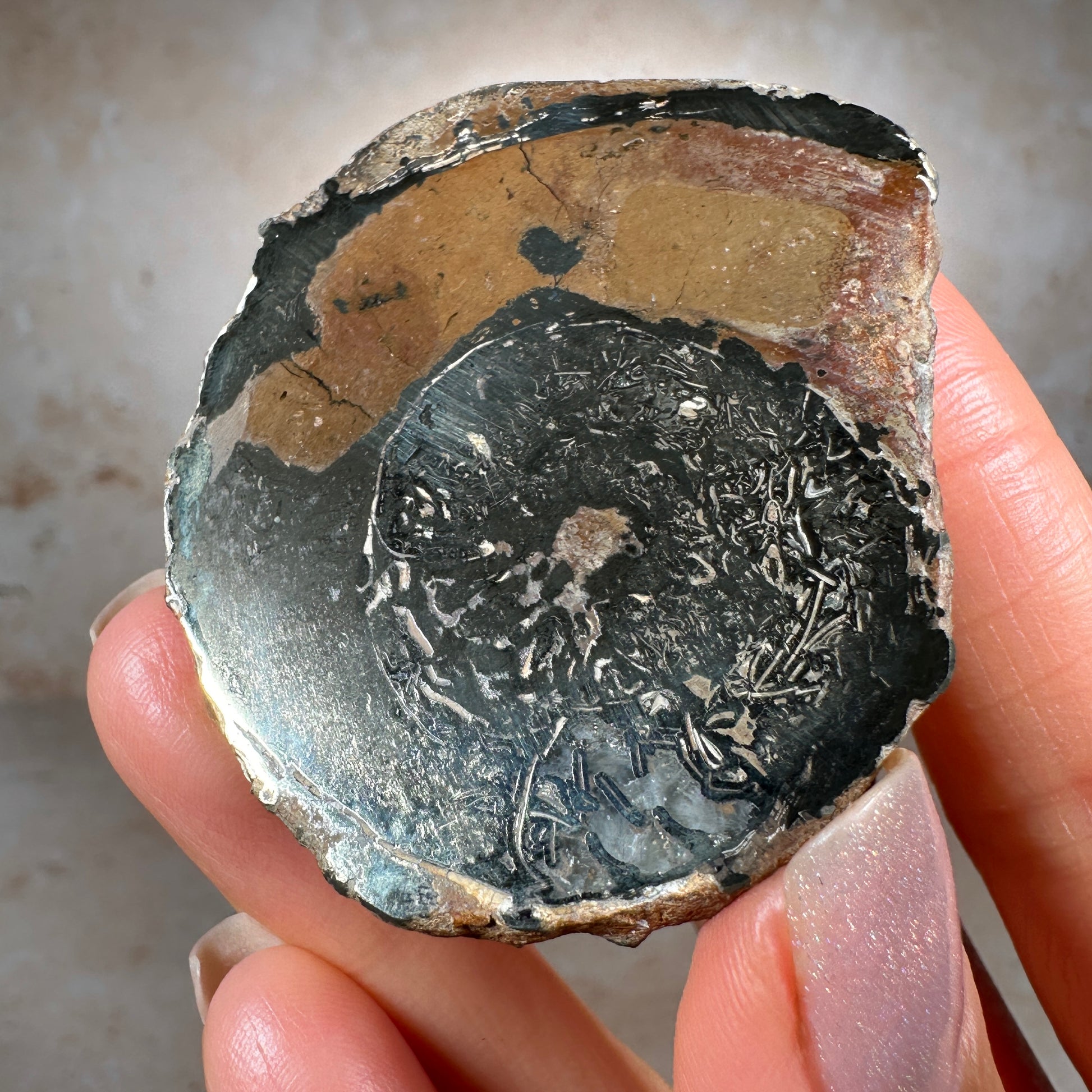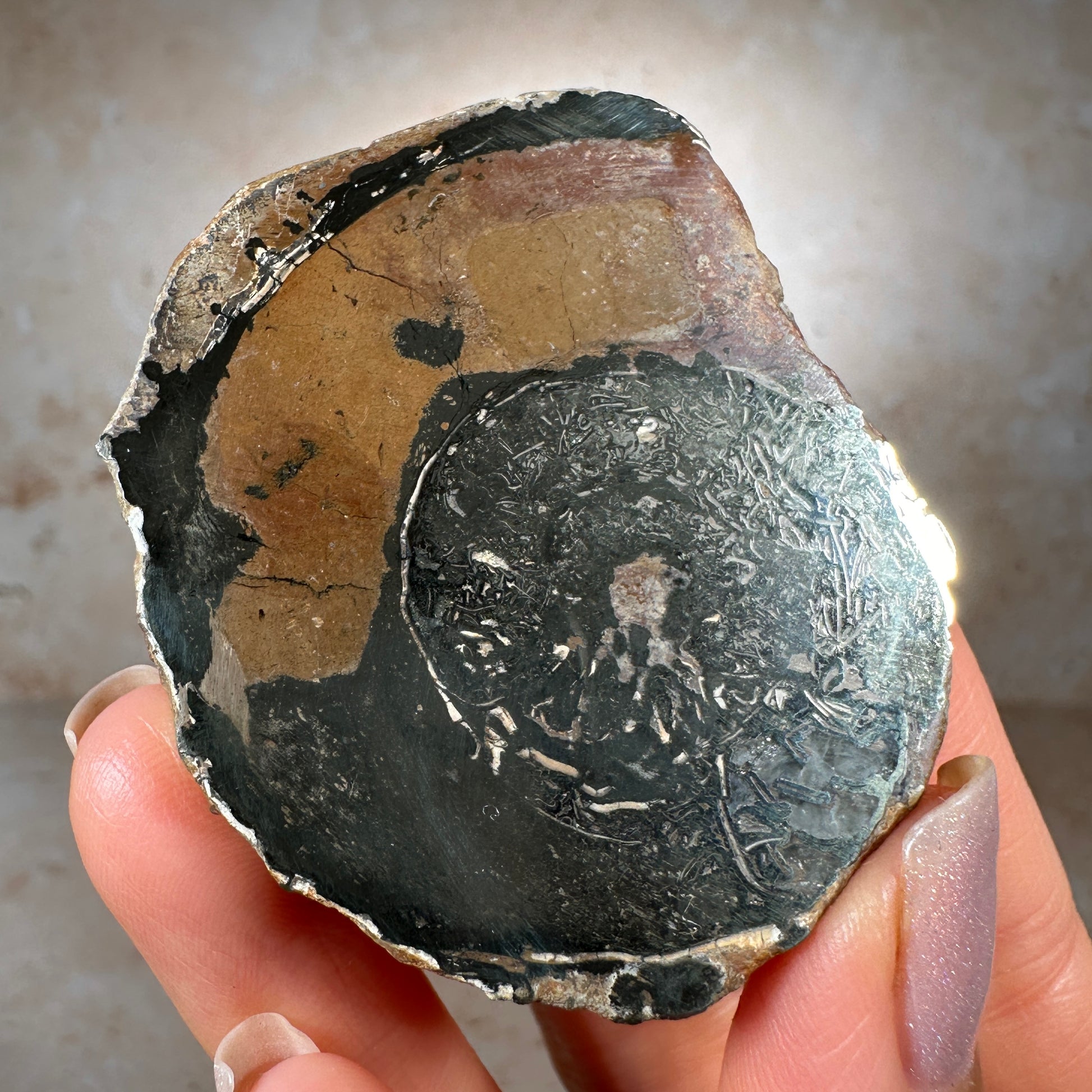 Gorgeous pyritized agatized ammonite fossil, Pleuroceras spinatum, collected from the Holzbachacker clay pit in Bavaria, Germany. This specimen is cut and polished to expose the pyritized spiral chambers inside.