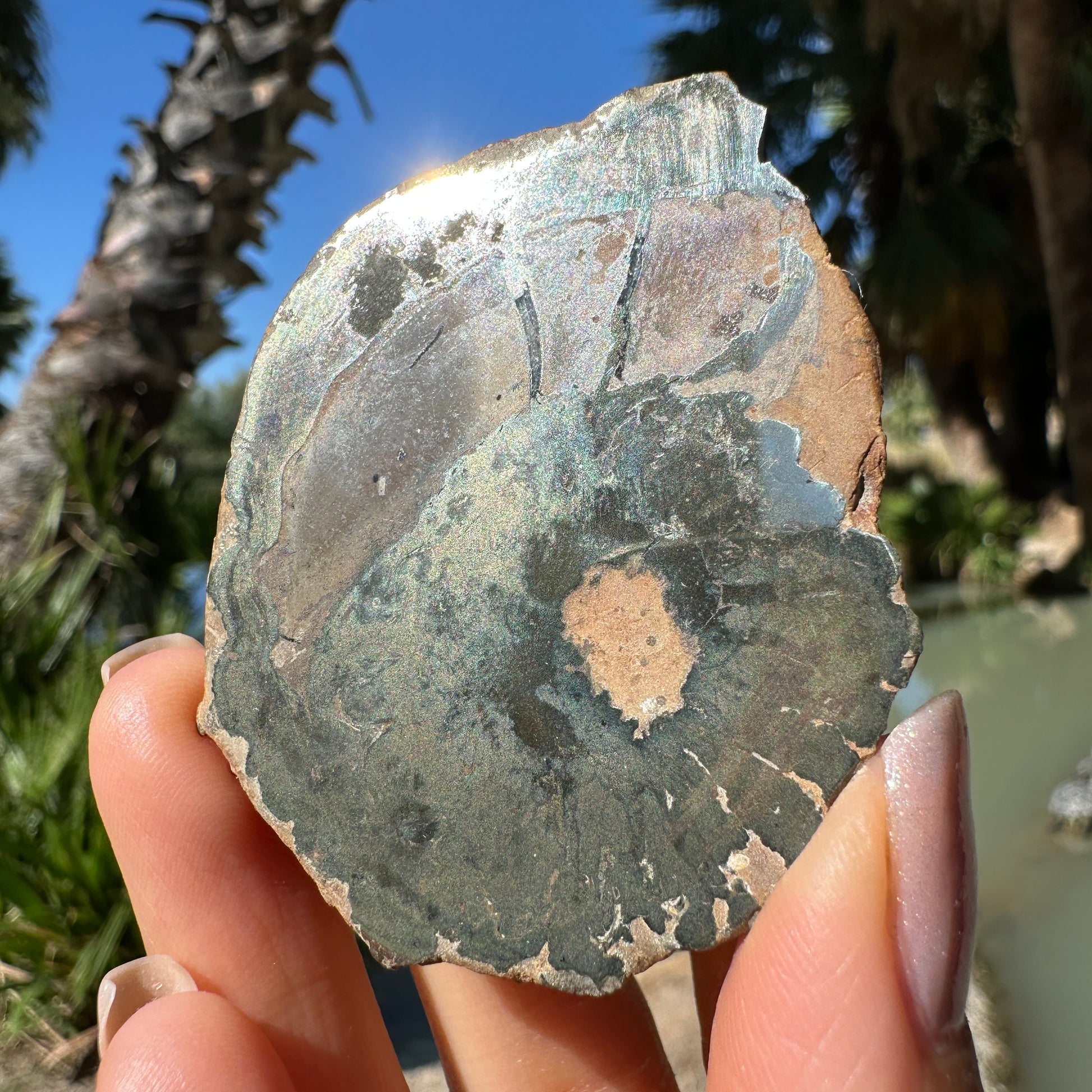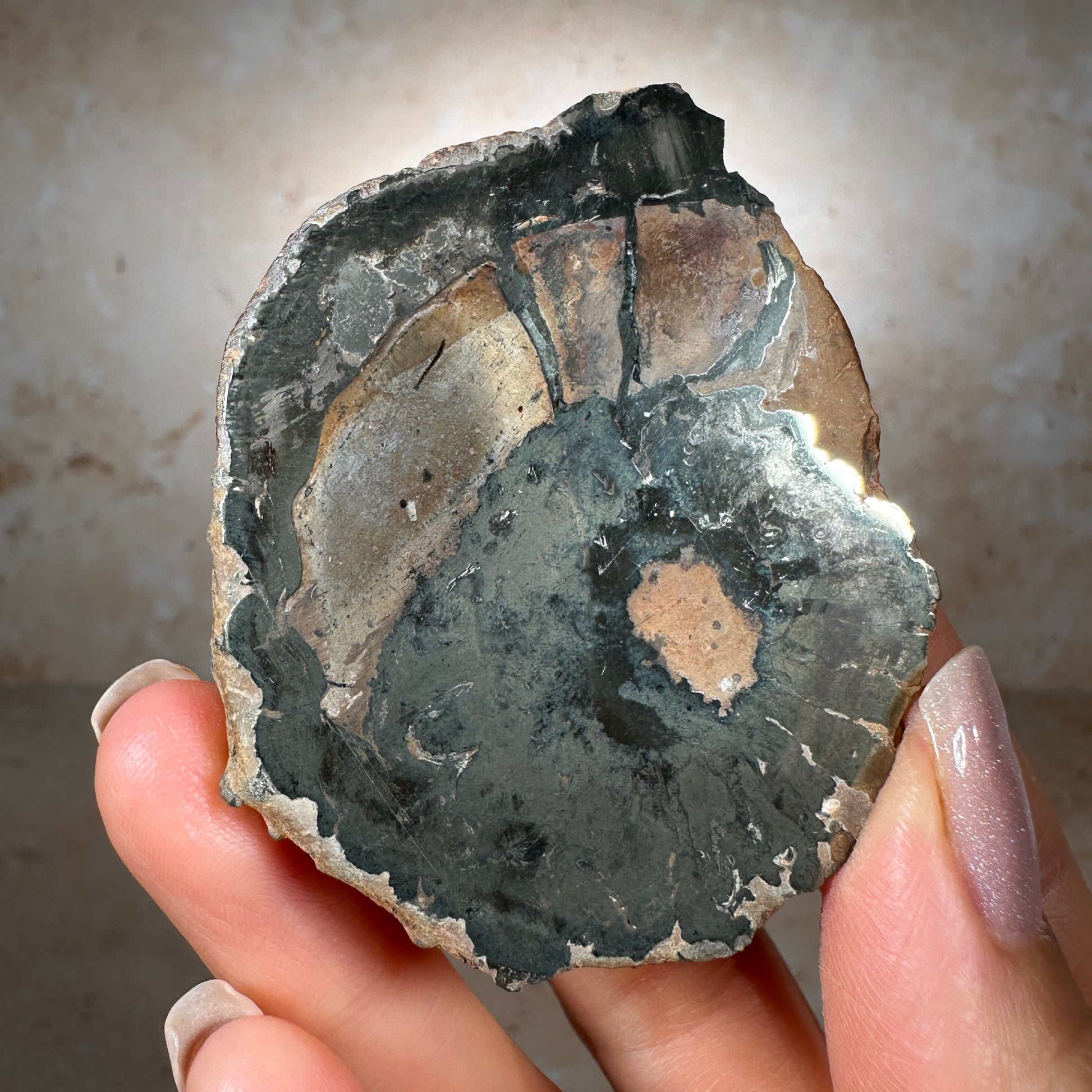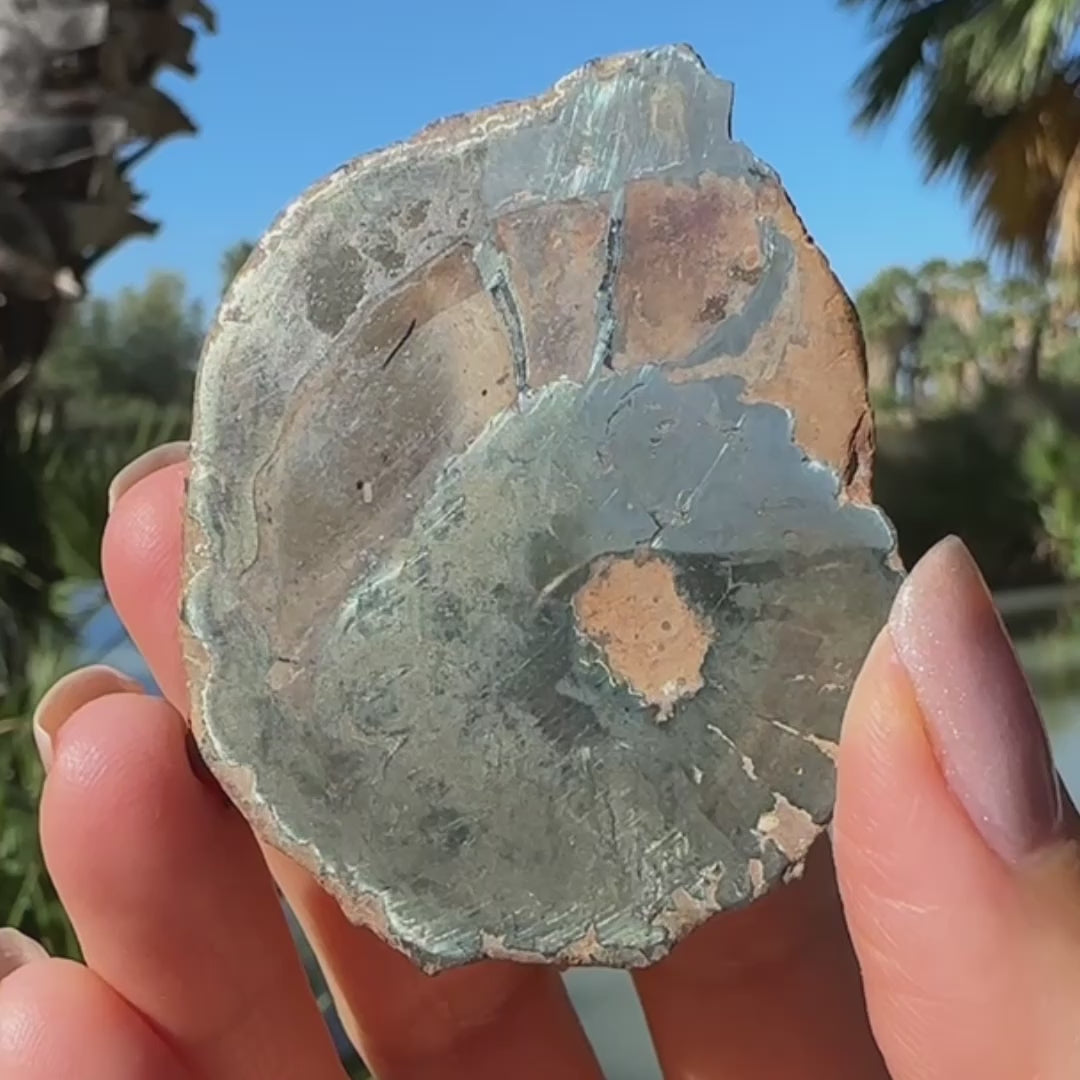 Gorgeous pyritized agatized ammonite fossil, Pleuroceras spinatum, collected from the Holzbachacker clay pit in Bavaria, Germany. This specimen is cut and polished to expose the pyritized spiral chambers inside.