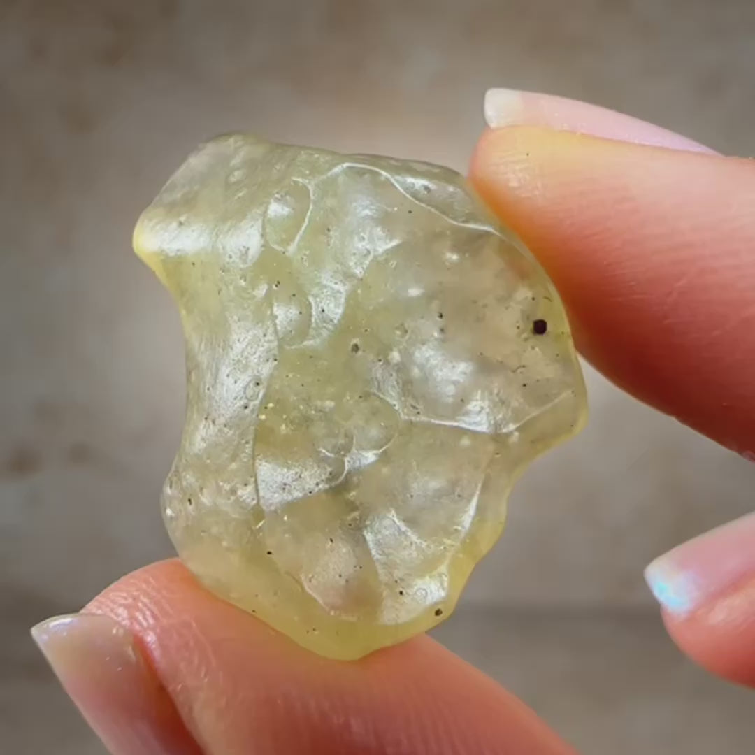 This Libyan Desert Glass tektite contains cristobalite, another mineral created in the heat and pressure of the meteor impact. Hand-selected for its exceptional quality. With its vibrant golden-yellow hue, smooth, wind-sculpted form, and glowing translucence, this piece shows classic signs of a surface find—a tektite ventifact, weathered by desert winds over thousands of years. Libyan Desert Glass is one of the most captivating and highly prized tektites on Earth. Found only in the remote and inhospitable dunes of the Great Sand Sea, near the Libya-Egypt border. Due to regional instability and restricted access to the tektite strewn field site, as demand rises and supply tightens, top-grade specimens like this piece are expected to increase in value.