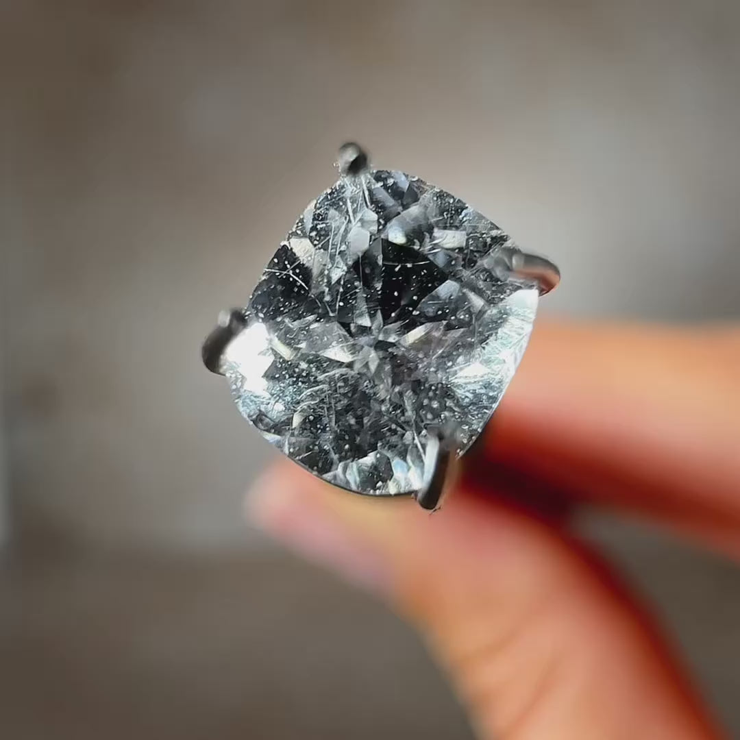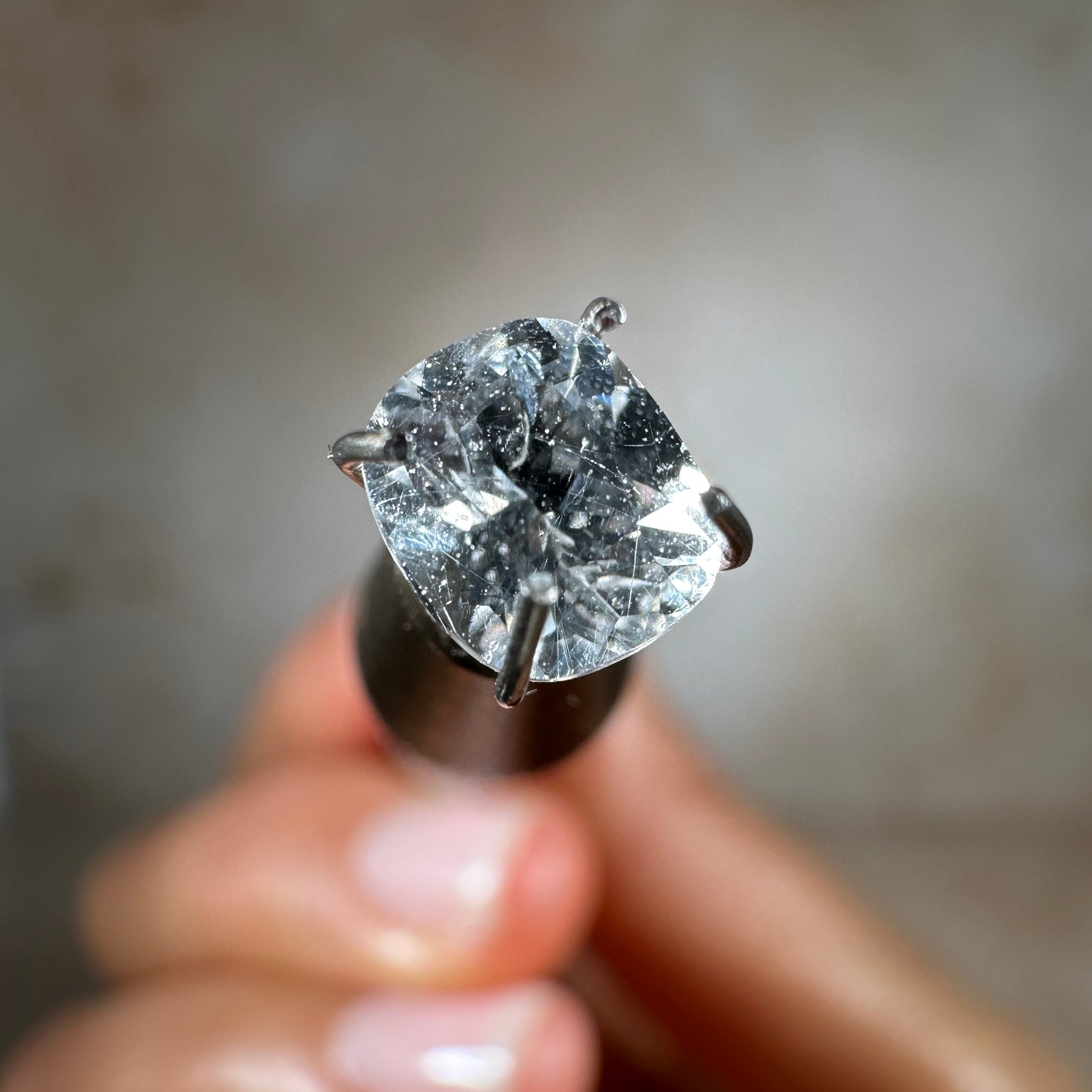 Sparkling colorless Phenakite gemstone from the Ural Mountains, Russia. Cushion cut faceted stone, gem quality with minor inclusions.