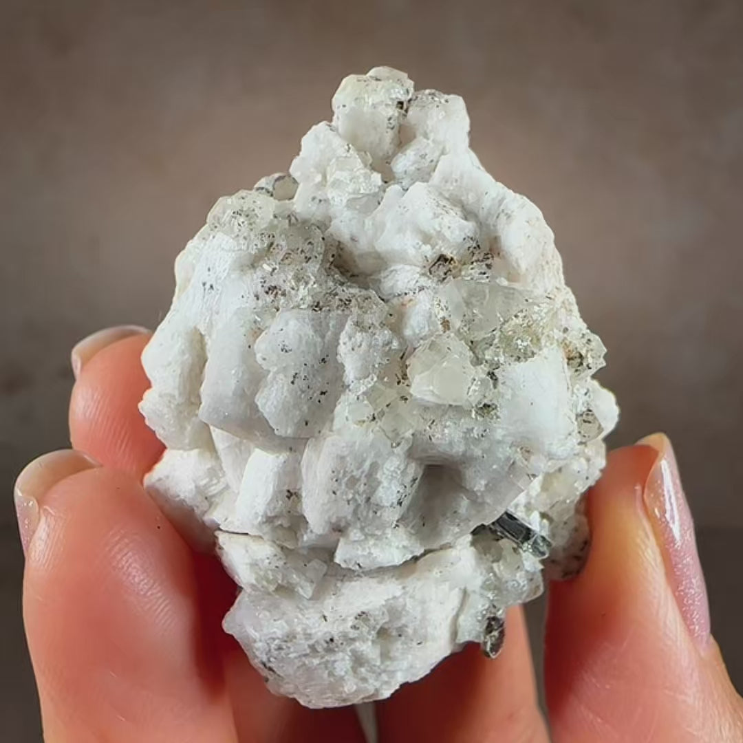 Phenakite on Albite Matrix. A gorgeous Phenakite mineral specimen, this piece has sparkling colorless rhombohedral Phenakite crystals and silver muscovite, on white Albite matrix. A rare find from Mt. Antero, Chaffee Co., Colorado.