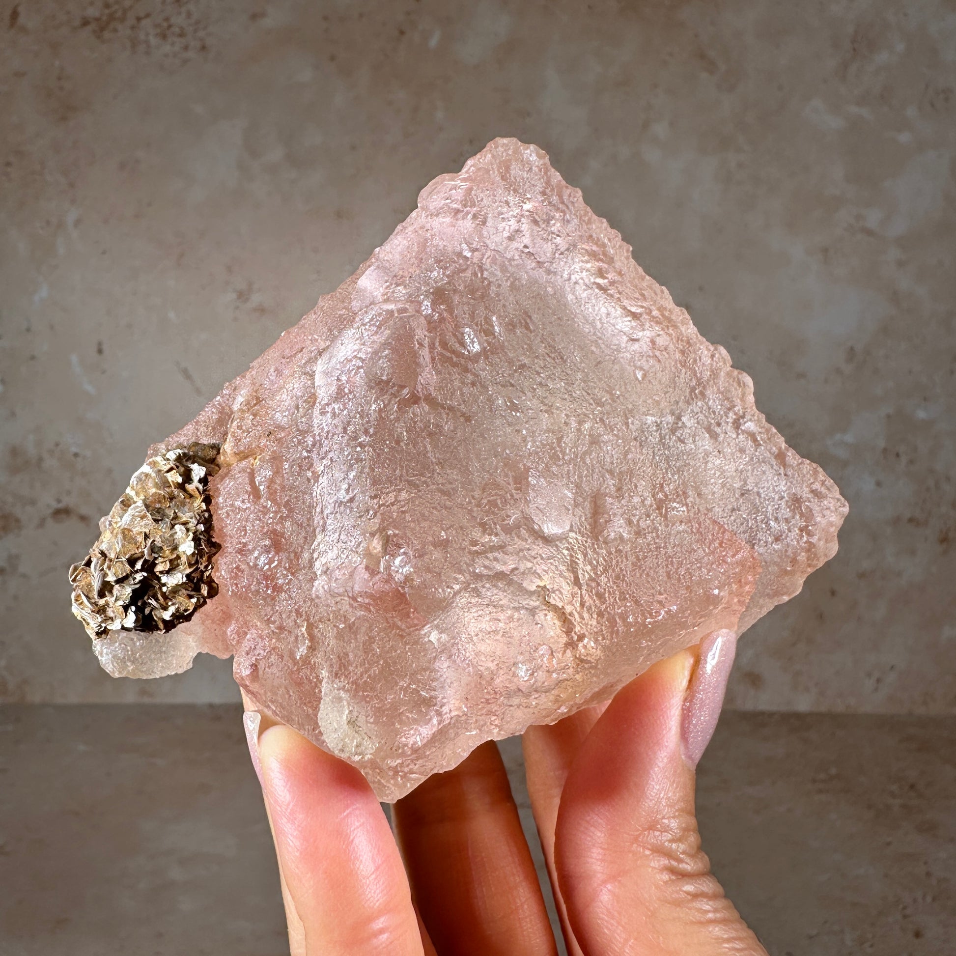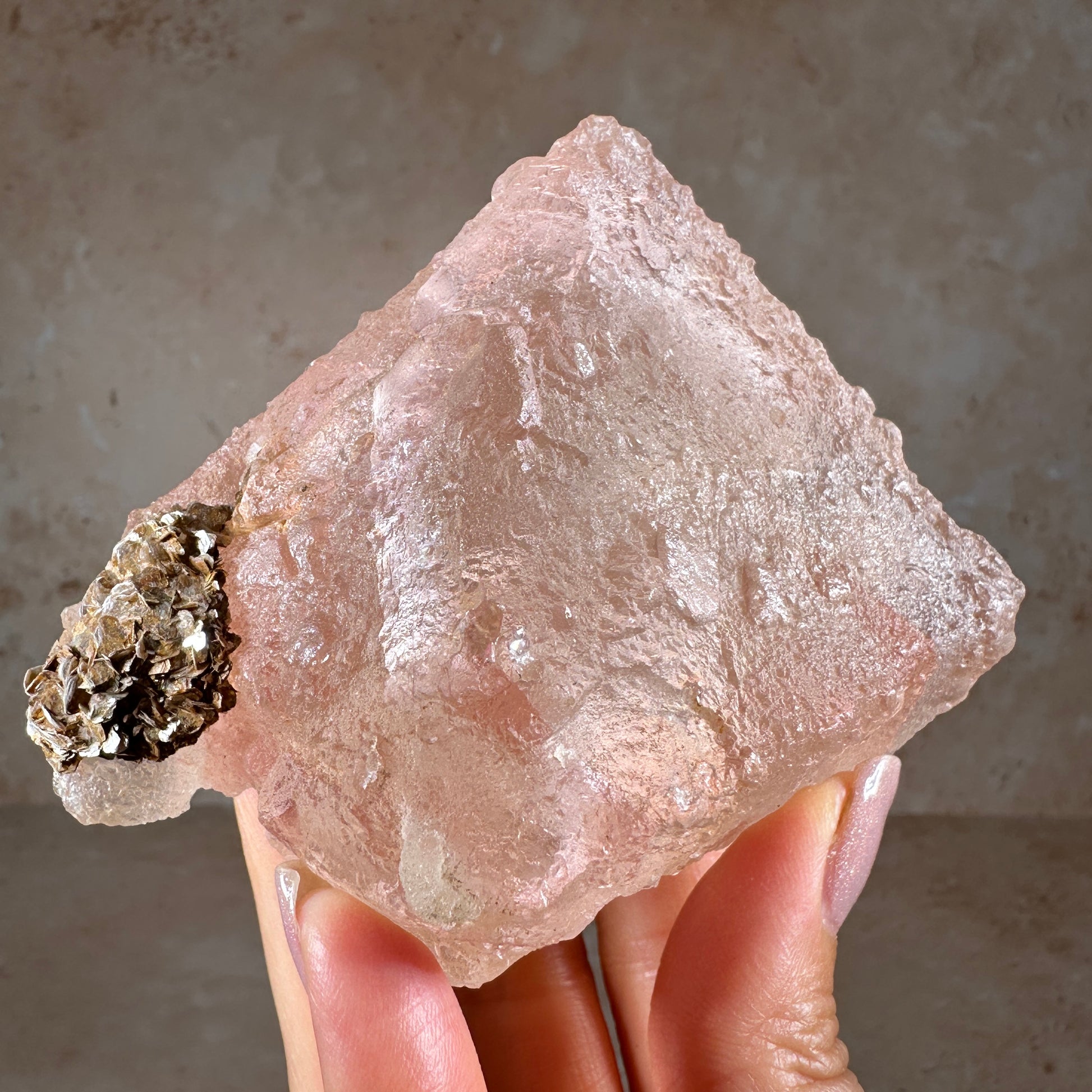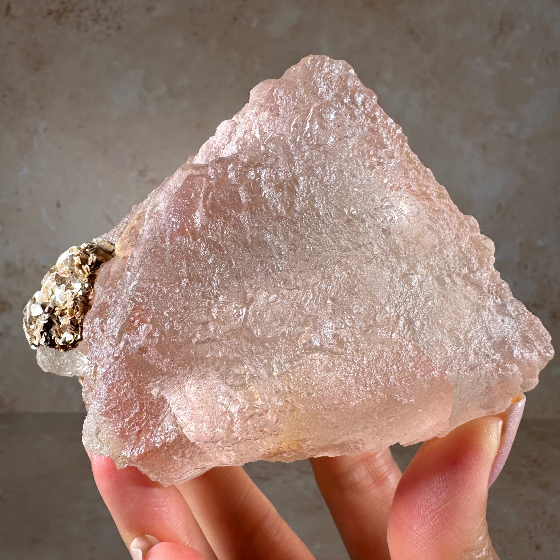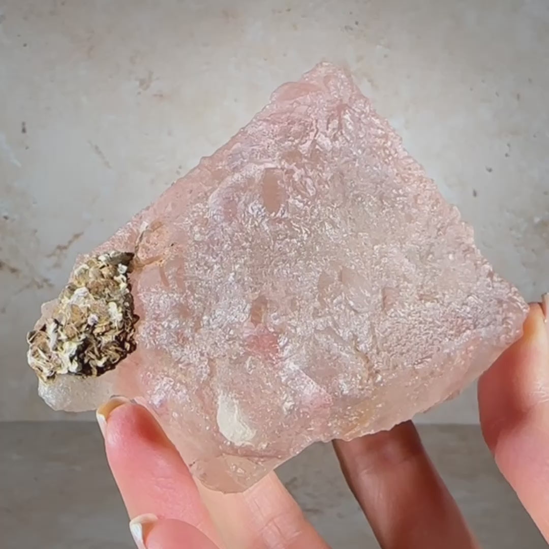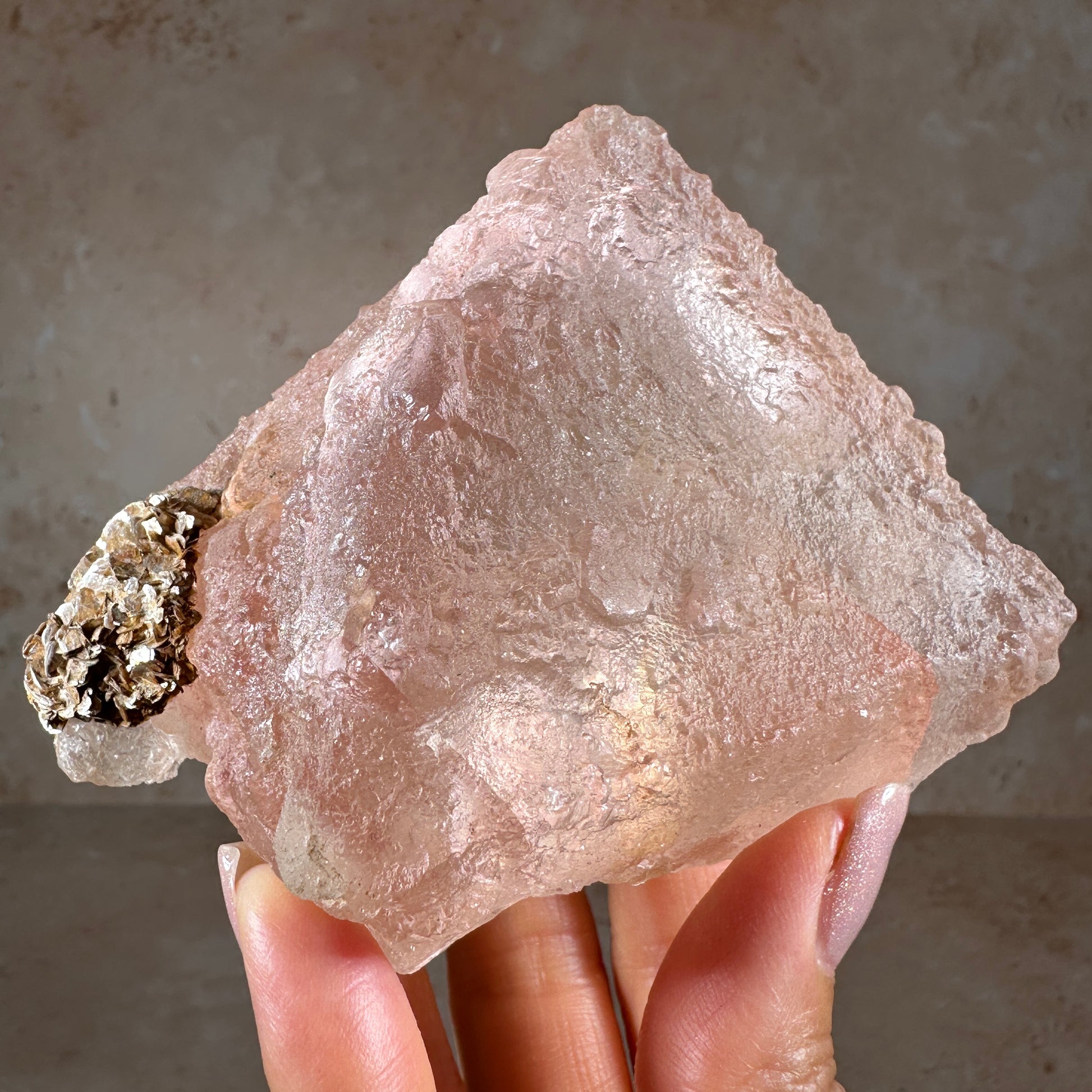Gorgeous pink fluorite specimen with glittering rose gold muscovite. This octahedral fluorite is a soft blush pink with peach undertones, translucent gemmy clarity and a rich textured surface. It radiates a dreamy pastel glow. The contact point can be seen on the bottom of the fluorite, where it was once attached to the host rock. It’s one of those very attractive fluorite specimens that feels soothing when you look at it. Especially when backlit or with side lighting, it’ll be an eye-catching piece in any display case. Pink fluorite is one of the most rare colors and very collectible. This piece is from our personal collection, we acquired it from an old mineral collection owned by geologist, Lee Hogg.