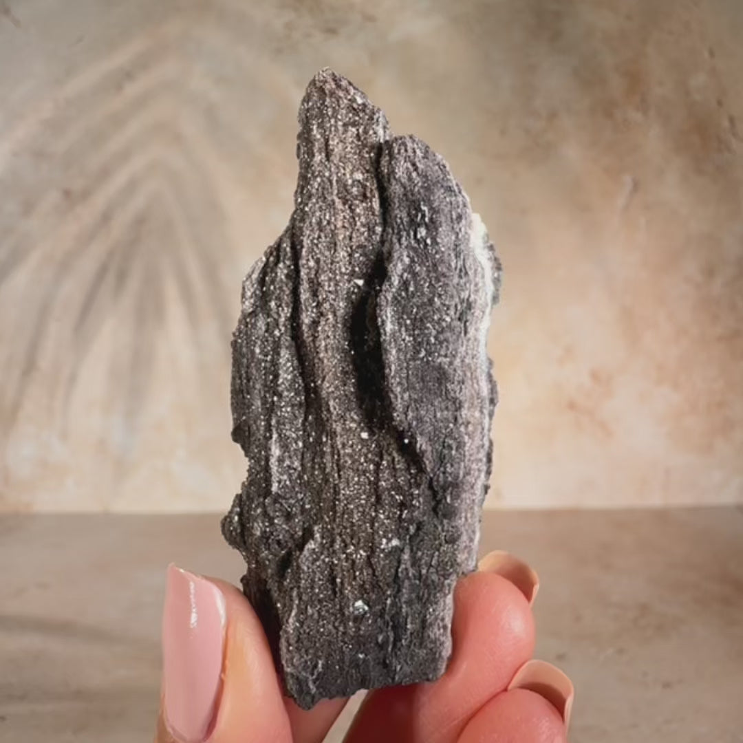 Rare Permineralized Fossil Wood with Smoky Quartz. Glittering Smoky Quartz crystals sparkle like diamonds against a dark velvety background of Carbonized Permineralized Wood. The tree bark is well-preserved on this piece. This Fossil Wood was discovered on a private ranch in Northern Arizona. We acquired the specimens from our friends who dig and clean the wood.