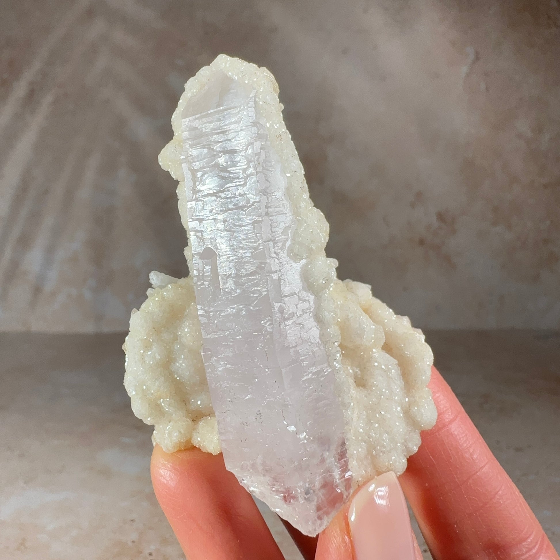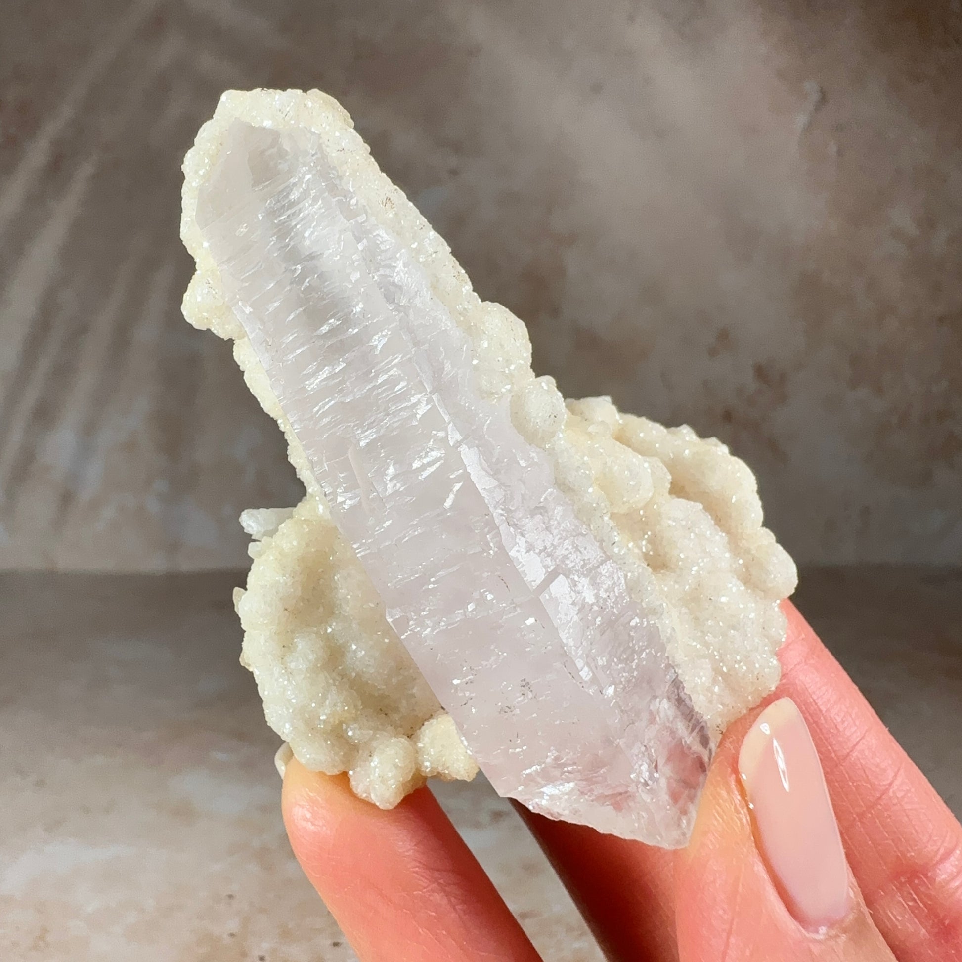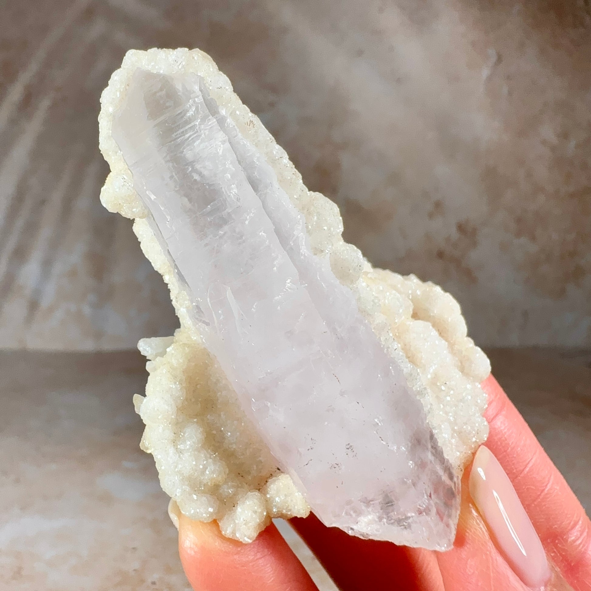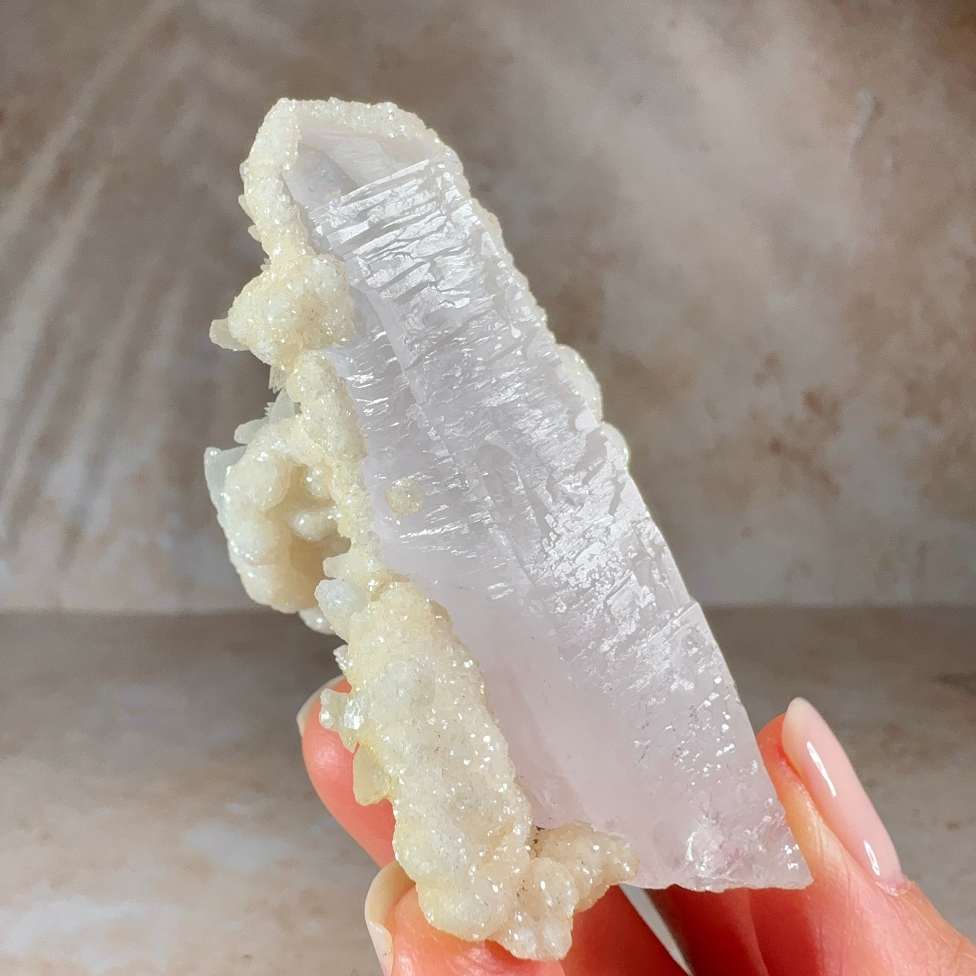 Stunning Sugar Quartz crystal specimen, a rare find from the Cavnic mine in Romania, encrusted with sparkling vanilla-cream color Calcite crystals and microfine Quartz druzy. An exceptional Quartz crystal specimen from our personal collection. This piece sits upright on its own, with the main crystal nested on fanned Calcite formations. Only the Quartz crystal face is exposed, displaying its translucent clarity, etched texture and glassy luster. While the backside of the crystal is completely sugar-coated in druzy crystals, including the termination point. This piece is for the Quartz collector who has an eye for unusual Quartz habits.