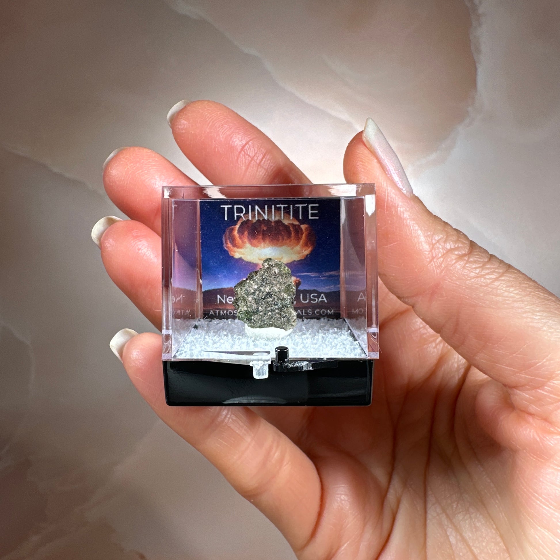 Formed on July 16, 1945, when desert sand melted under the intense heat of the world’s first atomic test, Trinitite is a rare historic glass. Collected in the 1940s–50s before the site was closed, these preserved pieces are highly collectible relics of history.