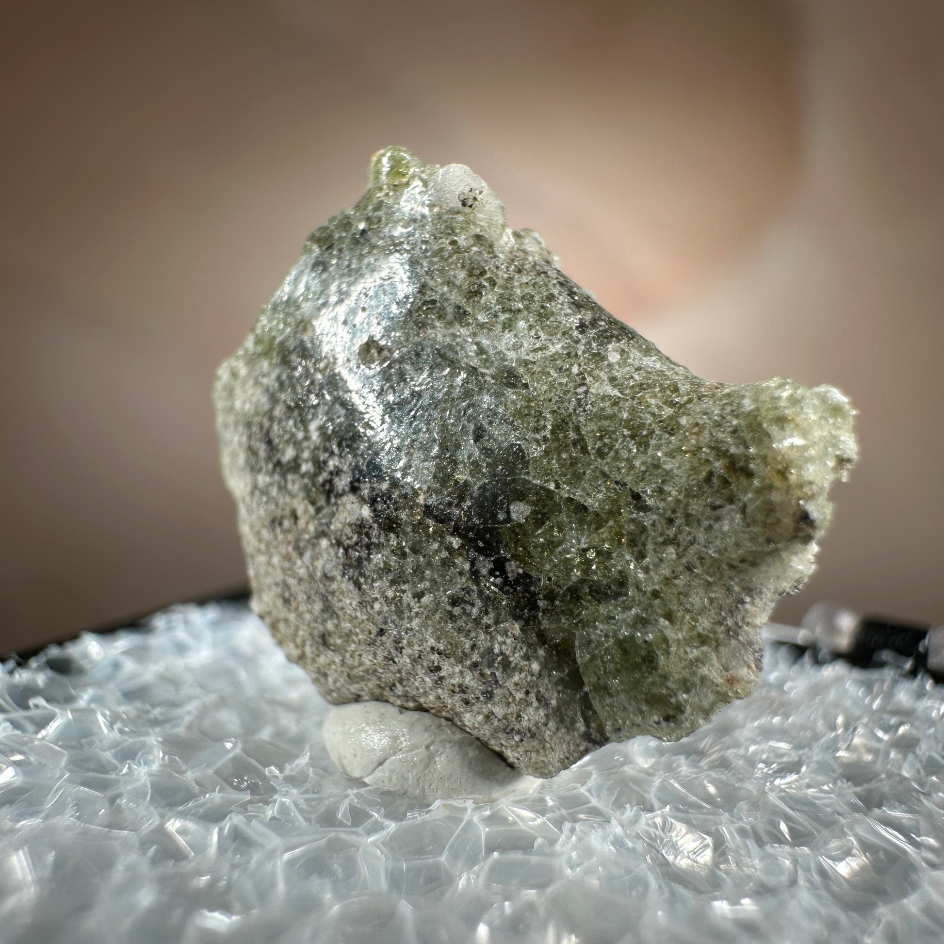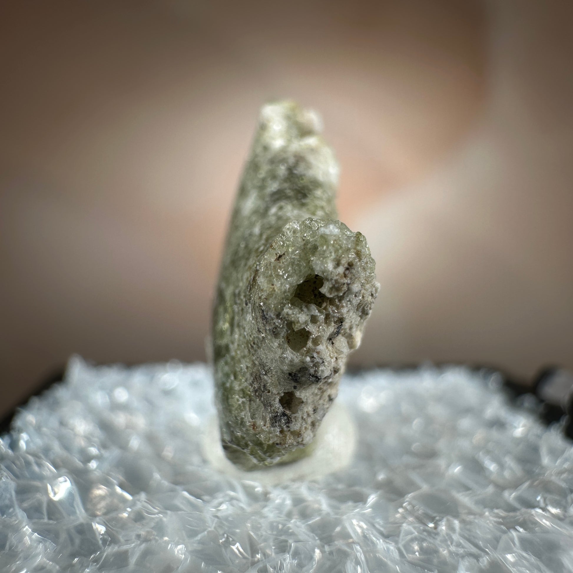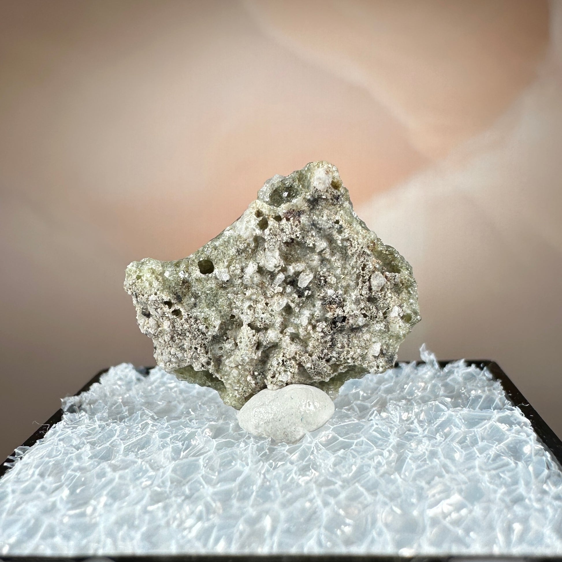 One interesting characteristic of Trinitite, is the sand grain textured bottom, with a smooth melted upper surface. This has lead many to believe these Trinitite pieces were actually formed from sand that was sucked up into the fireball of the explosion and later fell into the crater, rather than simply melting in place beneath the explosion. The Trinity test site is usually off limits, opening only 1-2 times a year for visitors. Our Trinitite is from a former rock shop owner who retired years ago, he had this Trinitite stored away for decades.