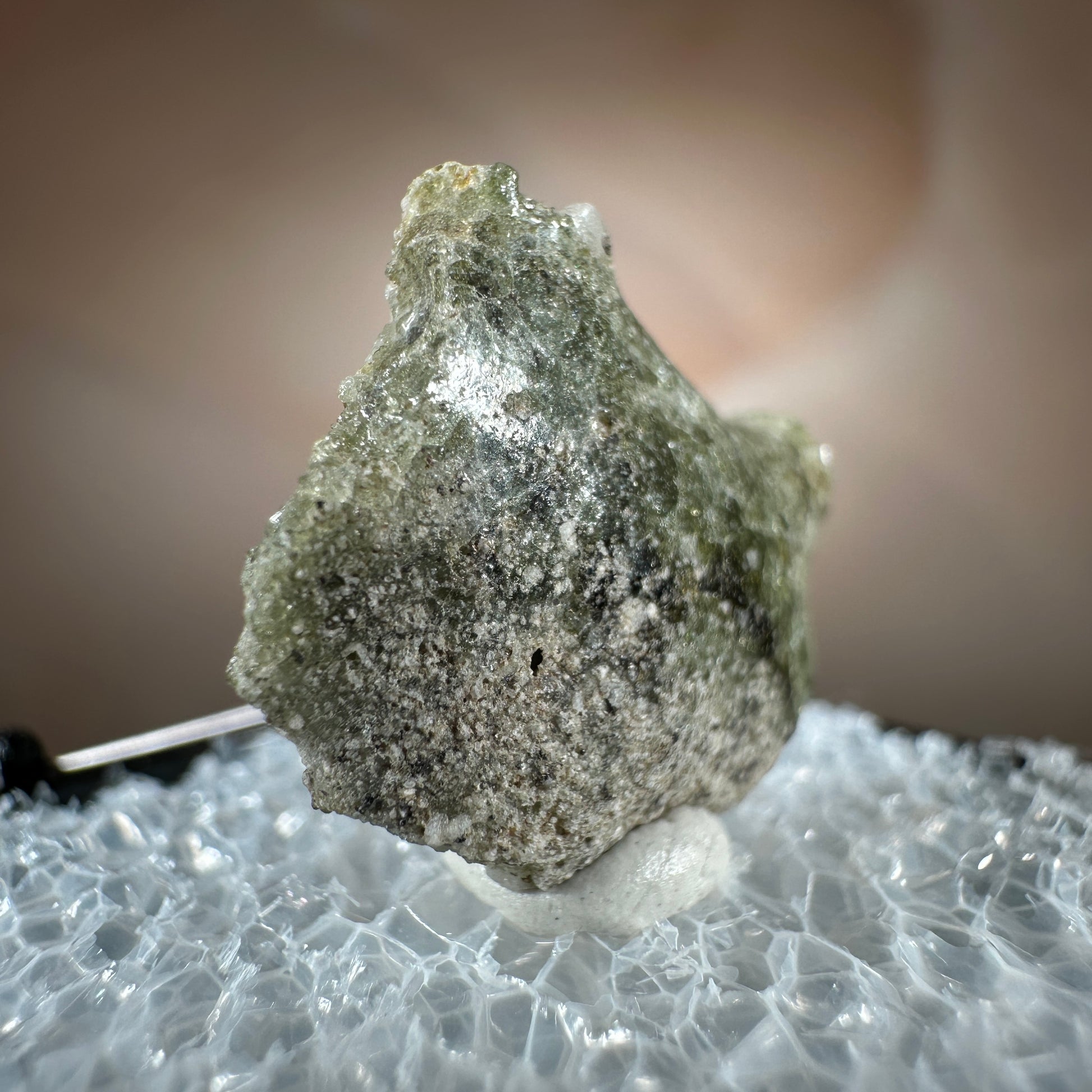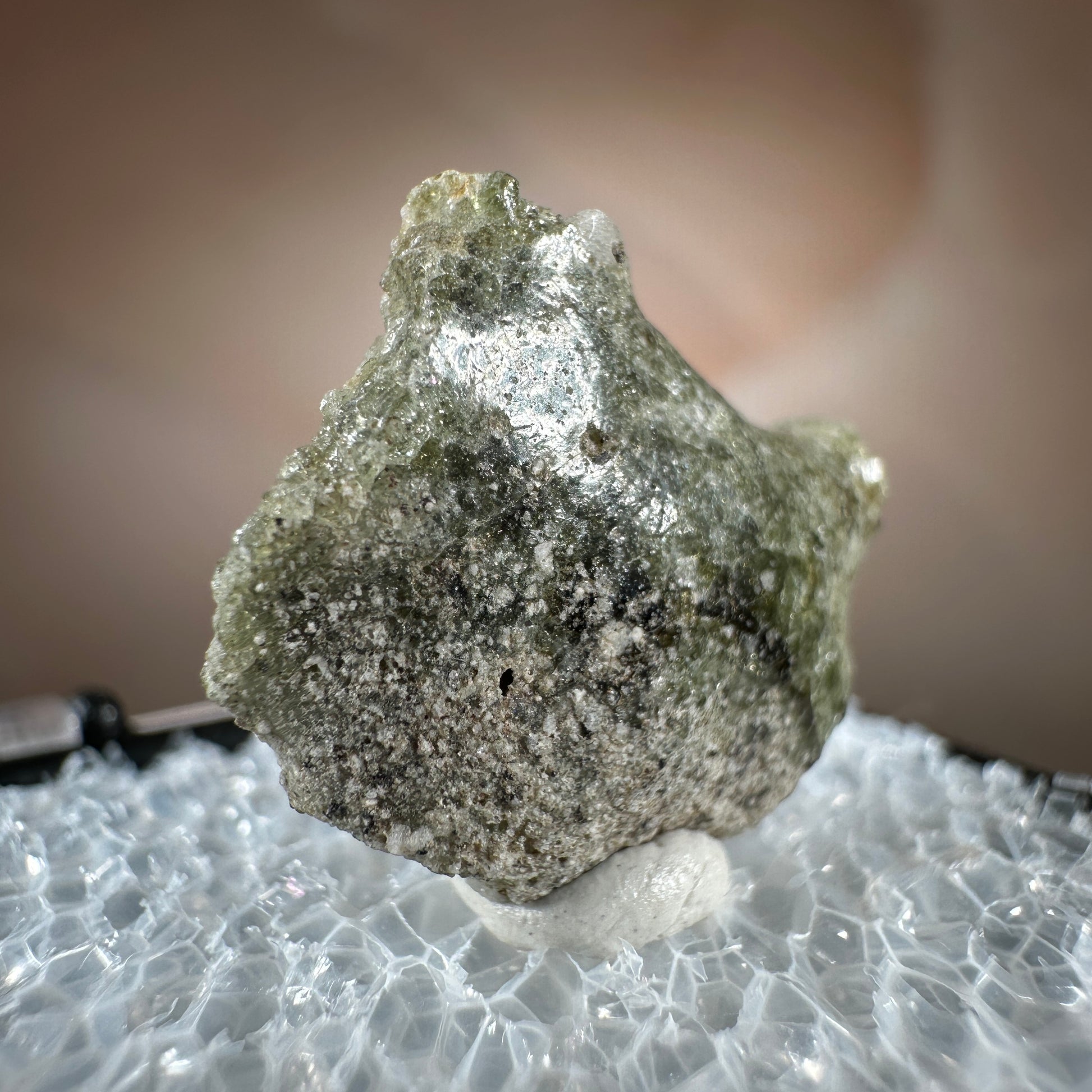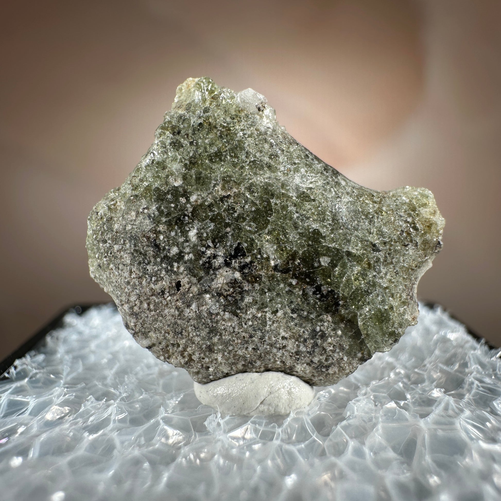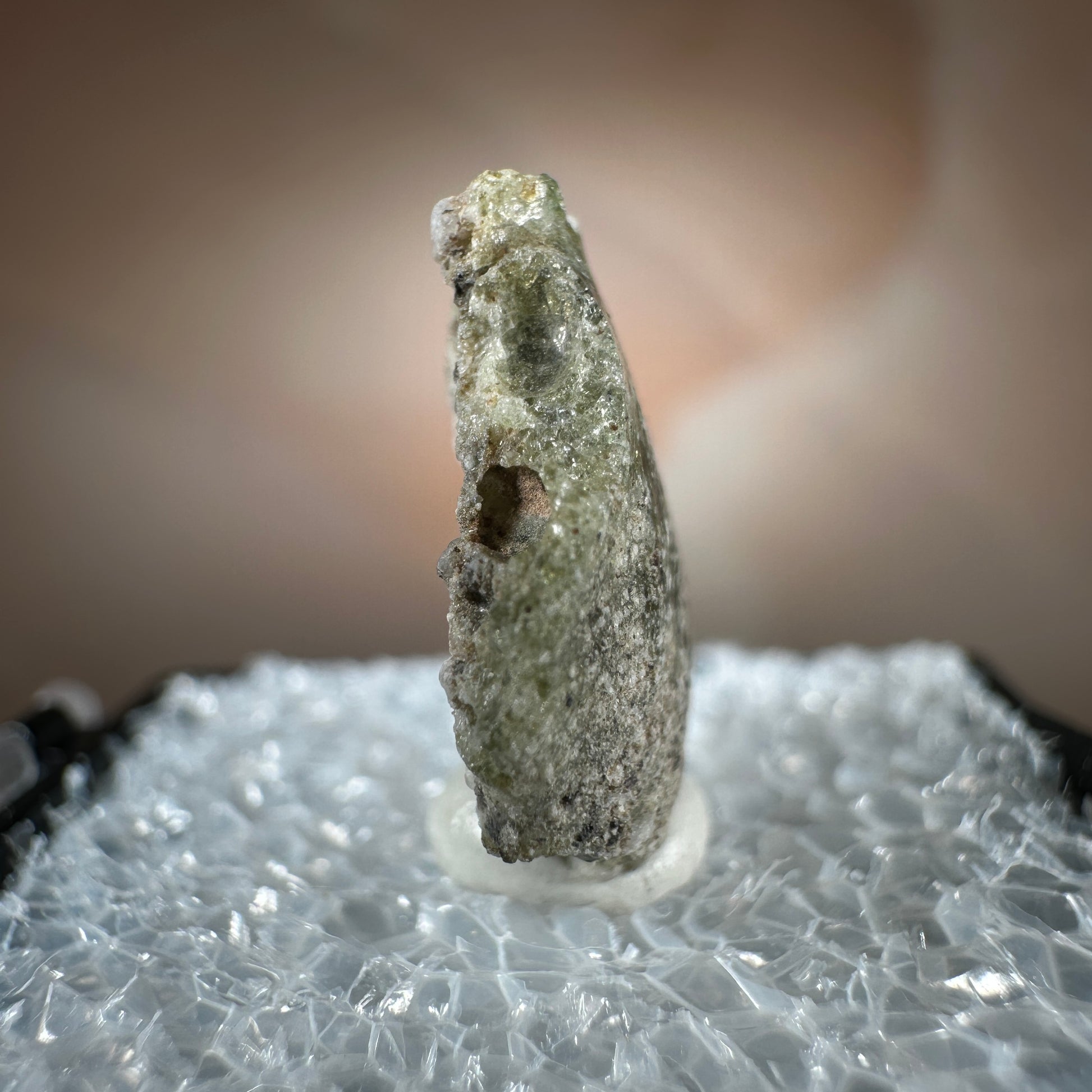One interesting characteristic of Trinitite, is the sand grain textured bottom, with a smooth melted upper surface. This has lead many to believe these Trinitite pieces were actually formed from sand that was sucked up into the fireball of the explosion and later fell into the crater, rather than simply melting in place beneath the explosion. The Trinity test site is usually off limits, opening only 1-2 times a year for visitors. Our Trinitite is from a former rock shop owner who retired years ago, he had this Trinitite stored away for decades.