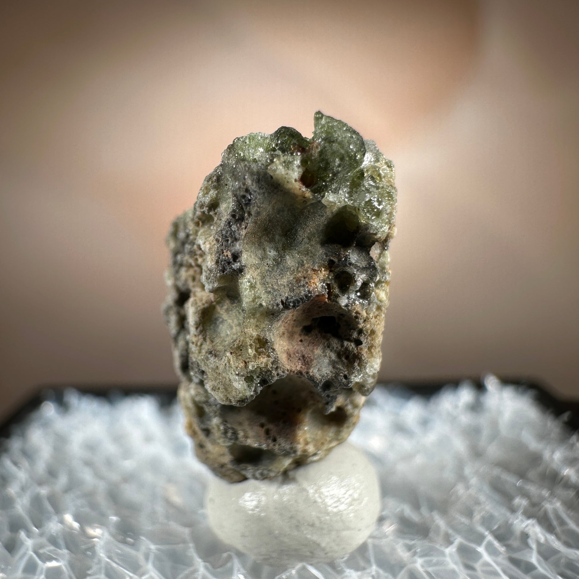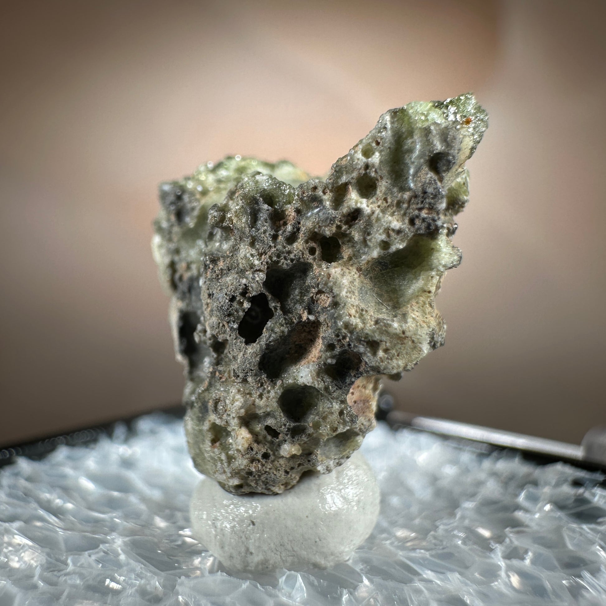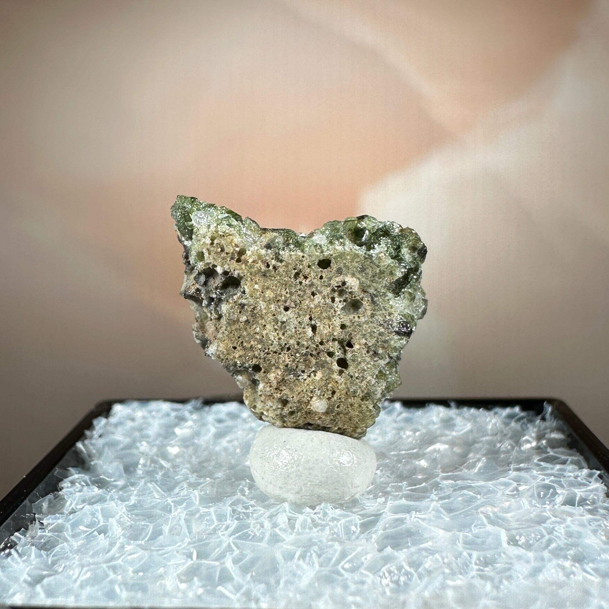 One interesting characteristic of Trinitite, is the sand grain textured bottom, with a smooth melted upper surface. This has lead many to believe these Trinitite pieces were actually formed from sand that was sucked up into the fireball of the explosion and later fell into the crater, rather than simply melting in place beneath the explosion. The Trinity test site is usually off limits, opening only 1-2 times a year for visitors. Our Trinitite is from a former rock shop owner who retired years ago, he had this Trinitite stored away for decades.