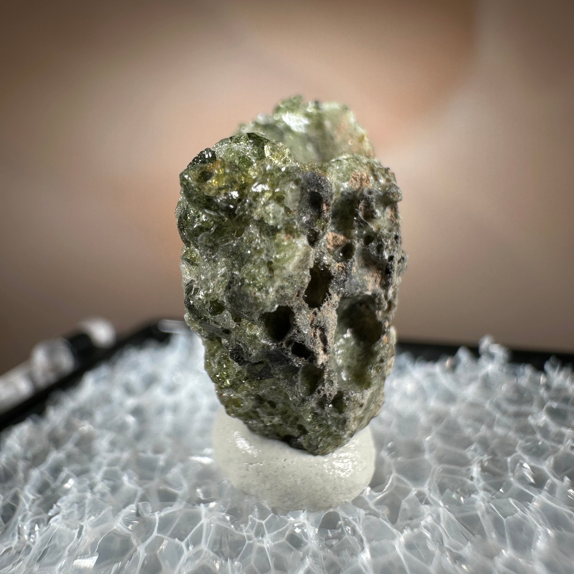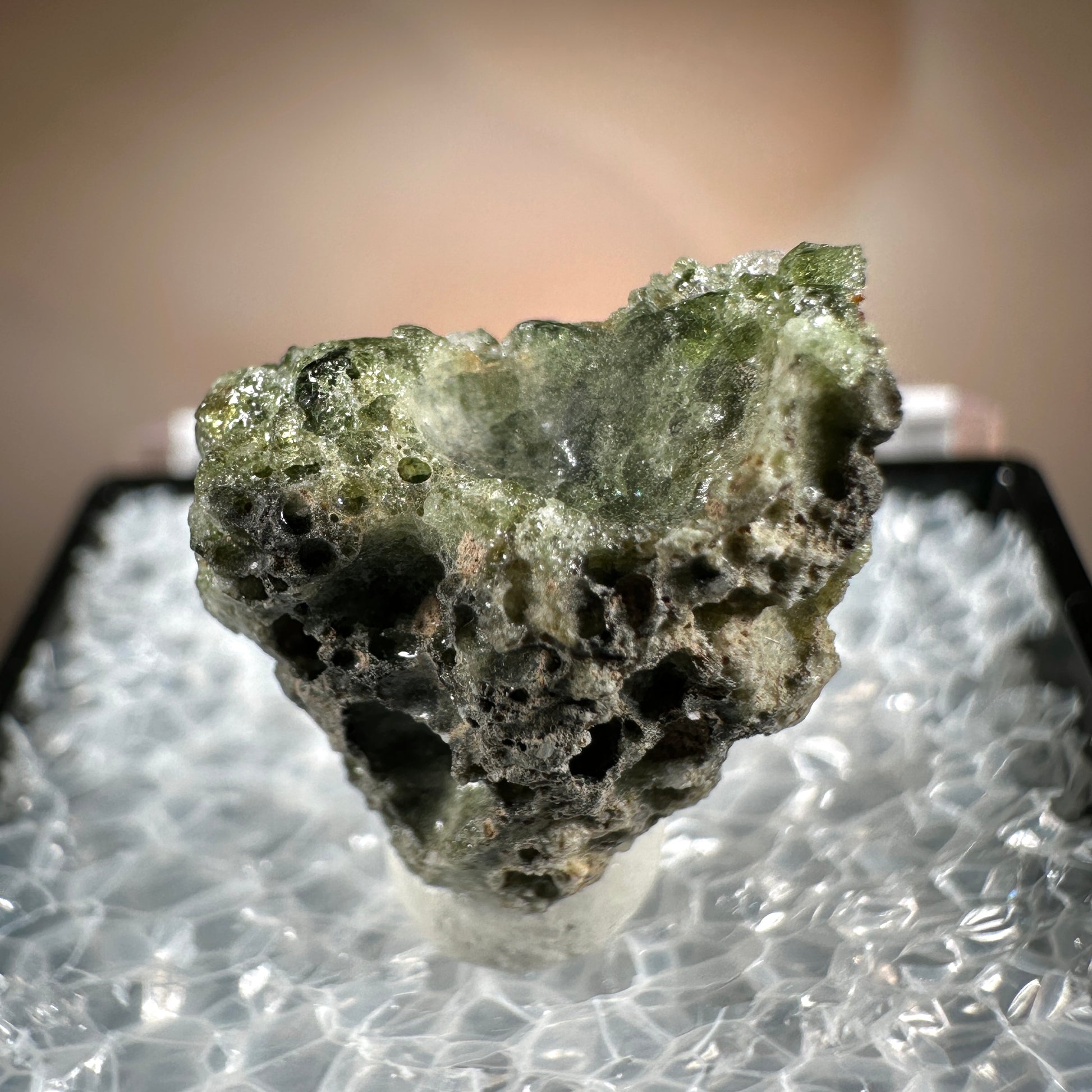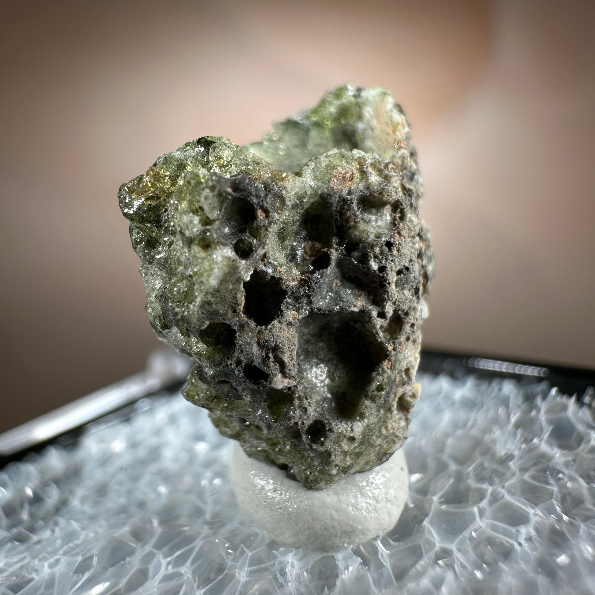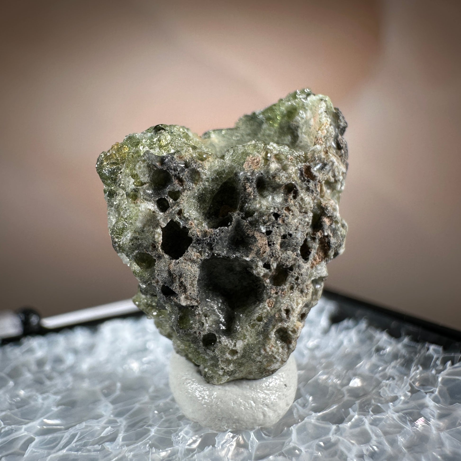 One interesting characteristic of Trinitite, is the sand grain textured bottom, with a smooth melted upper surface. This has lead many to believe these Trinitite pieces were actually formed from sand that was sucked up into the fireball of the explosion and later fell into the crater, rather than simply melting in place beneath the explosion. The Trinity test site is usually off limits, opening only 1-2 times a year for visitors. Our Trinitite is from a former rock shop owner who retired years ago, he had this Trinitite stored away for decades.