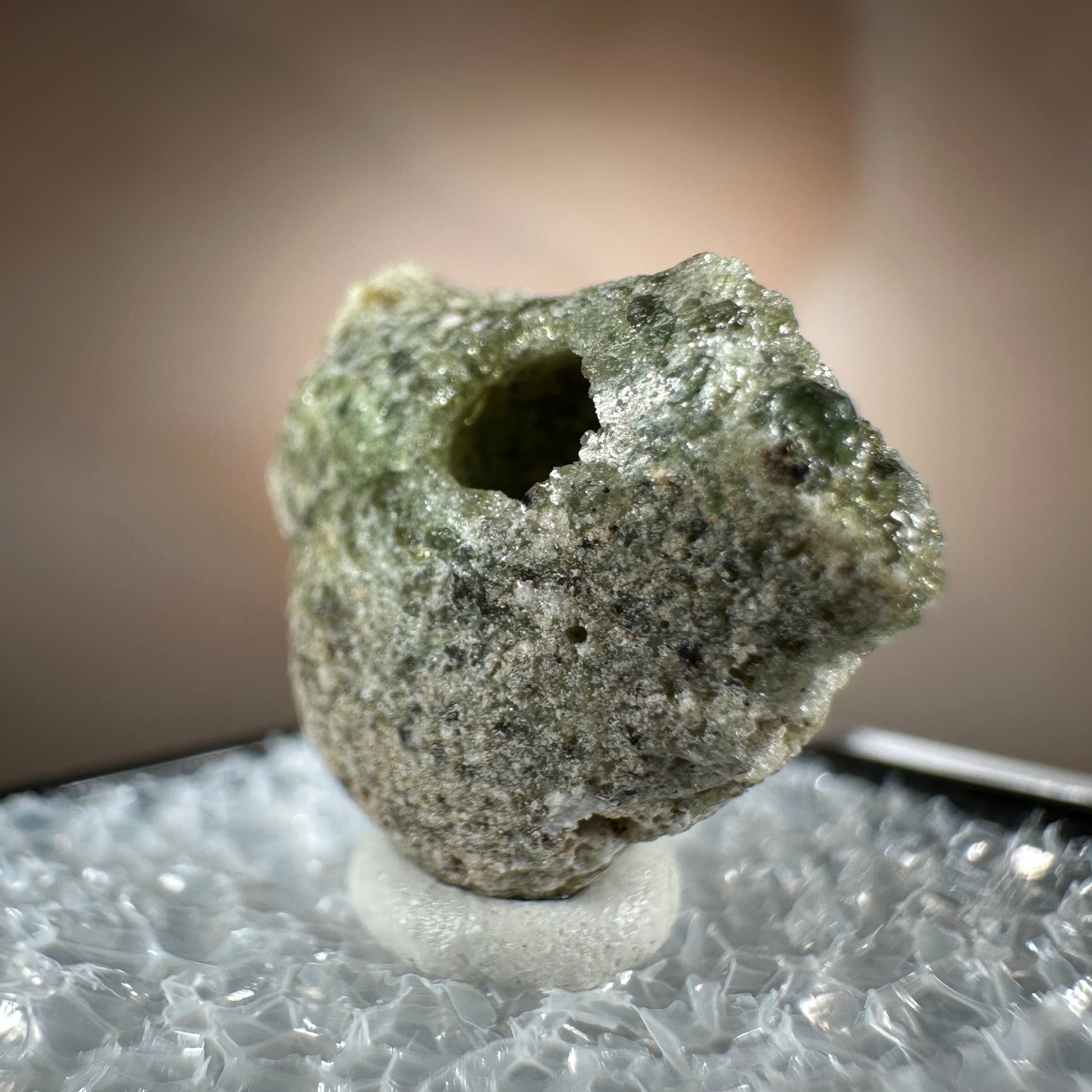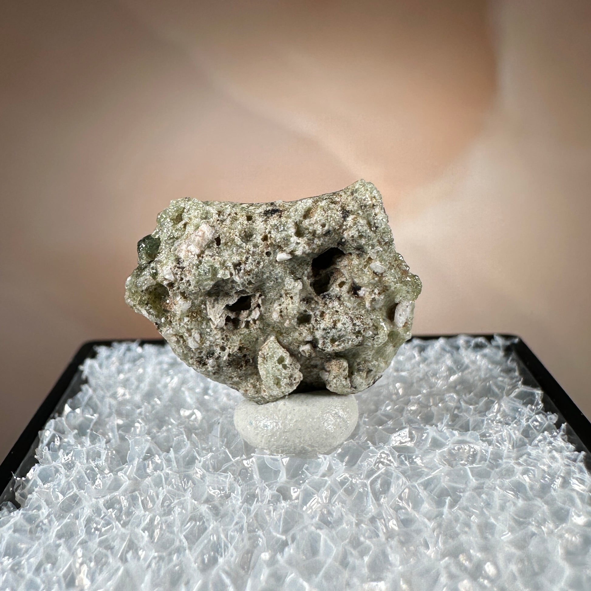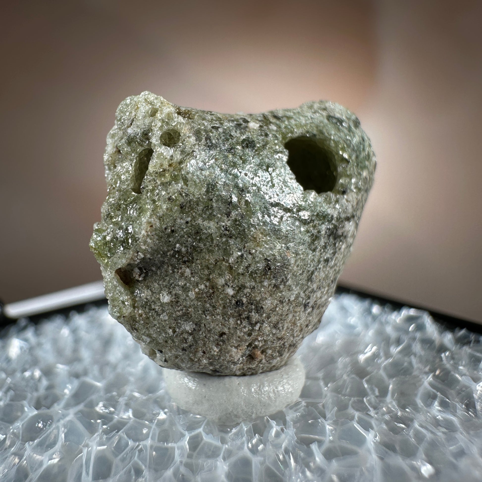 One interesting characteristic of Trinitite, is the sand grain textured bottom, with a smooth melted upper surface. This has lead many to believe these Trinitite pieces were actually formed from sand that was sucked up into the fireball of the explosion and later fell into the crater, rather than simply melting in place beneath the explosion. The Trinity test site is usually off limits, opening only 1-2 times a year for visitors. Our Trinitite is from a former rock shop owner who retired years ago, he had this Trinitite stored away for decades.