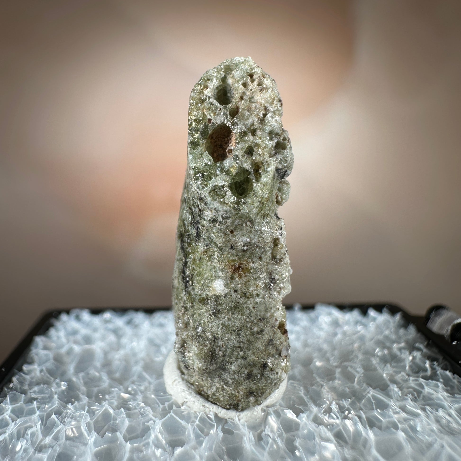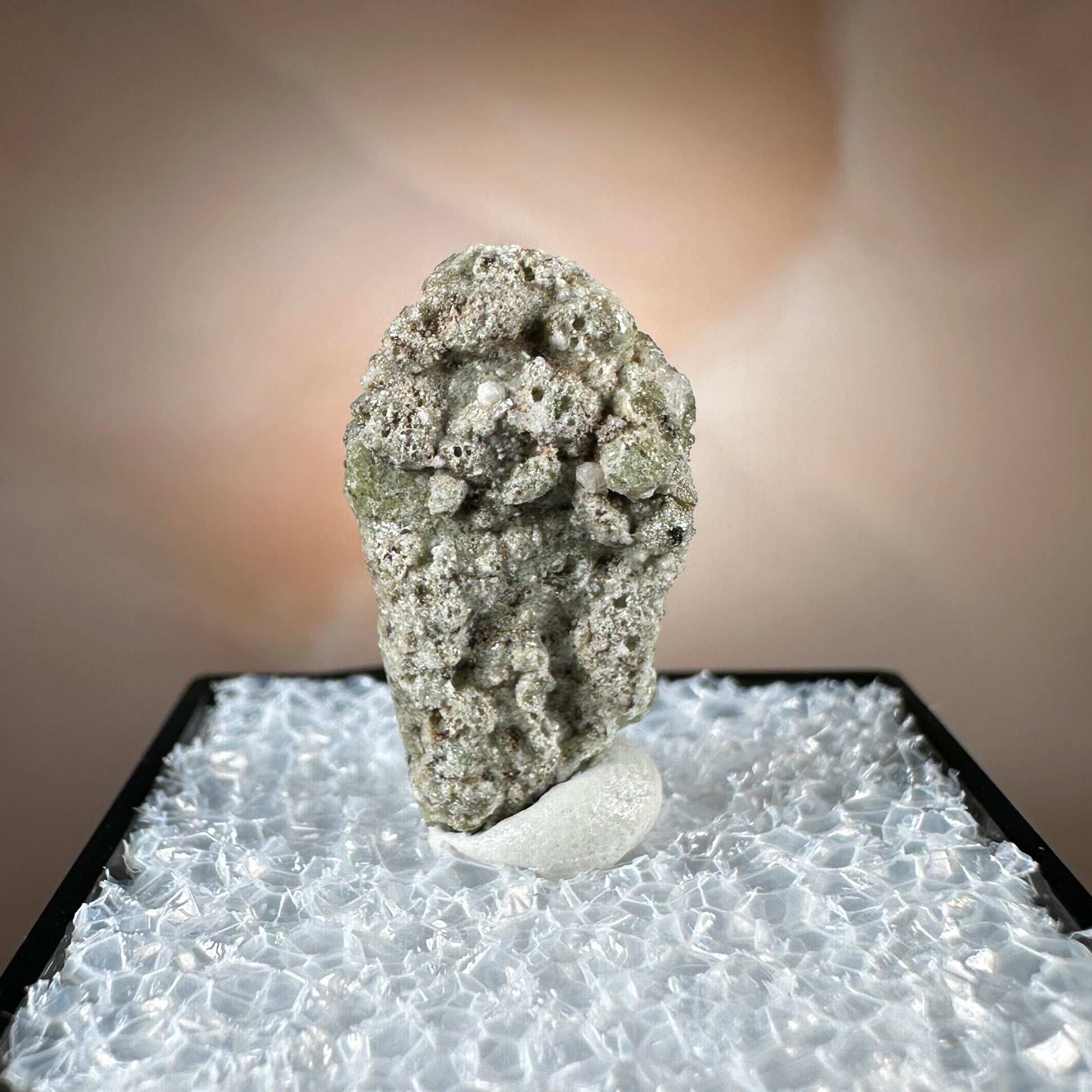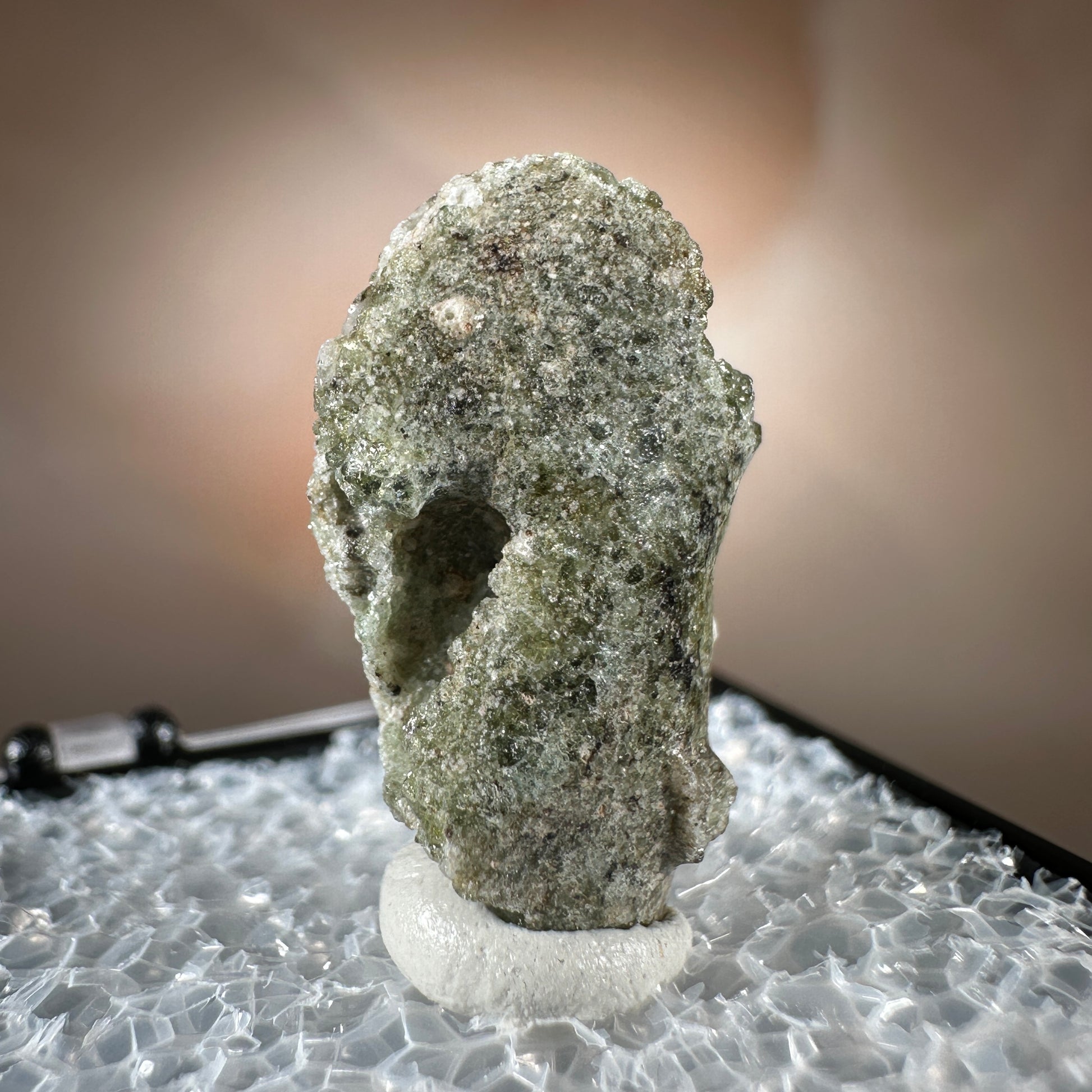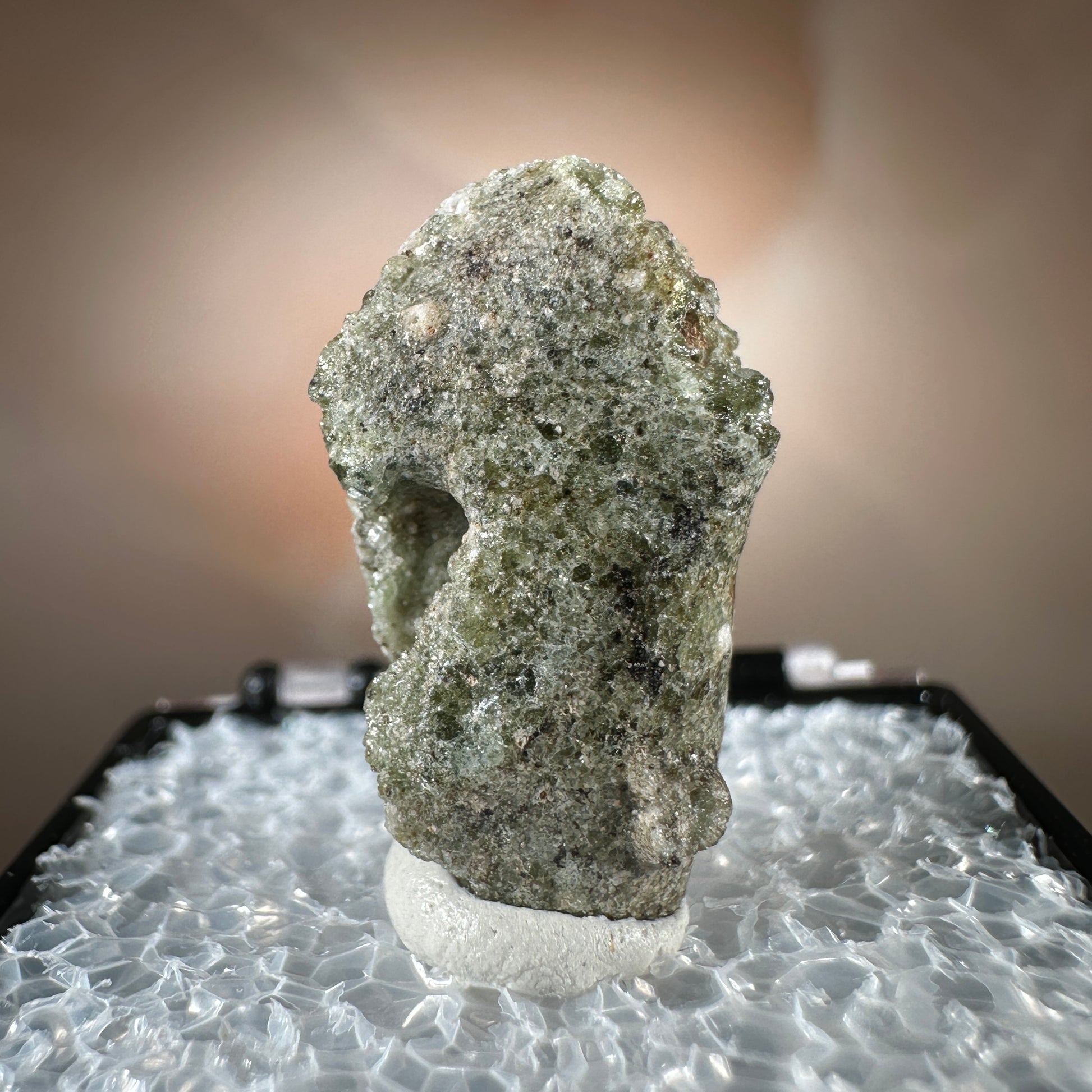 One interesting characteristic of Trinitite, is the sand grain textured bottom, with a smooth melted upper surface. This has lead many to believe these Trinitite pieces were actually formed from sand that was sucked up into the fireball of the explosion and later fell into the crater, rather than simply melting in place beneath the explosion. The Trinity test site is usually off limits, opening only 1-2 times a year for visitors. Our Trinitite is from a former rock shop owner who retired years ago, he had this Trinitite stored away for decades.