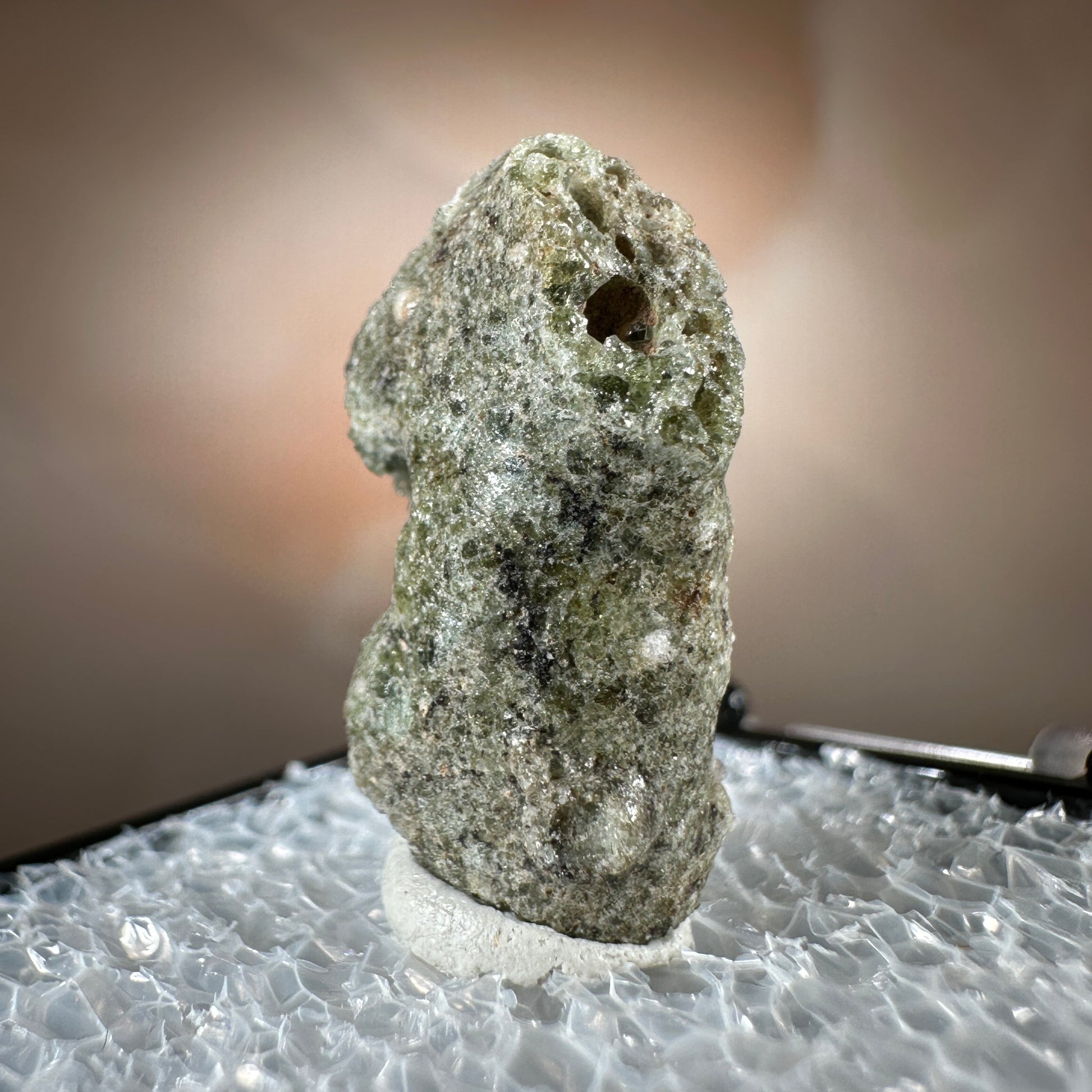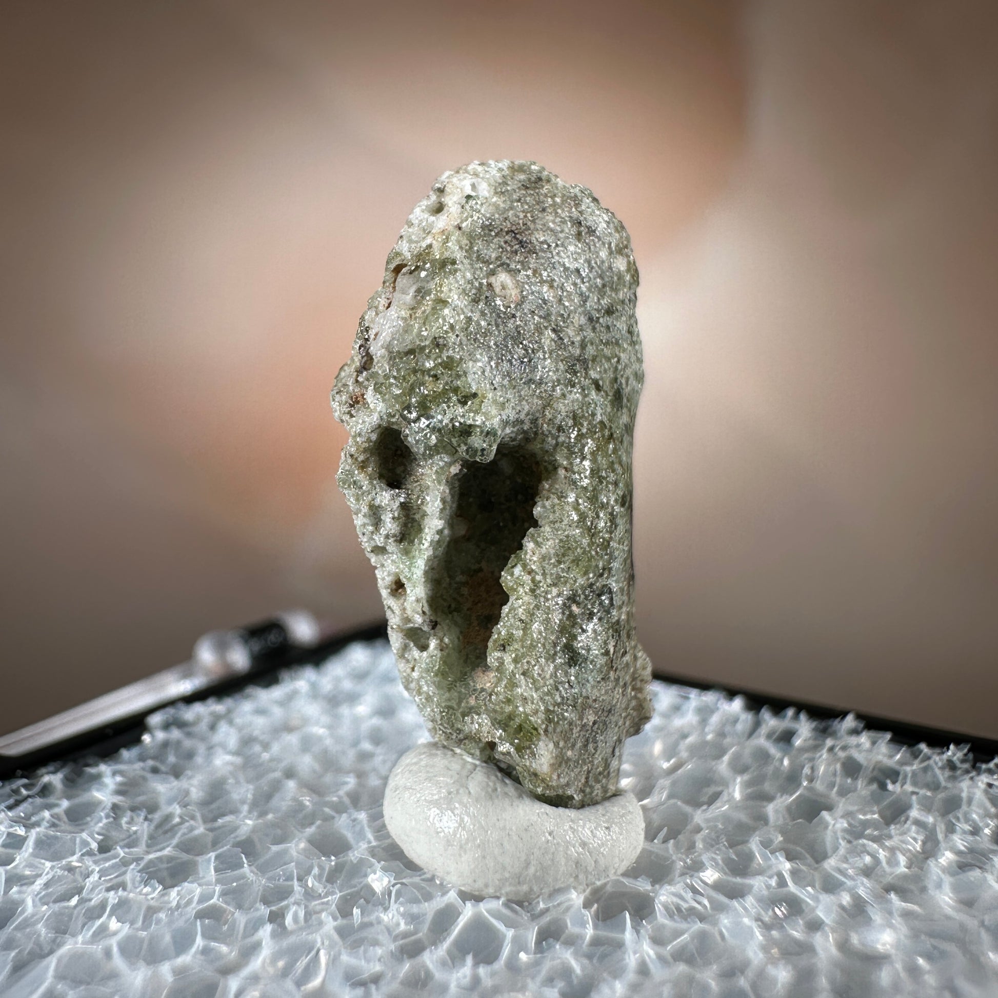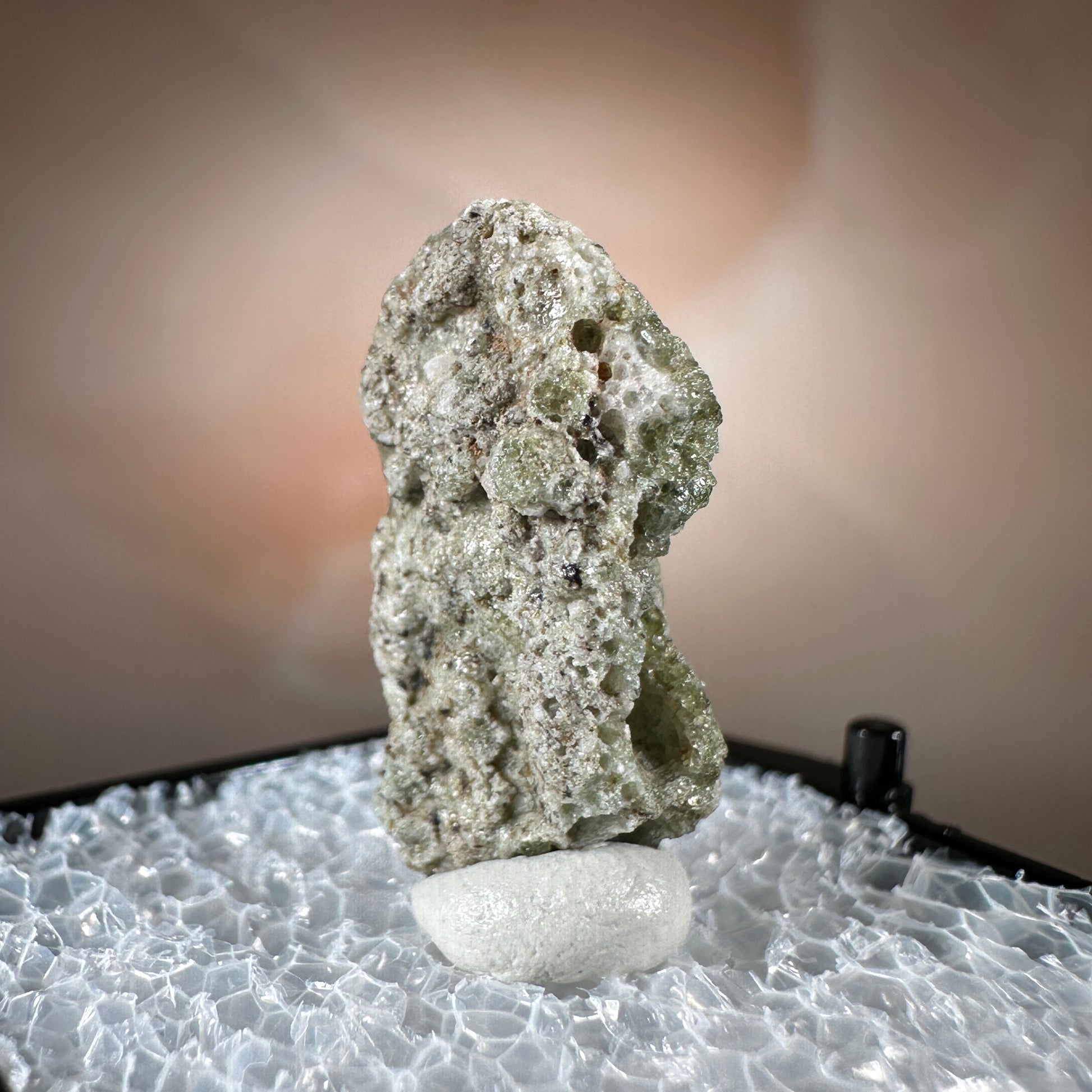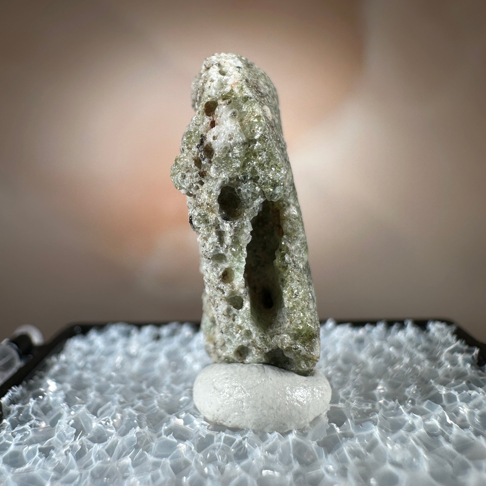 One interesting characteristic of Trinitite, is the sand grain textured bottom, with a smooth melted upper surface. This has lead many to believe these Trinitite pieces were actually formed from sand that was sucked up into the fireball of the explosion and later fell into the crater, rather than simply melting in place beneath the explosion. The Trinity test site is usually off limits, opening only 1-2 times a year for visitors. Our Trinitite is from a former rock shop owner who retired years ago, he had this Trinitite stored away for decades.