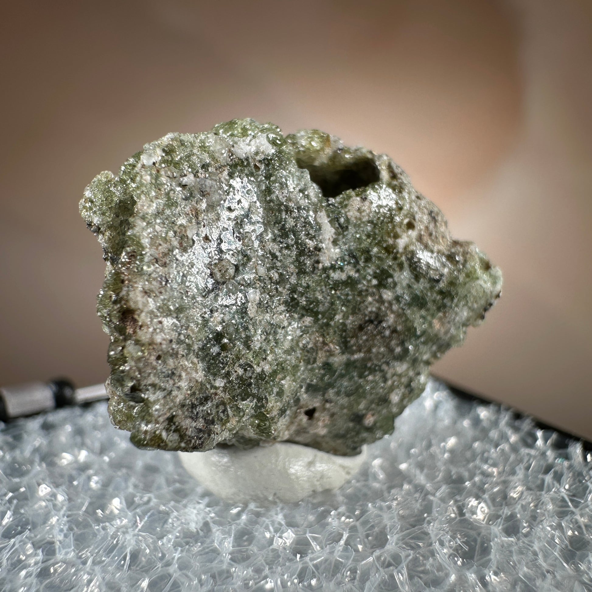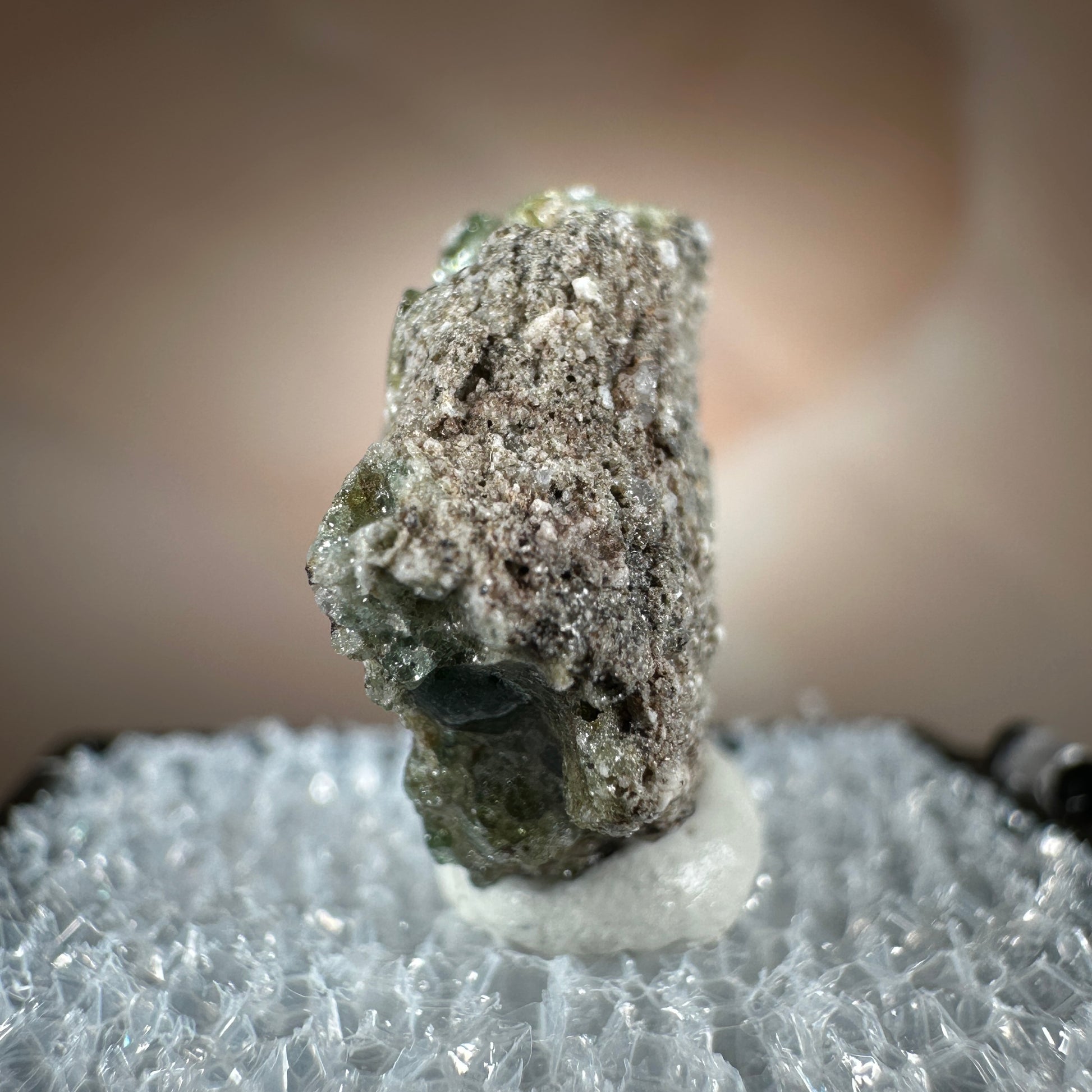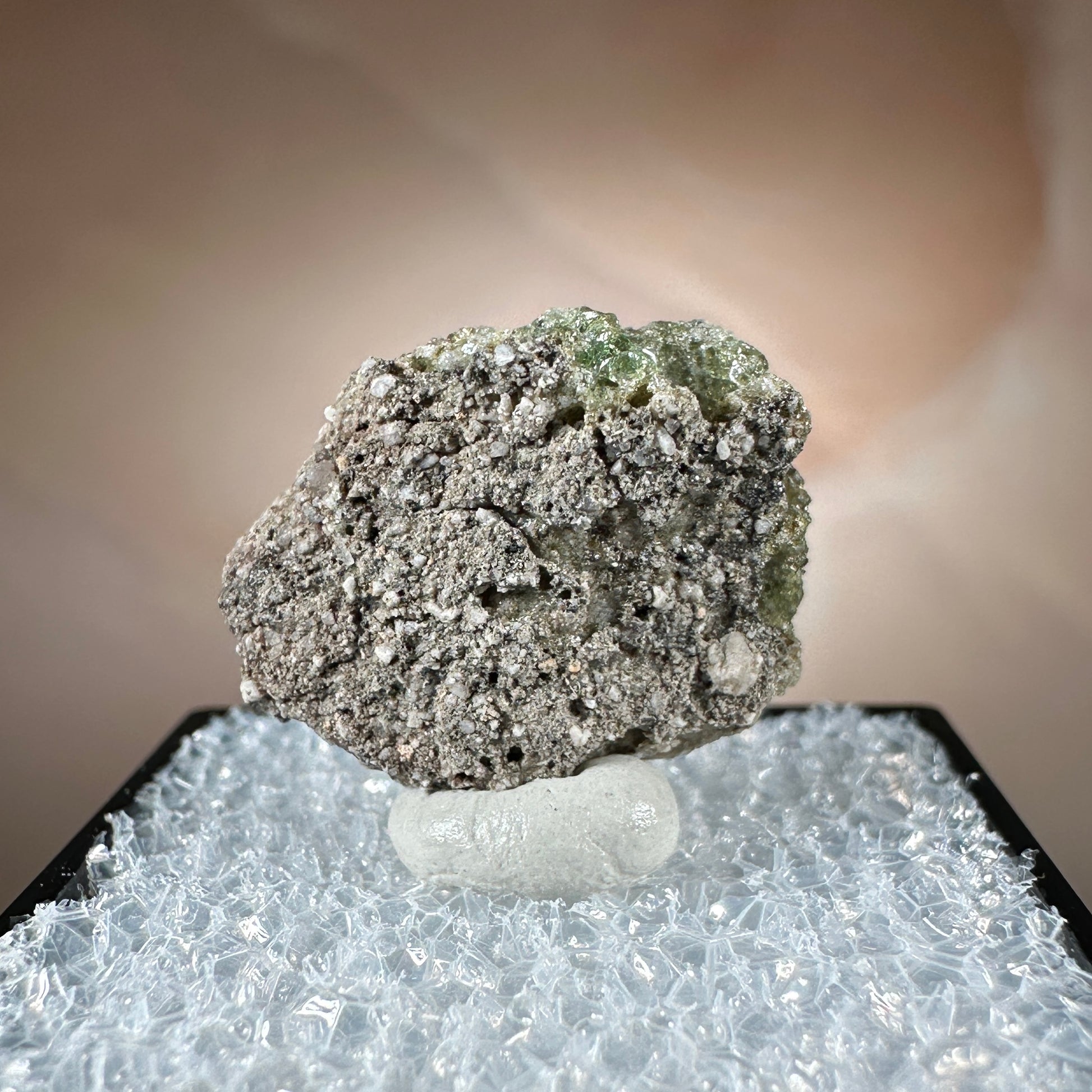 One interesting characteristic of Trinitite, is the sand grain textured bottom, with a smooth melted upper surface. This has lead many to believe these Trinitite pieces were actually formed from sand that was sucked up into the fireball of the explosion and later fell into the crater, rather than simply melting in place beneath the explosion. The Trinity test site is usually off limits, opening only 1-2 times a year for visitors. Our Trinitite is from a former rock shop owner who retired years ago, he had this Trinitite stored away for decades.