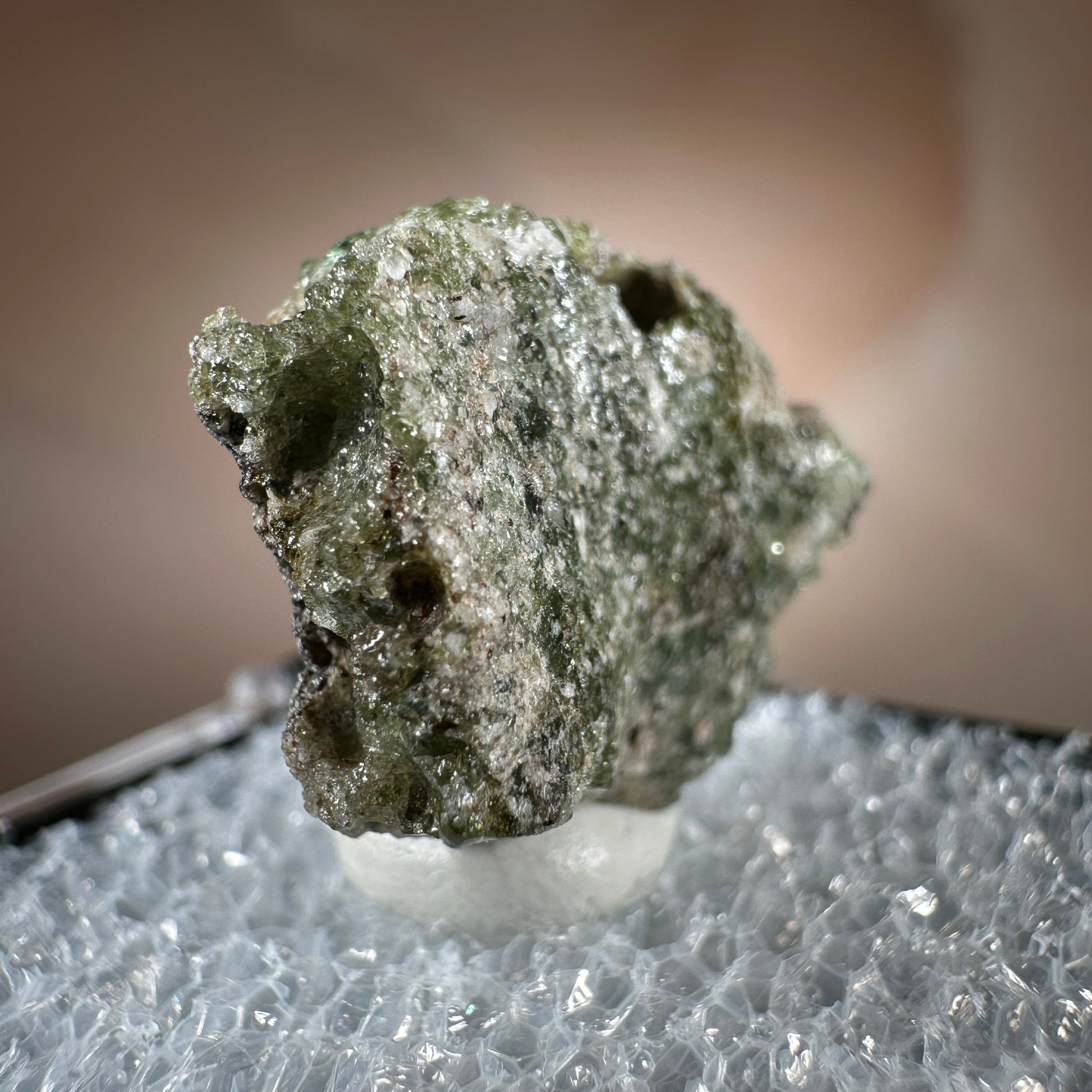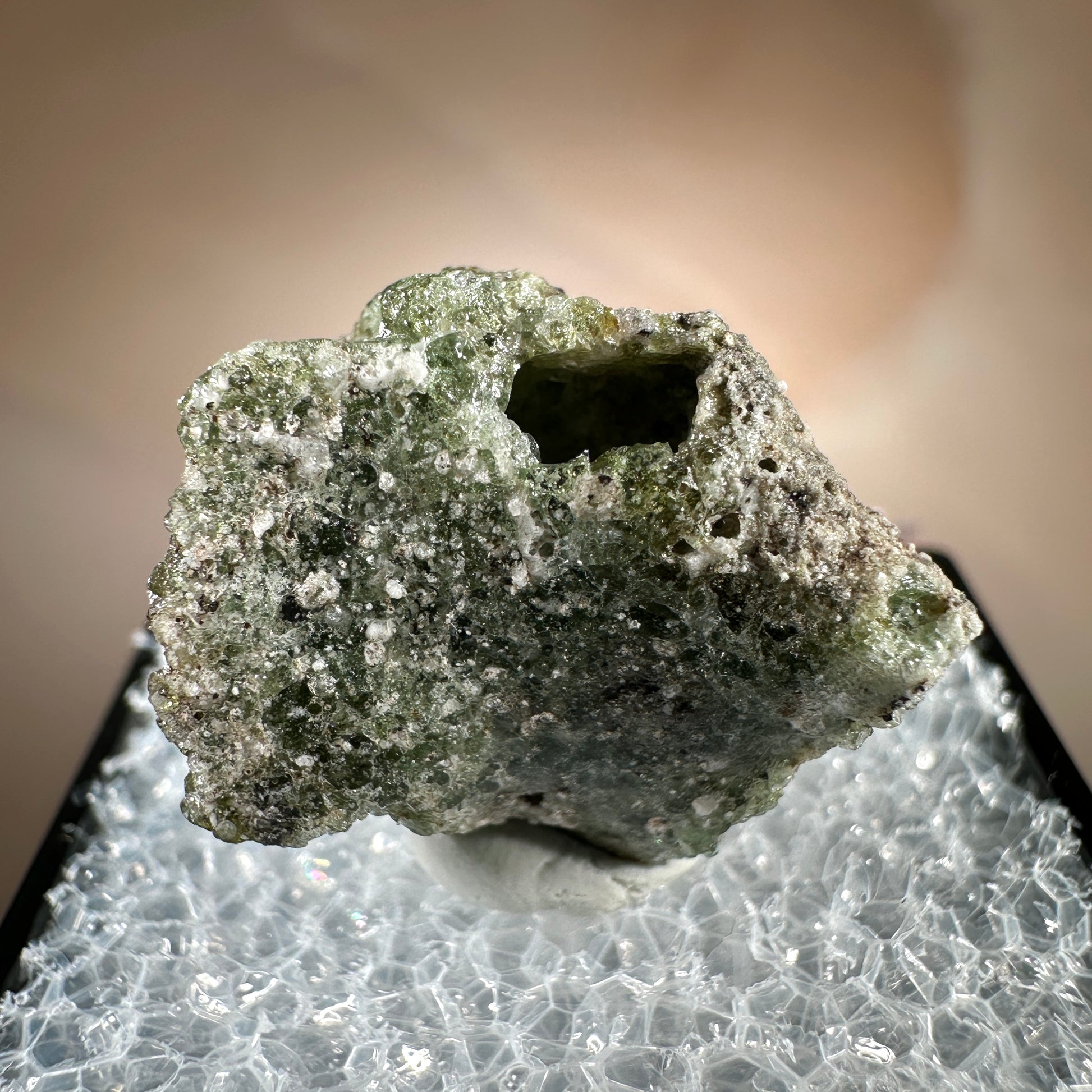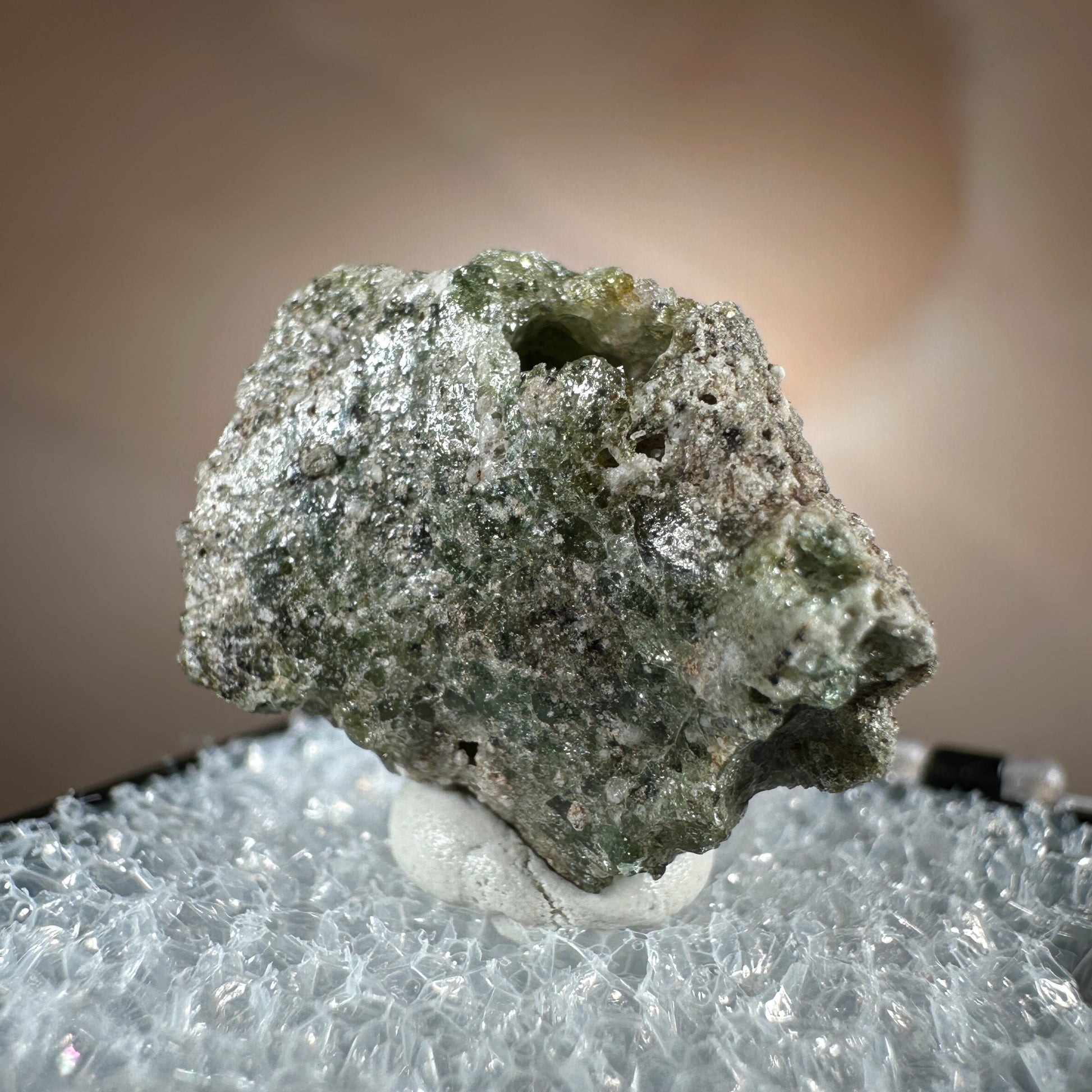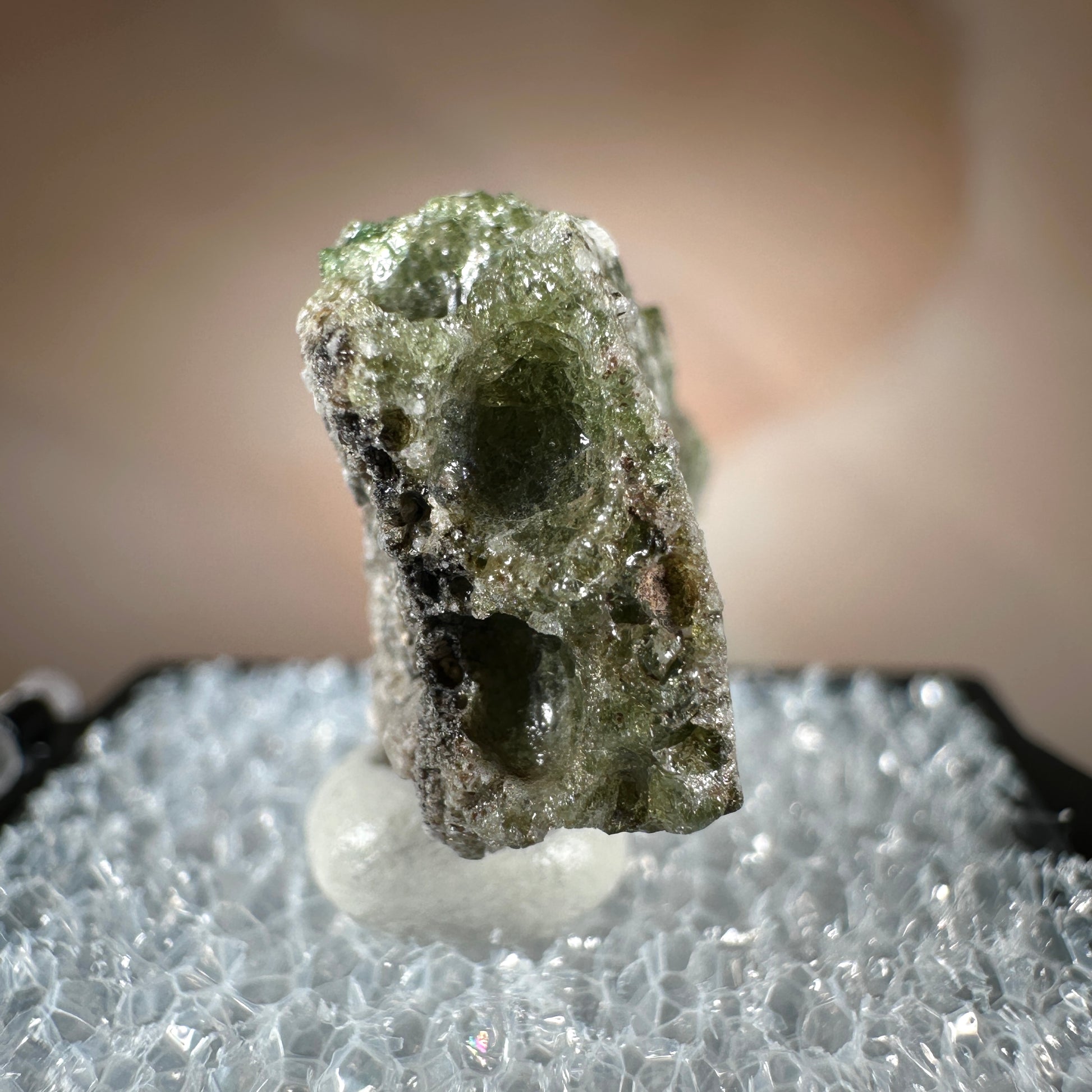 One interesting characteristic of Trinitite, is the sand grain textured bottom, with a smooth melted upper surface. This has lead many to believe these Trinitite pieces were actually formed from sand that was sucked up into the fireball of the explosion and later fell into the crater, rather than simply melting in place beneath the explosion. The Trinity test site is usually off limits, opening only 1-2 times a year for visitors. Our Trinitite is from a former rock shop owner who retired years ago, he had this Trinitite stored away for decades.