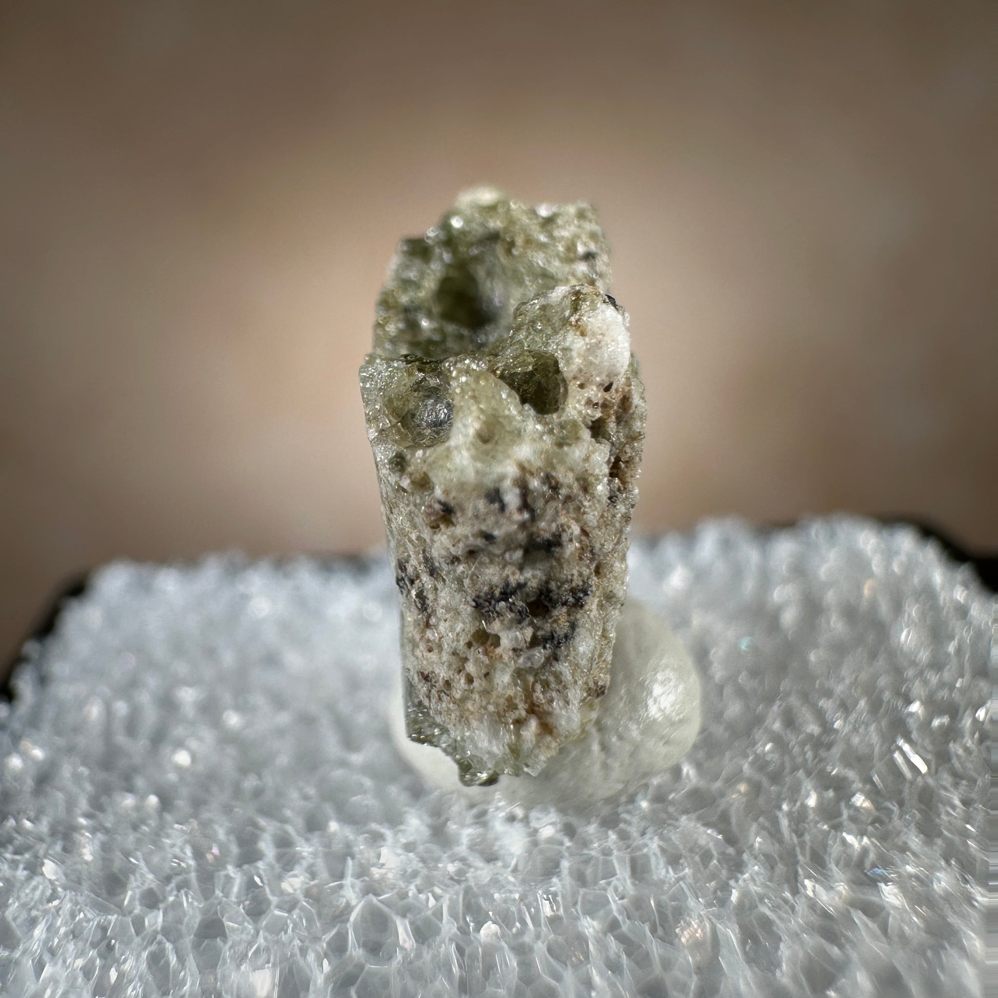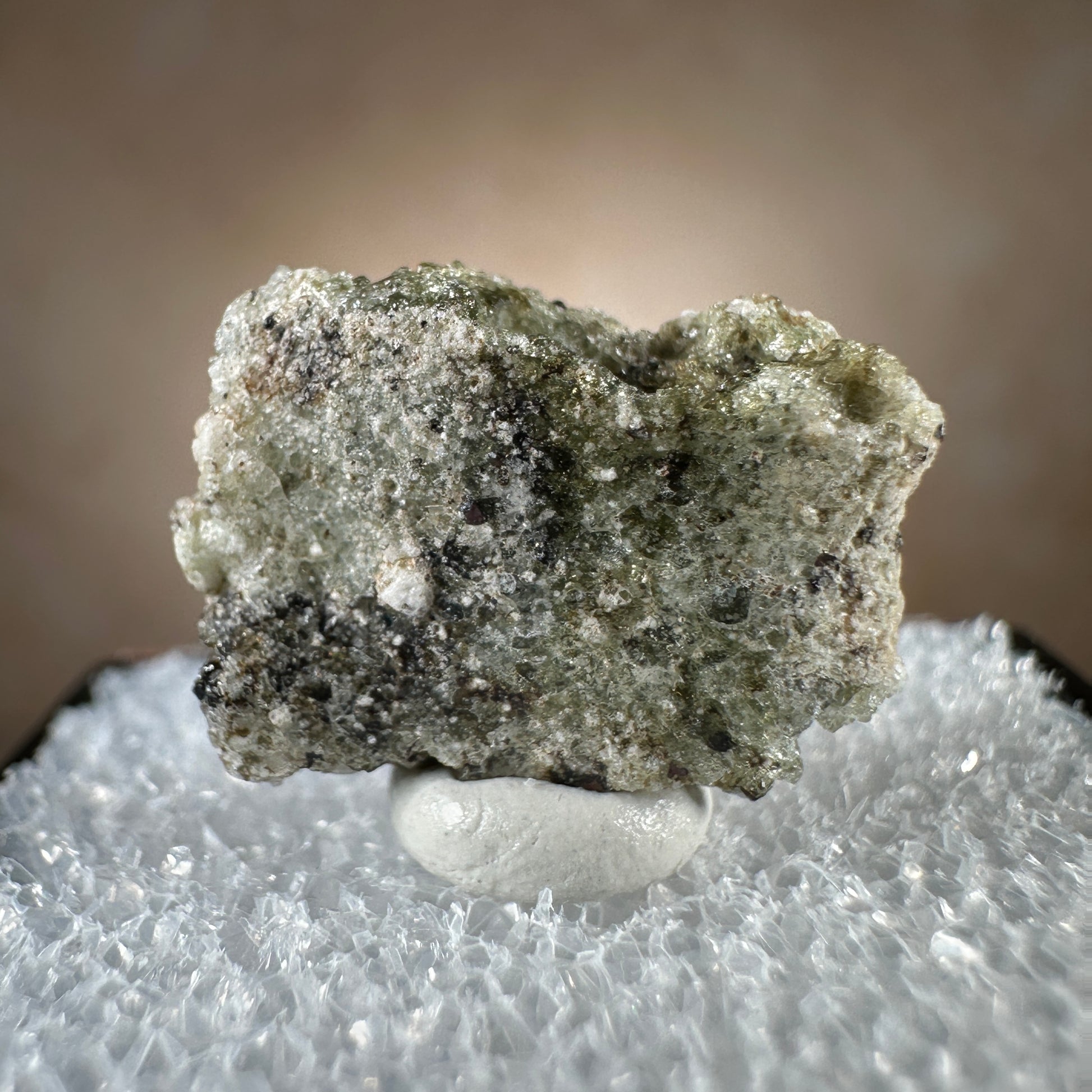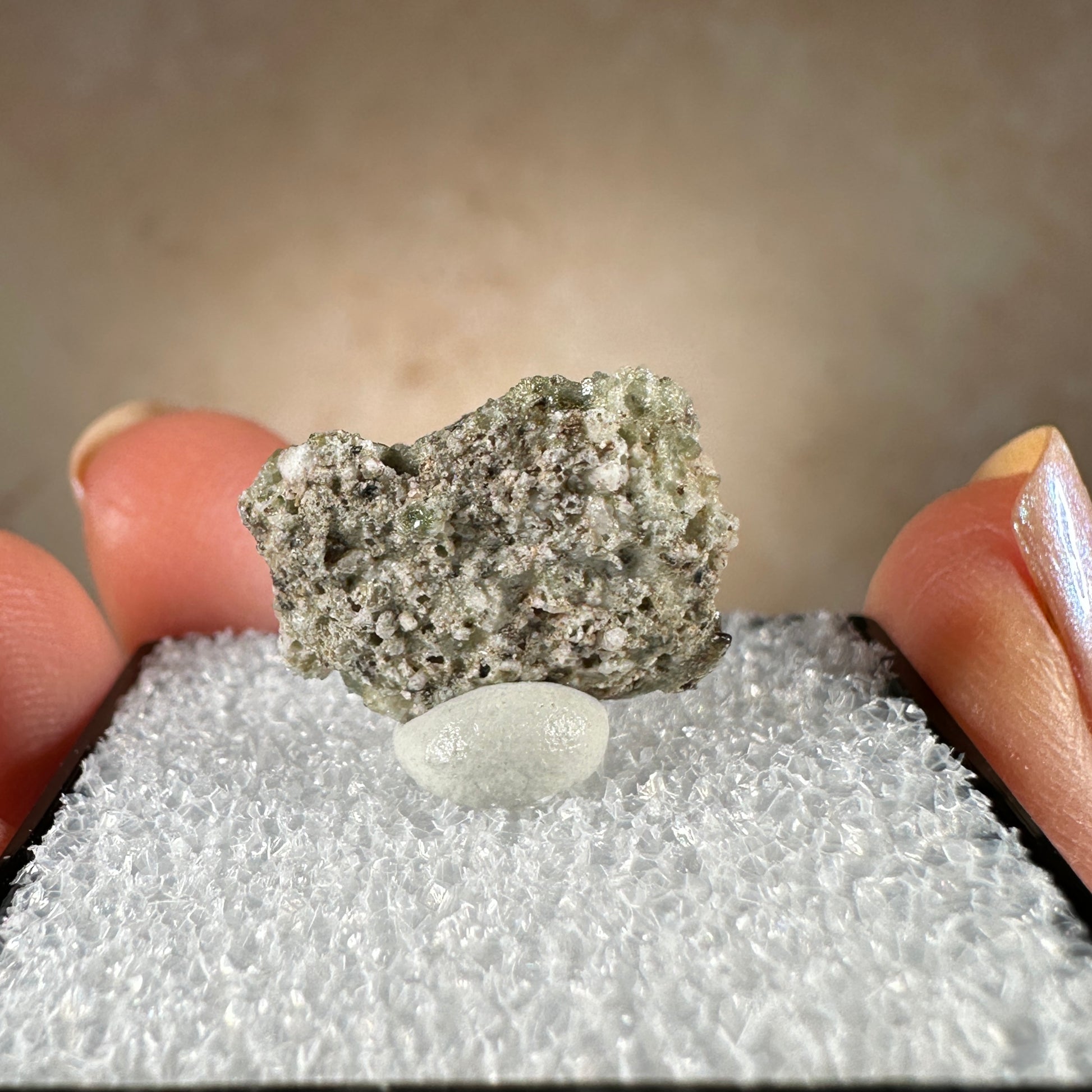 One interesting characteristic of Trinitite, is the sand grain textured bottom, with a smooth melted upper surface. This has lead many to believe these Trinitite pieces were actually formed from sand that was sucked up into the fireball of the explosion and later fell into the crater, rather than simply melting in place beneath the explosion. The Trinity test site is usually off limits, opening only 1-2 times a year for visitors. Our Trinitite is from a former rock shop owner who retired years ago, he had this Trinitite stored away for decades.